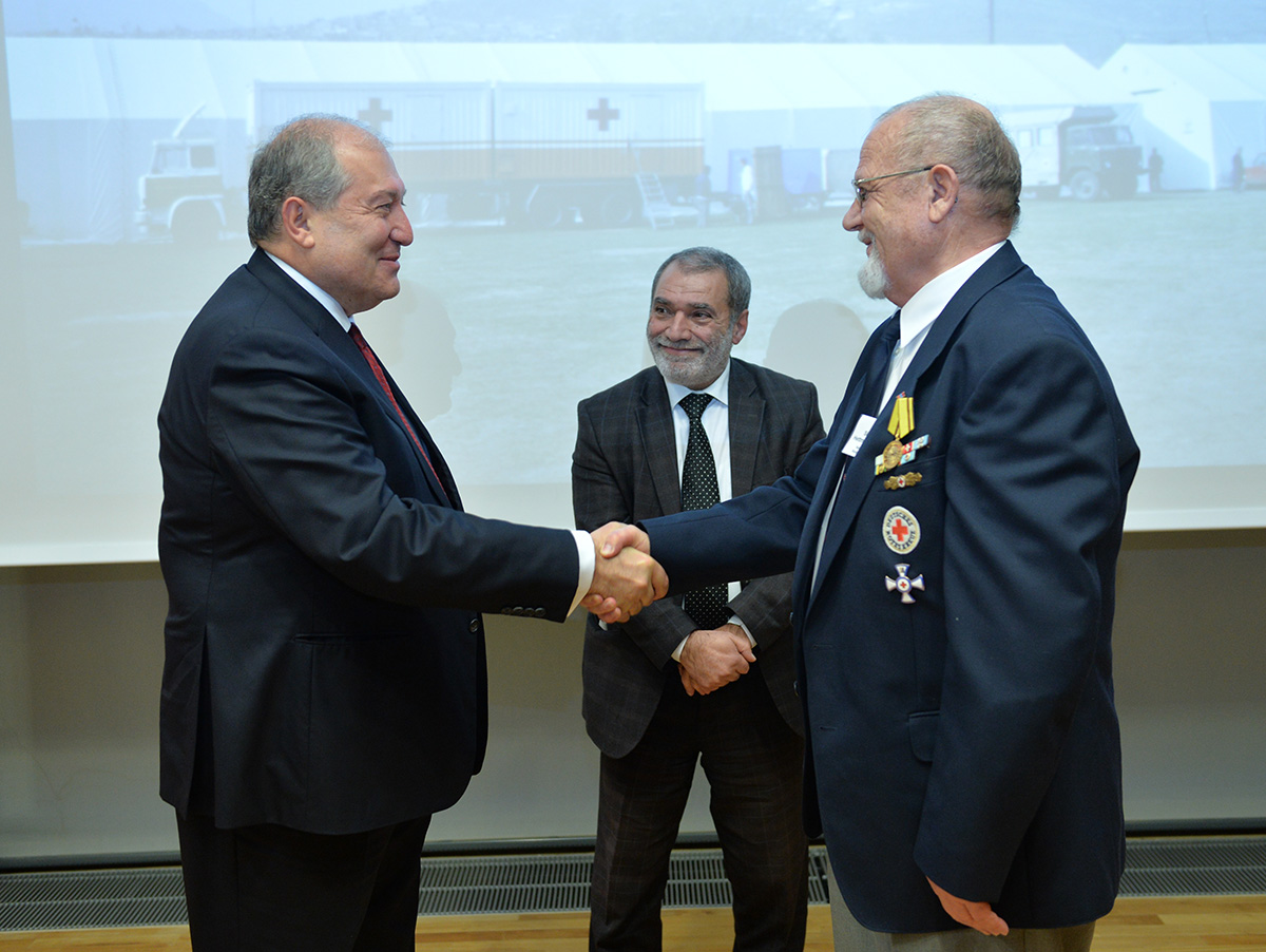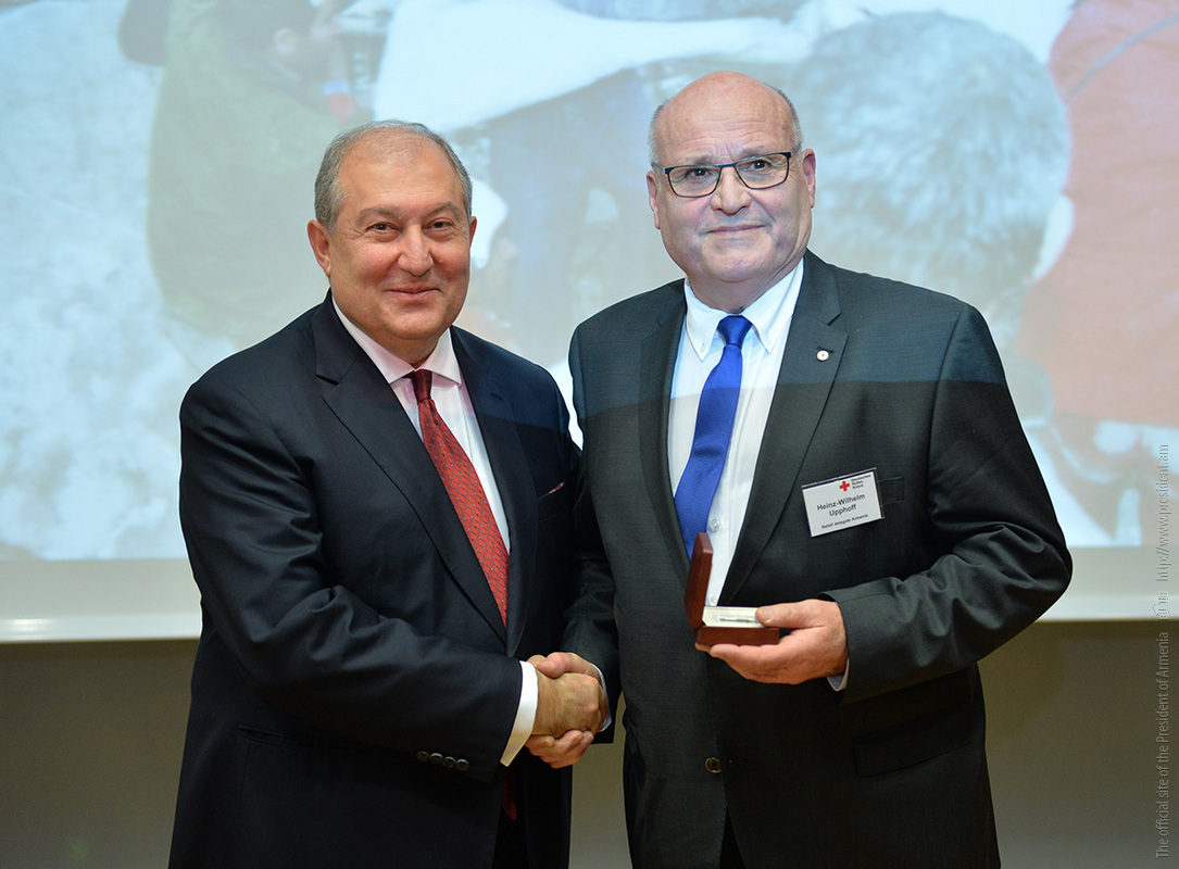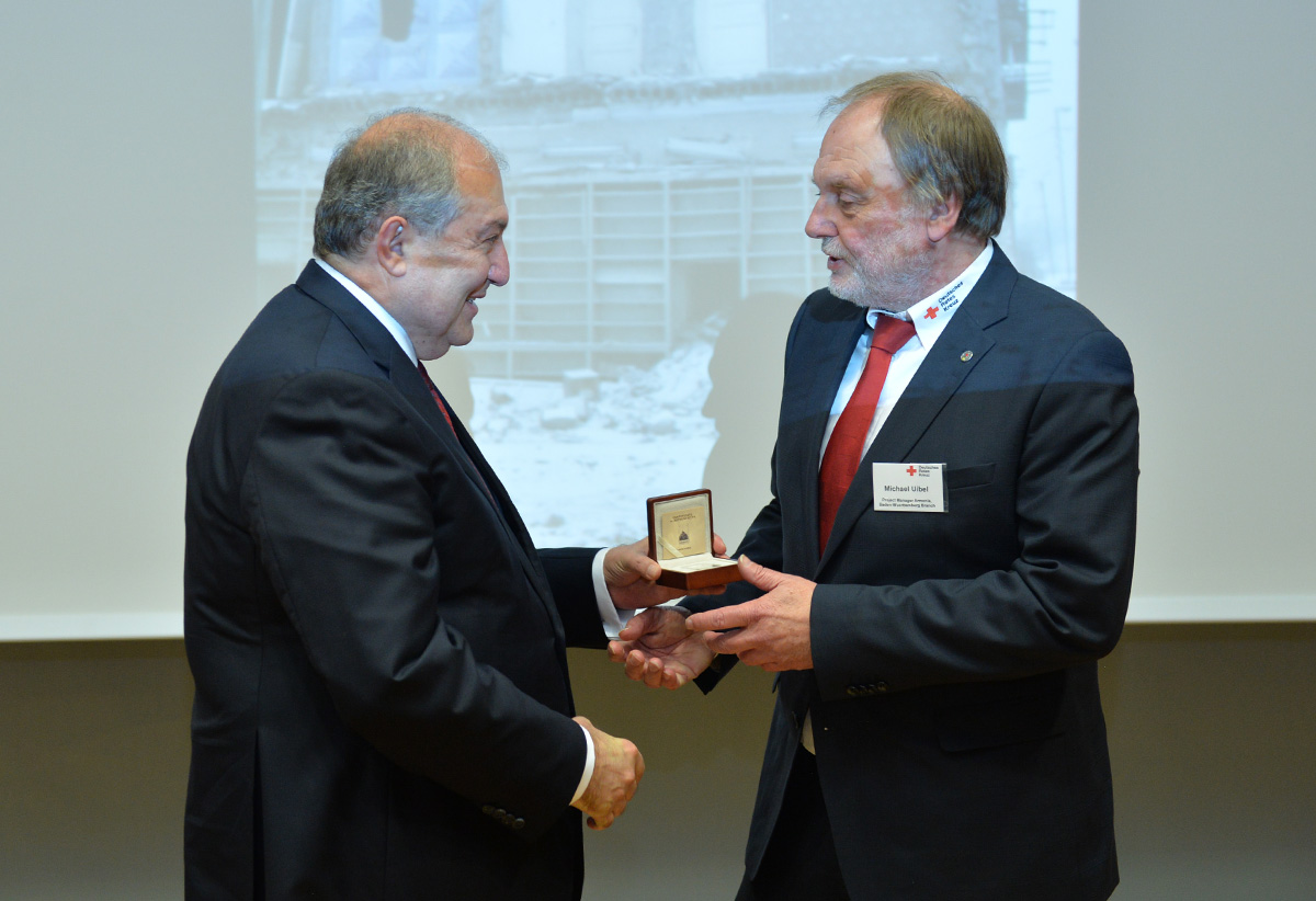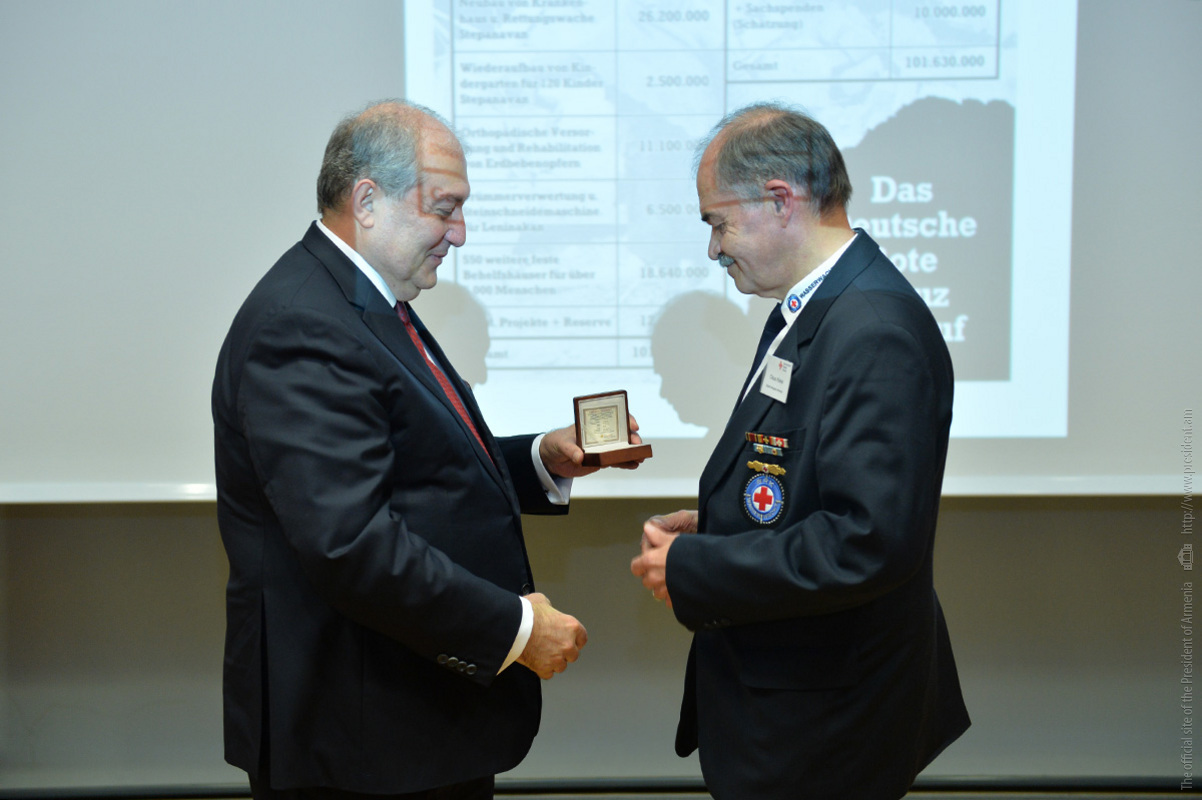 At the meeting, President Sarkissian handed RA state awards and souvenirs to a group of employees of the German Red Cross. For the practical participation and tireless humanitarian activities aimed at the mitigation of the devastating Spitak earthquake, Deputy Secretary General of the German Red Cross Johannes Richter was awarded the Mkhitar Heratsi medal, and German Red Cross representatives Zigrfid Hetmannschperger and Carl-Heinz Scheiden were awarded Medals of Gratitude.