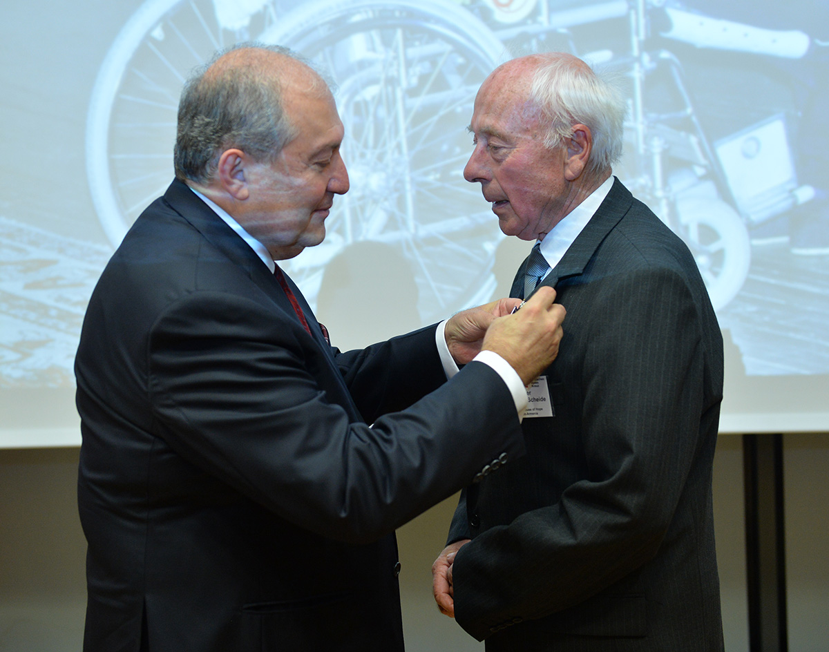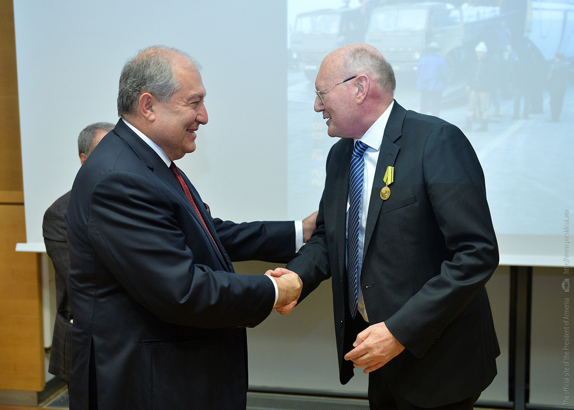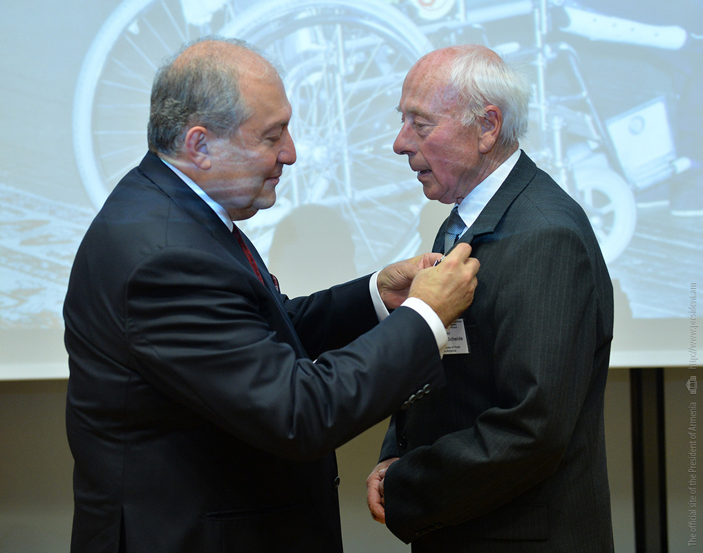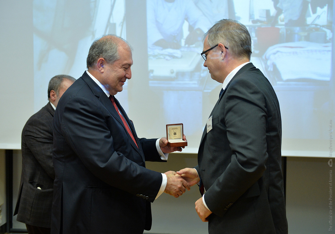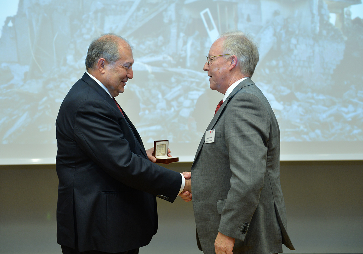 At the meeting, President Sarkissian handed RA state awards and souvenirs to a group of employees of the German Red Cross. For the practical participation and tireless humanitarian activities aimed at the mitigation of the devastating Spitak earthquake, Deputy Secretary General of the German Red Cross Johannes Richter was awarded the Mkhitar Heratsi medal, and German Red Cross representatives Zigrfid Hetmannschperger and Carl-Heinz Scheiden were awarded Medals of Gratitude.