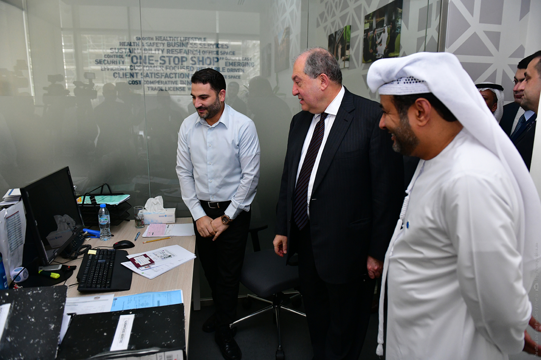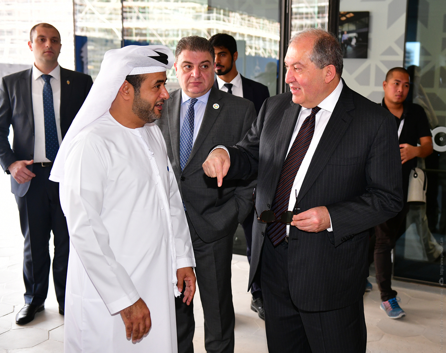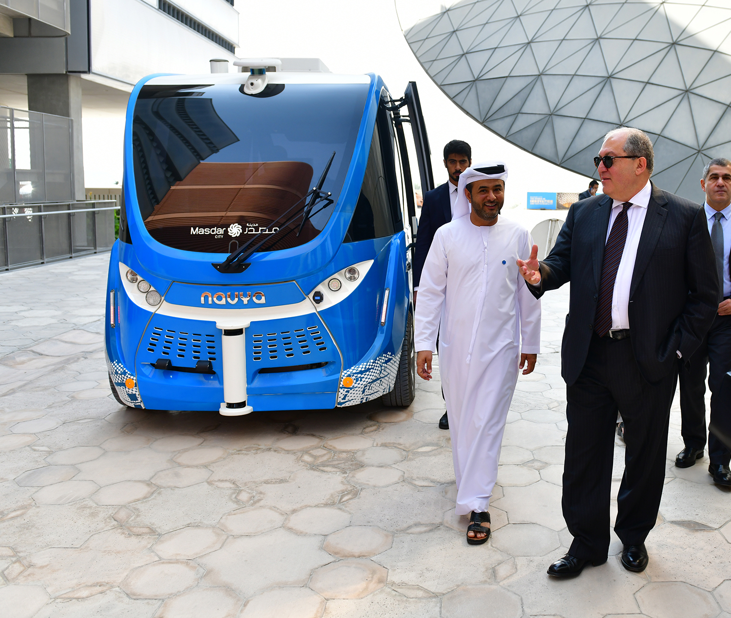 Accompanied by the Chief Executive Officer of Masdar City Yousef Ahmed Baselaib, President Sarkissian toured the territory of Masdar, inquired about the projects and programs of the innovative center, prospects for their implementation, and applied innovative ideas.