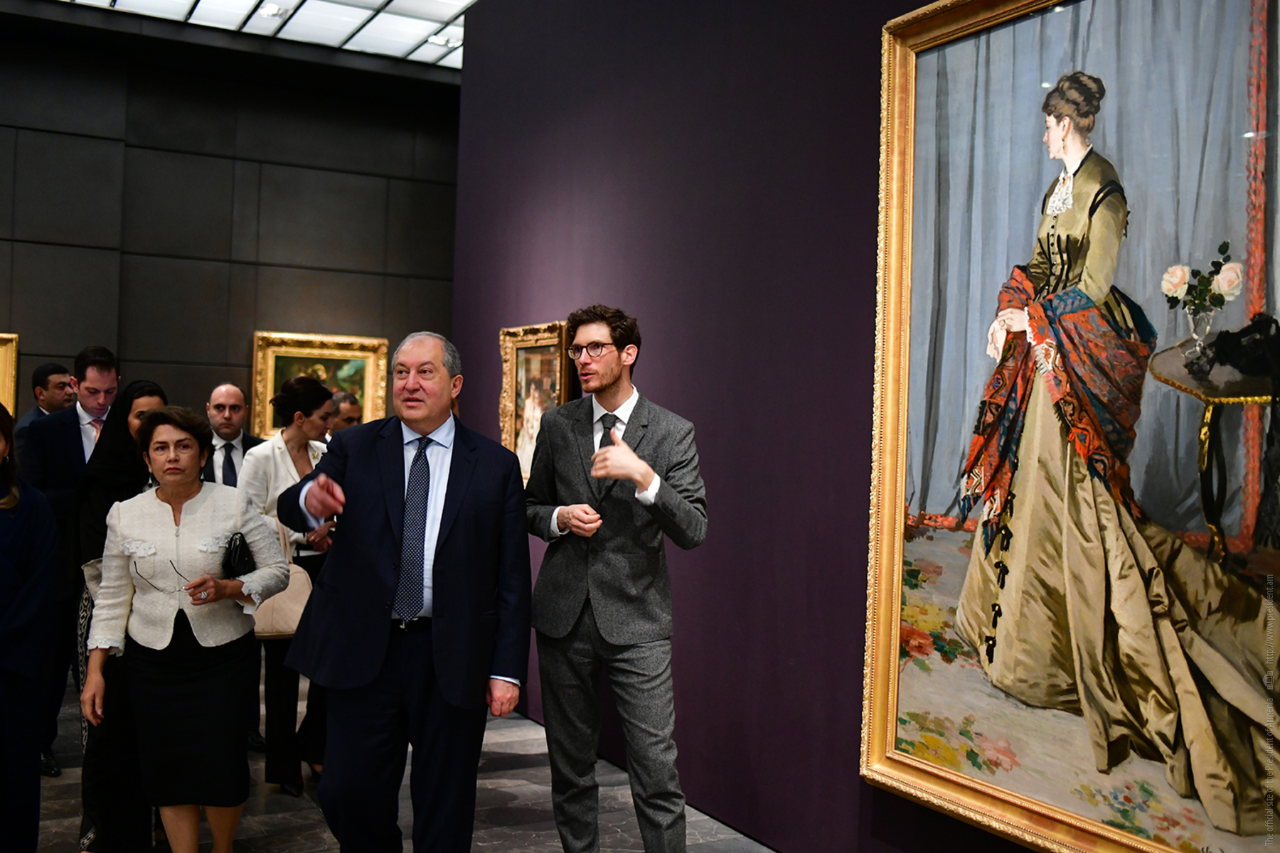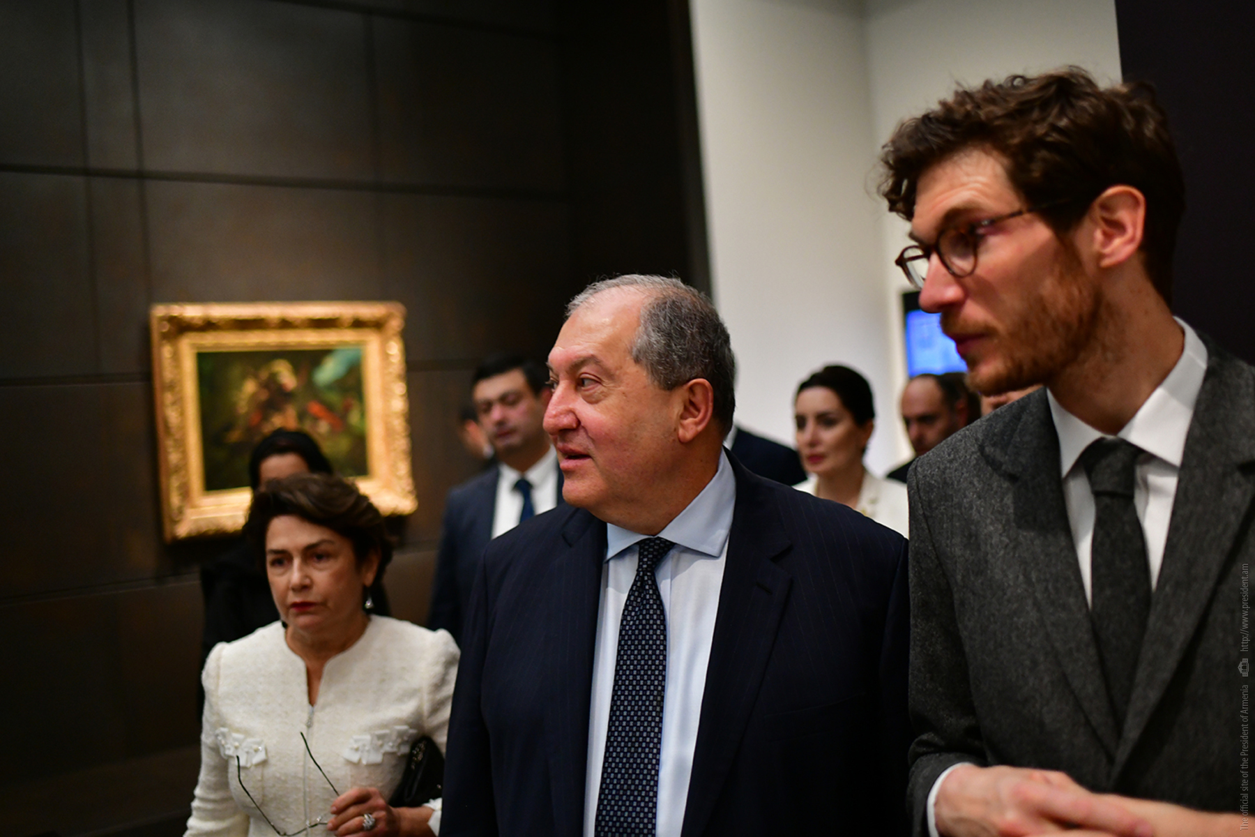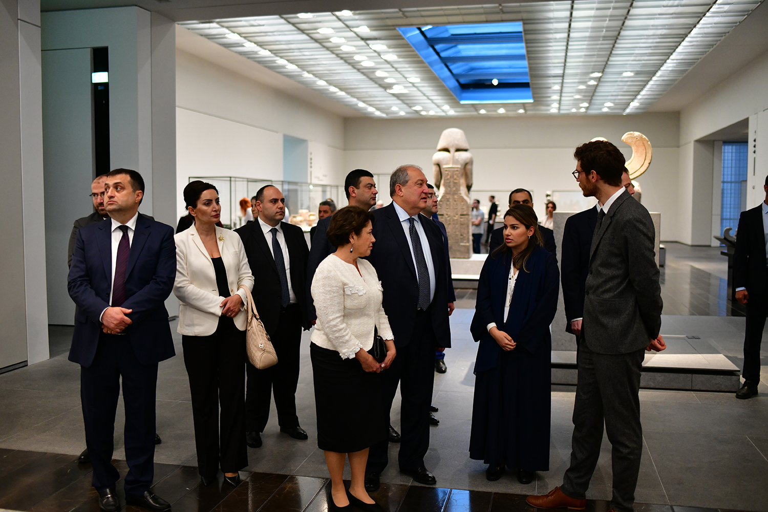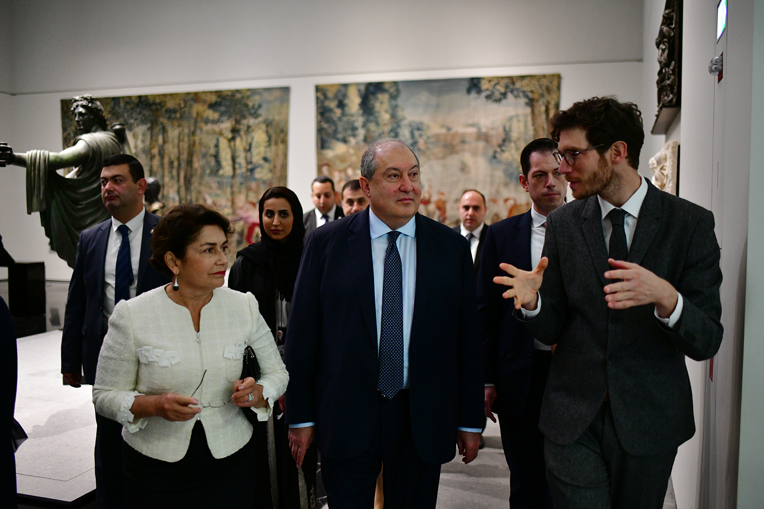 President Sarkissian and Mrs. Sarkissian toured the twelve halls of the museum where the history of world art is presented from the ancient times to modern days, observed the exhibits and artifacts. In the museum presented are also exhibits borrowed from Louvre, Centre Georges Pompidou, Versailles, Rodin Museum, and National Library of France.