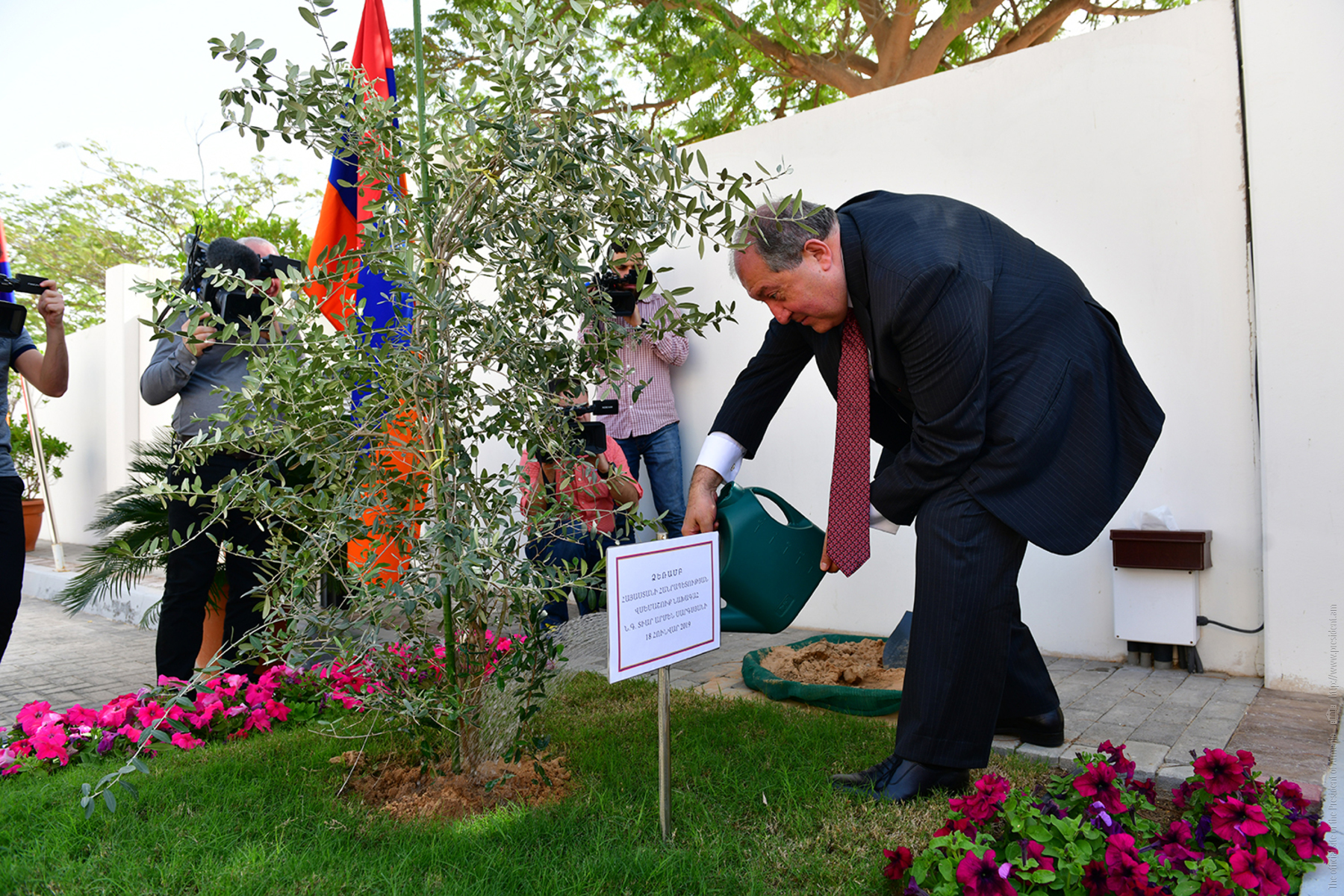 President Armen Sarkissian, who is in the United Arab Emirates on official visit, and Mrs. Nouneh Sarkissian visited today the Embassy of Armenia at the UAE. The President of Armenia planted a tree at the backyard of the Embassy.