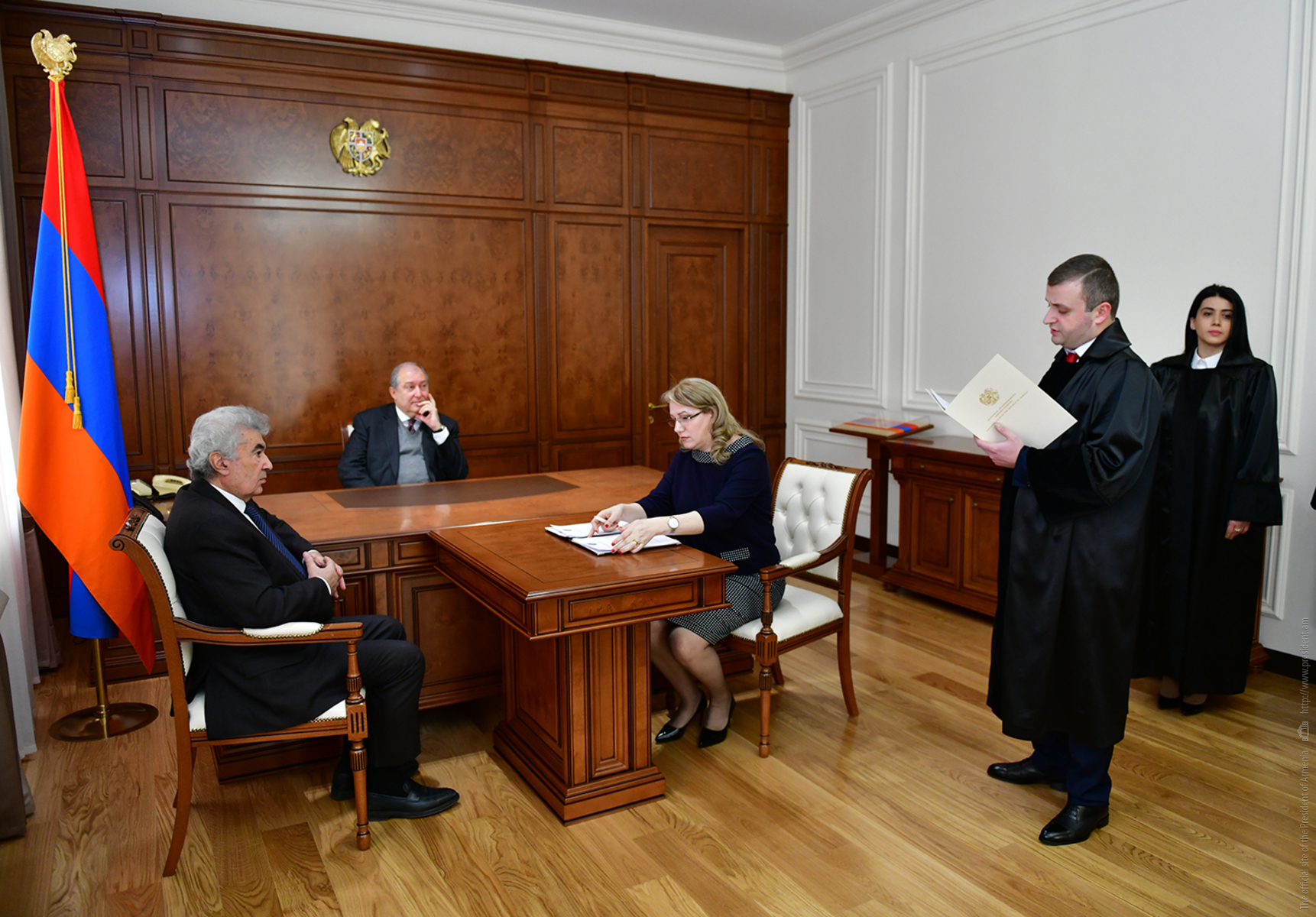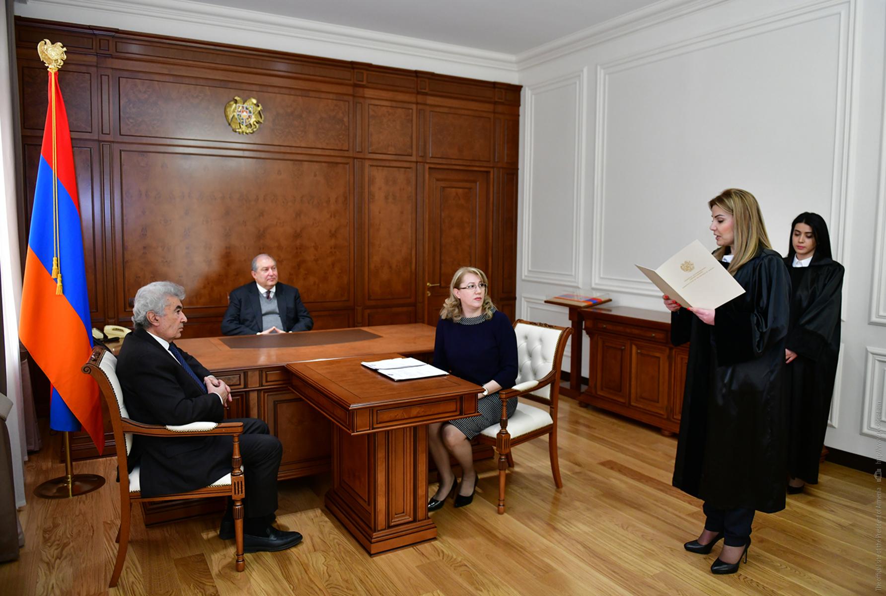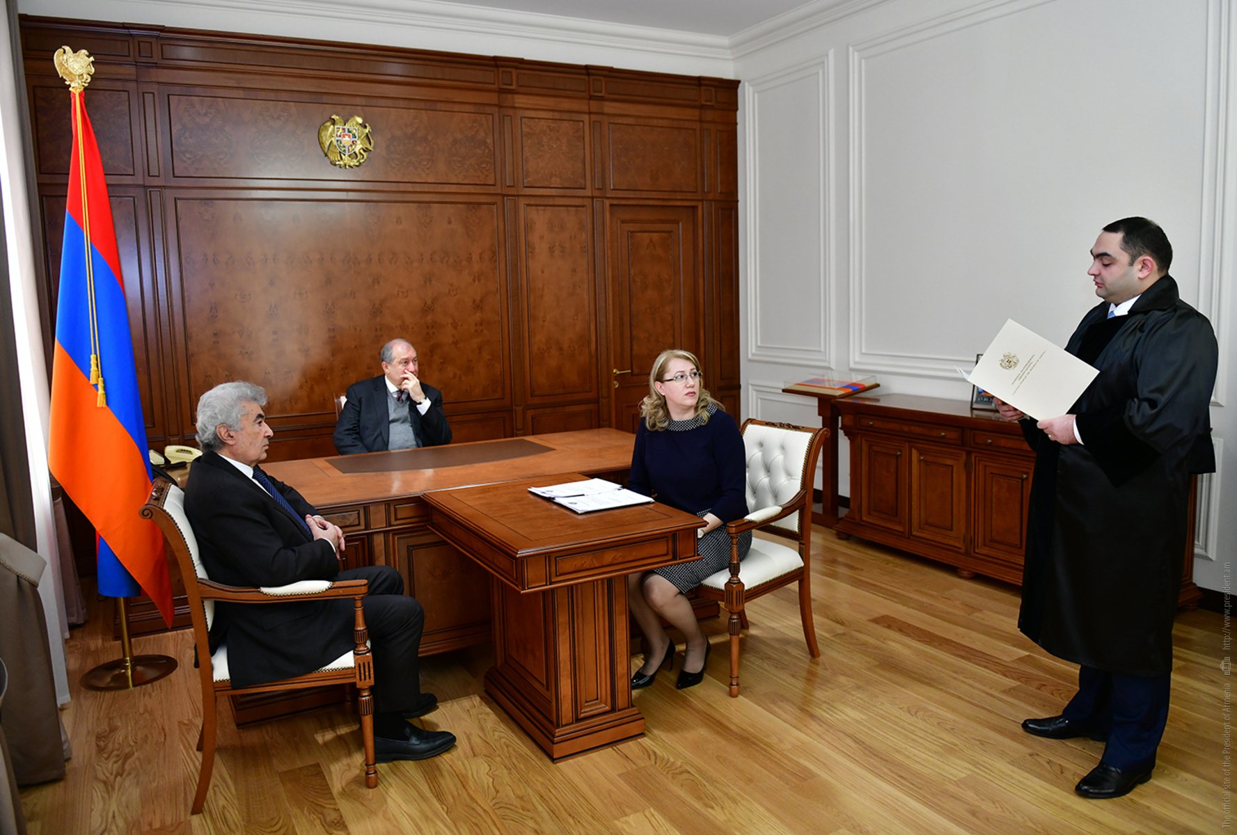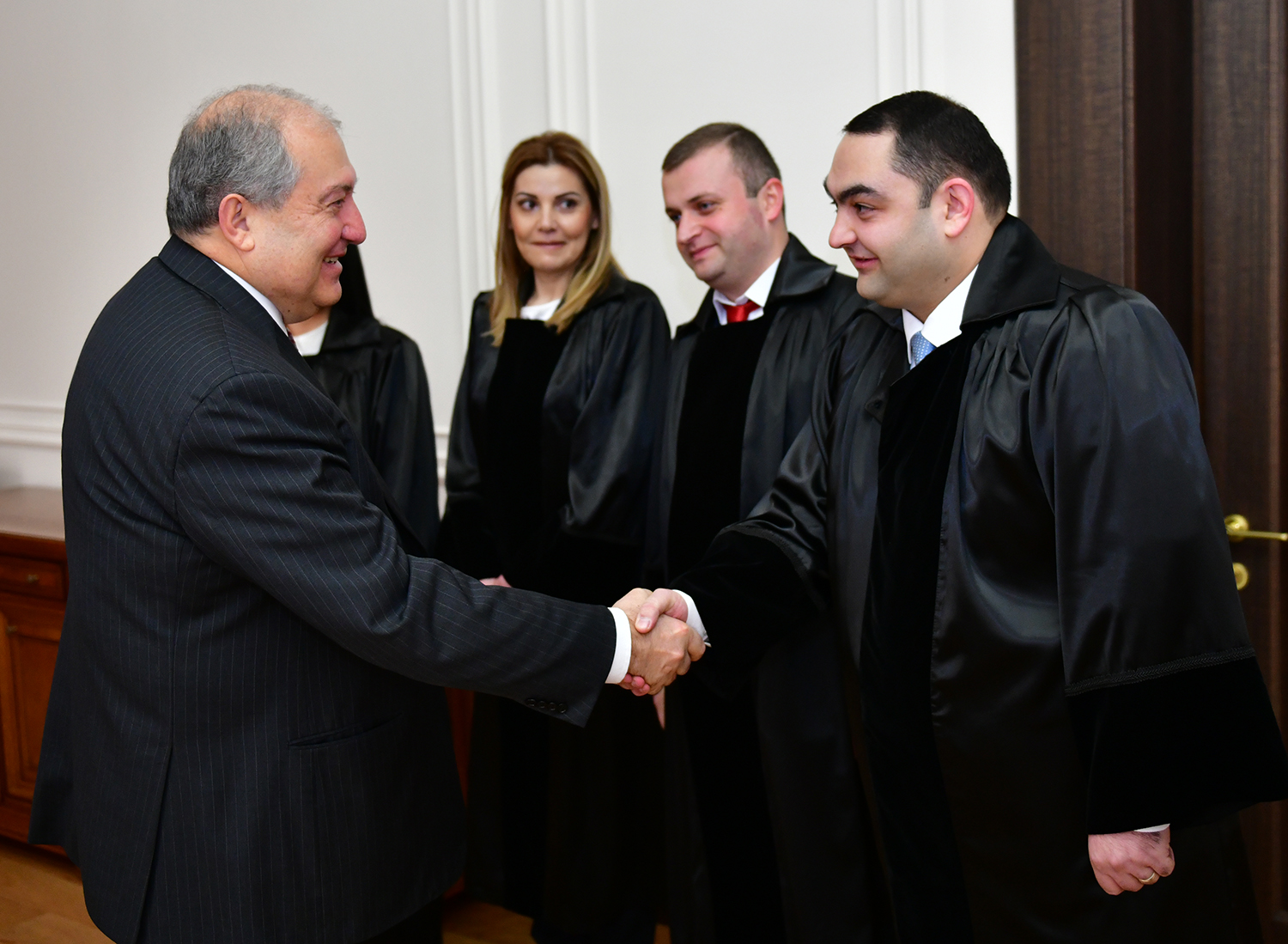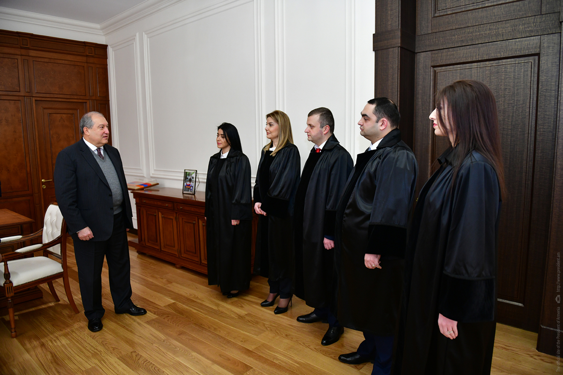 Oath-taking ceremony of the newly appointed judges took place at the Presidential Palace with the participation of the President of Armenia. Rubina Atoyan, a judge of the Court of General Jurisdiction of Synik marz, Diana Ghukeyan, a judge of the Court of General Jurisdiction of Lori marz, Edgar Karapetian, a judge of the Court of General Jurisdiction of Shirak marz, Gor Minassian, a judge of the Court of General Jurisdiction of Gegharkunik marz, and Liana Nerssissian, a judge of the Court of General Jurisdiction of Gegharkunik marz were sworn in as judges.