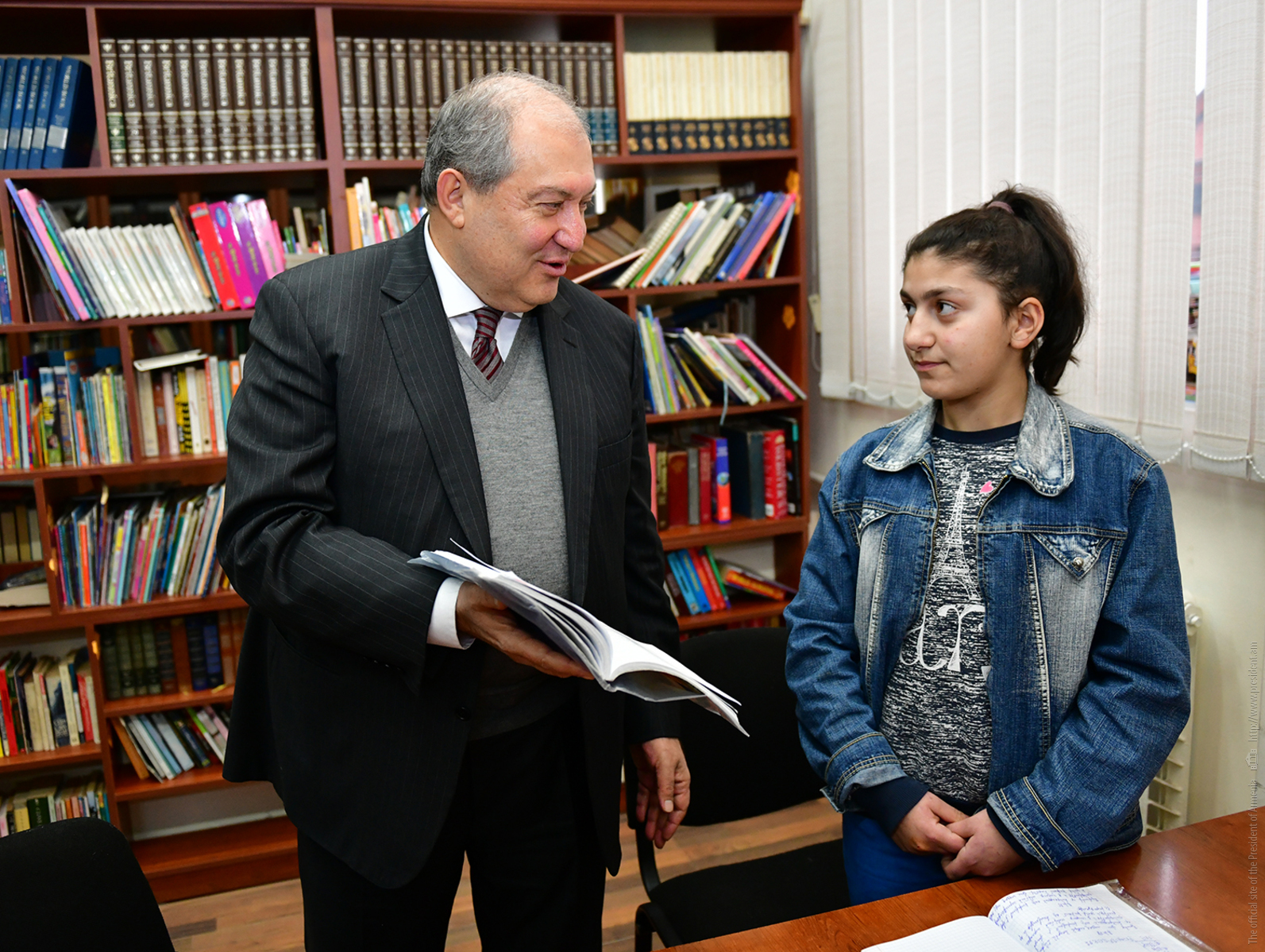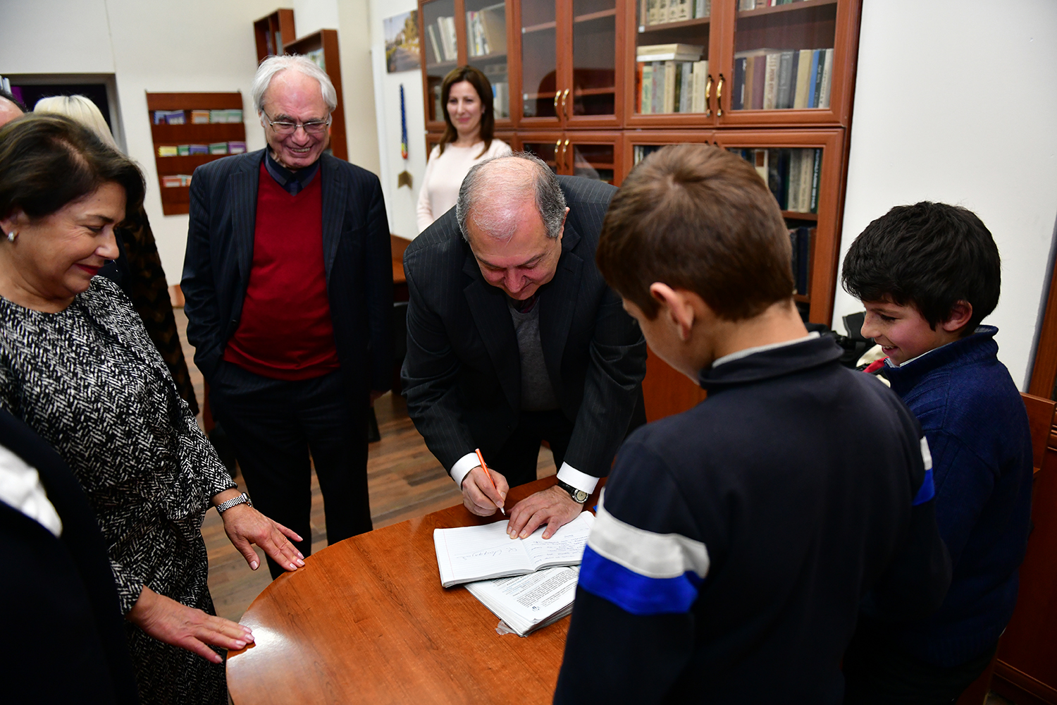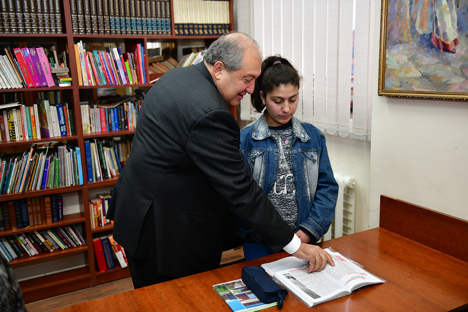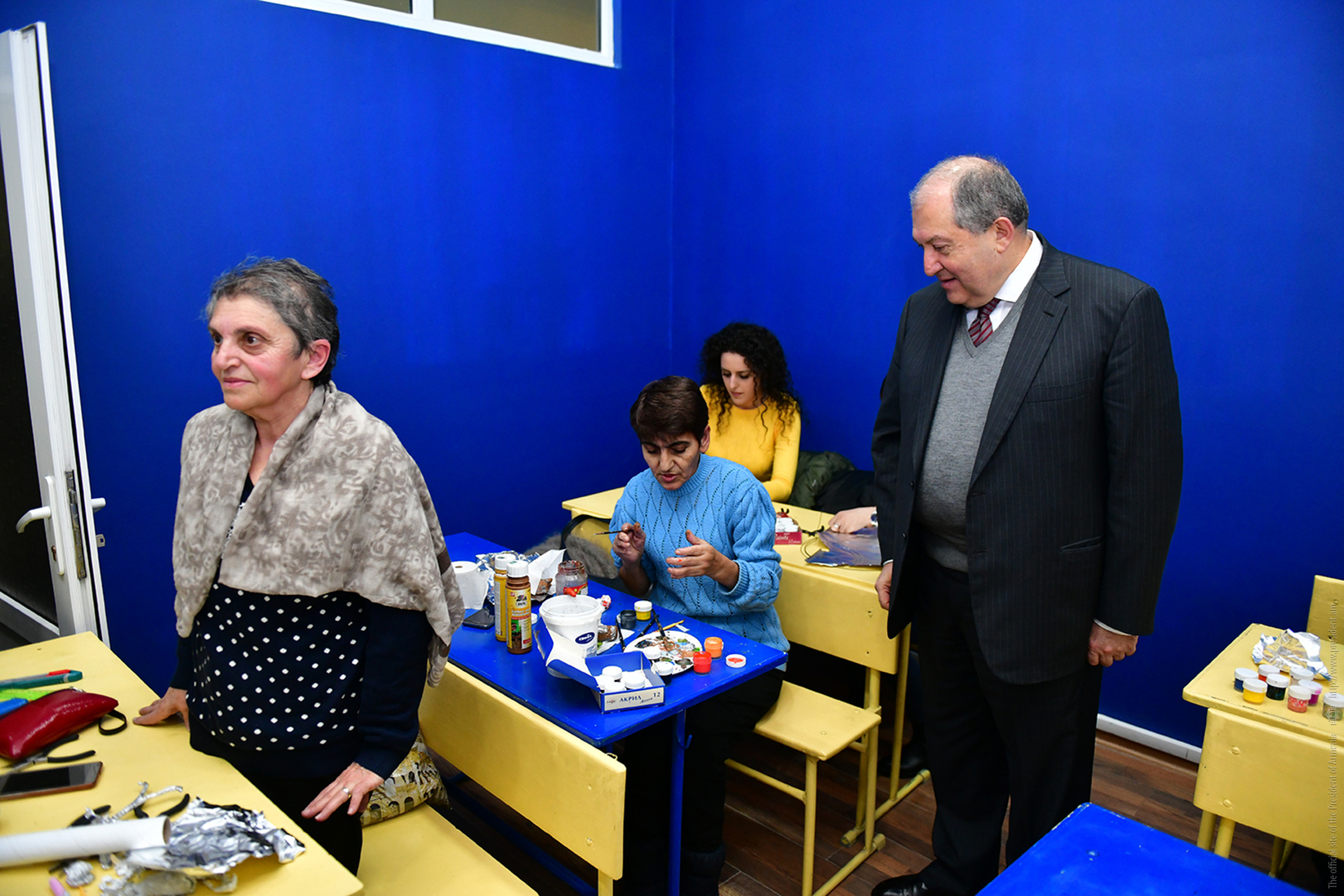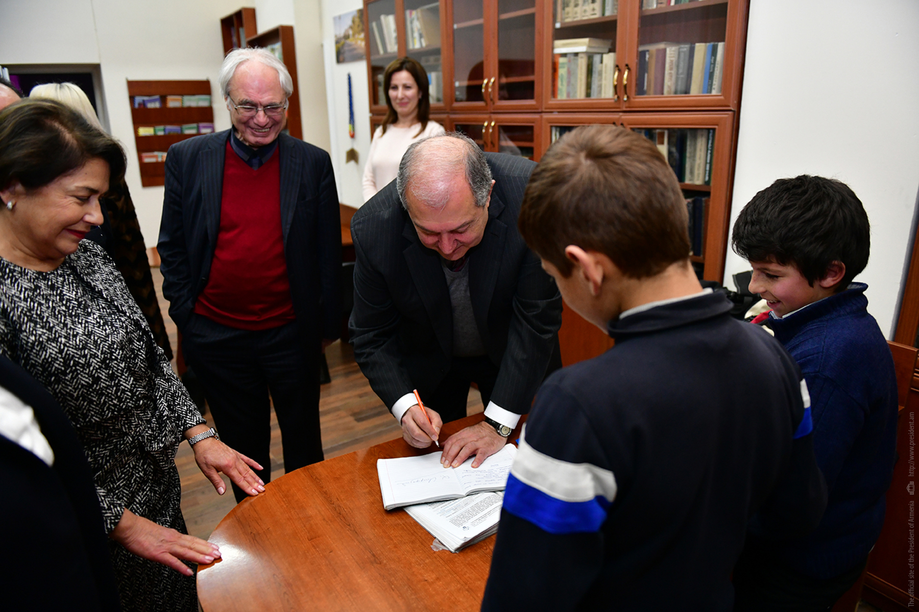 President Sarkissian and Mrs. Nouneh Sarkissian toured the center, had a cordial and warm conversation with the kids studying in painting, computer, language, and other classes. Children were impressed with the meeting and asked the President to sign in their exercise books.