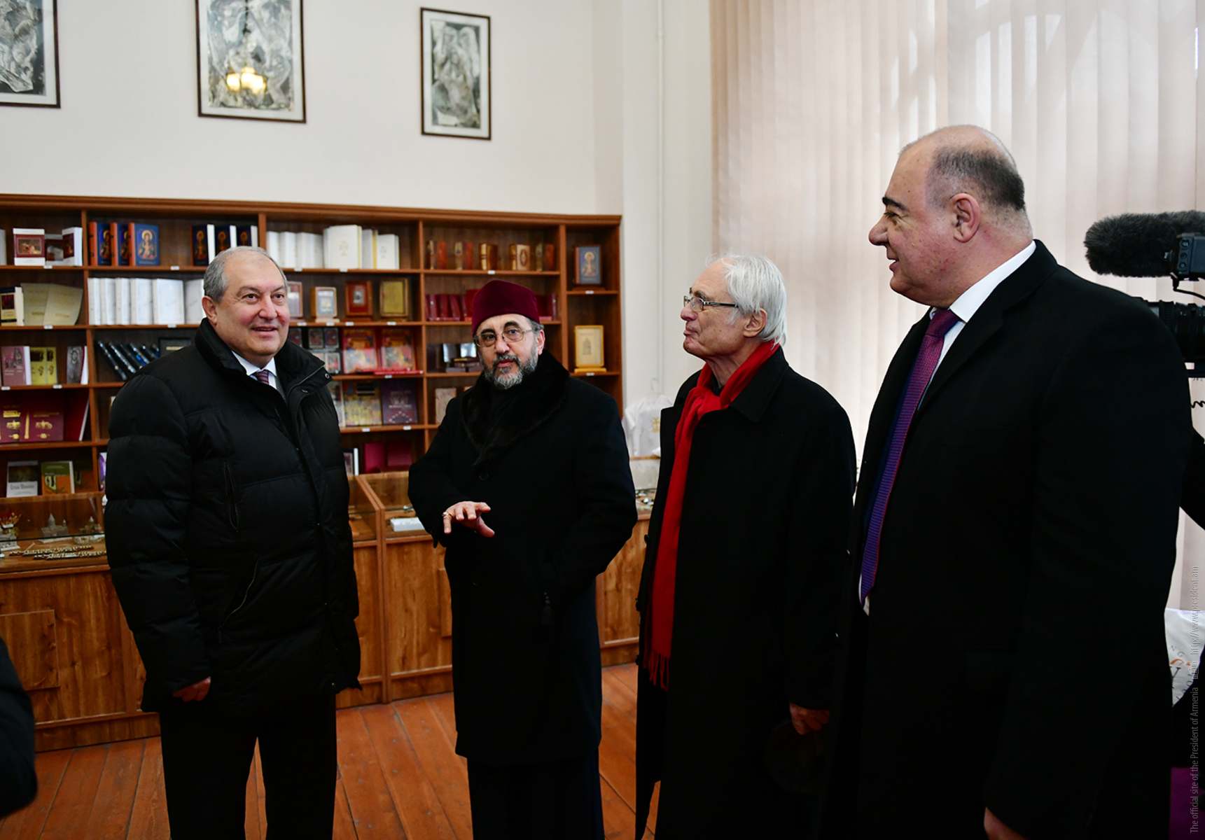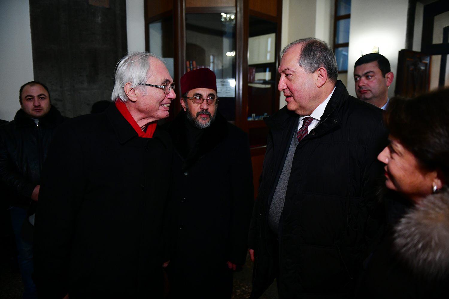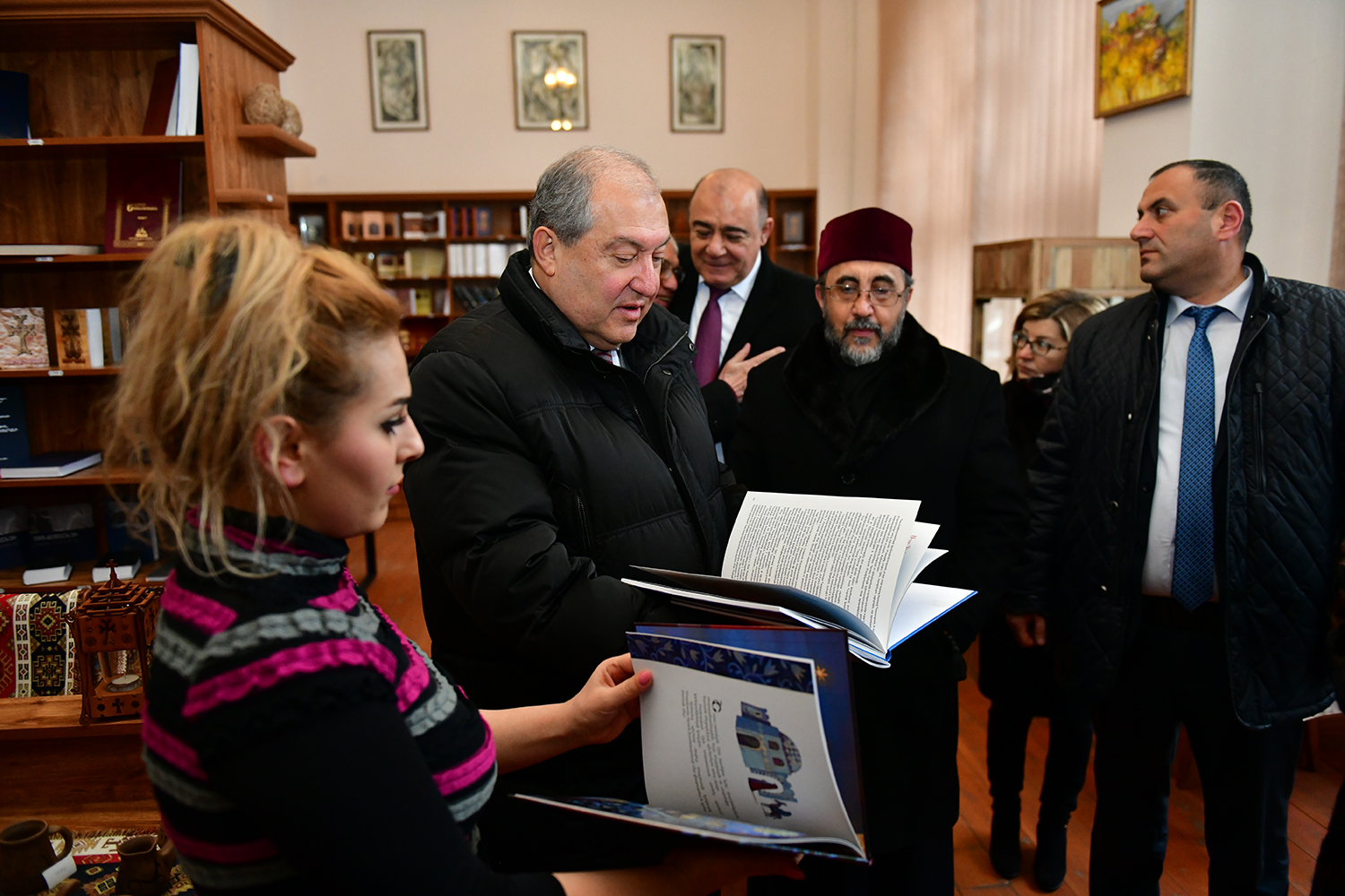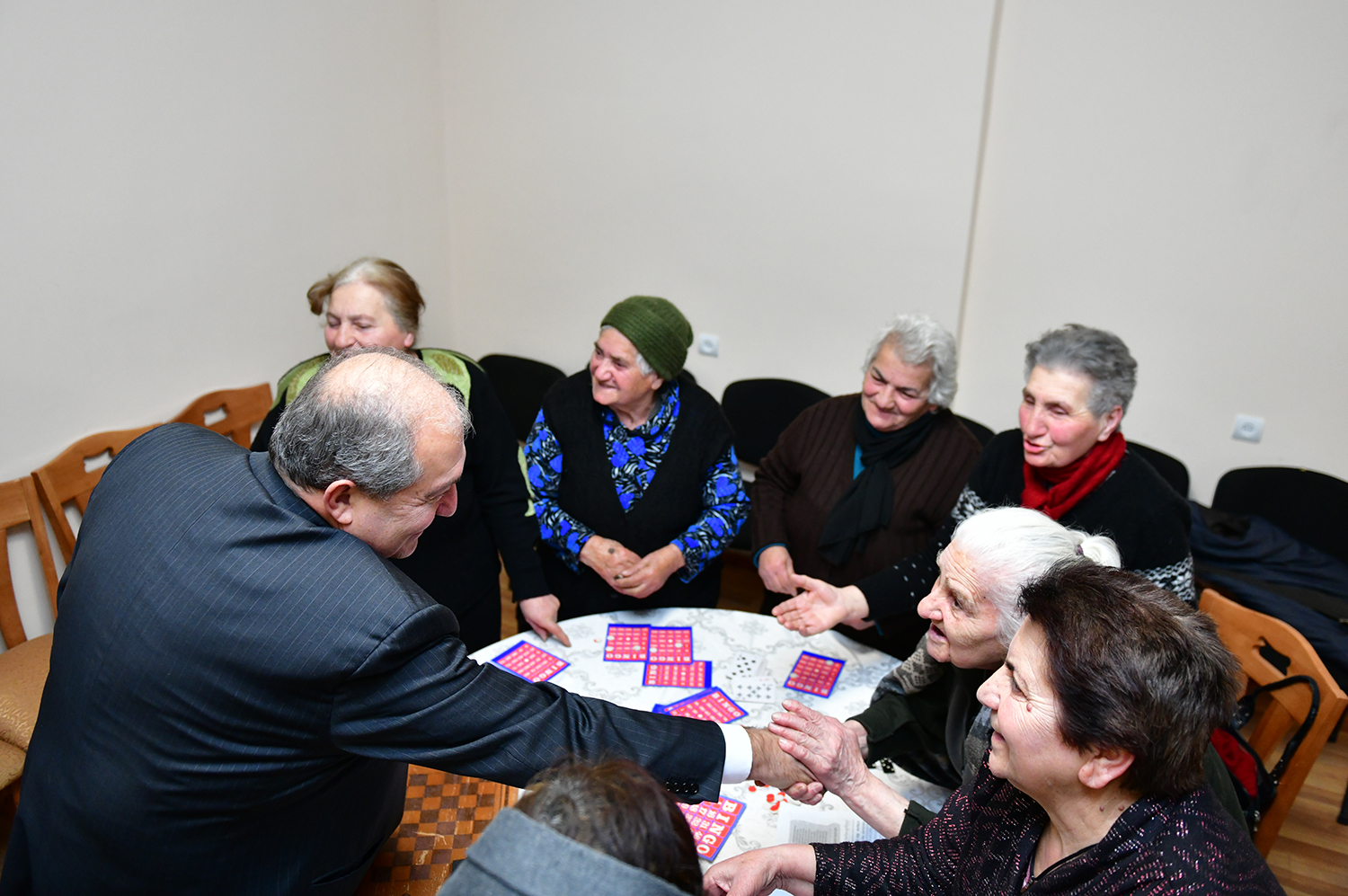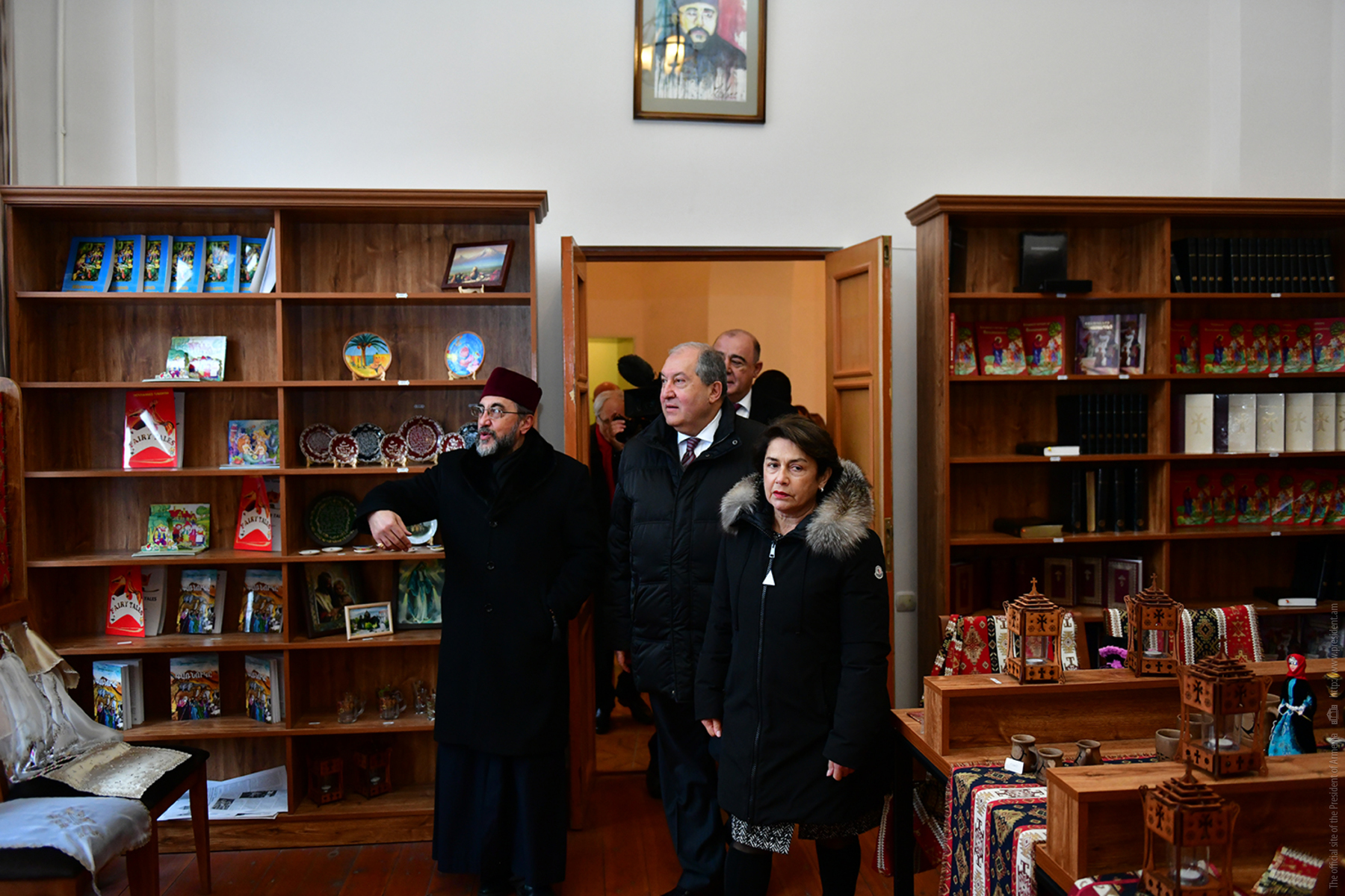 President’s and Mrs. Sarkissian’s this visit started with the candle lighting at the Holy Seven Wounds Church. Later, the President, his spouse, and the renowned composer, RA People’s Artist Tigran Mansurian were hosted by the Primate of the Shirak Diocese of the Armenian Apostolic Church Ter Michael Bishop Ajapahnian. He presented to the guests the activities of the Diocese and its structures. President Sarkissian inquired about the ongoing programs and forthcoming projects and expressed readiness to assist in their implementation. The social and educational center is one of the best proofs of the patriotic works of the Diocese. The former bathing house, which was used as a trush damp, has been fully renovated and furnished, becoming a place where all beneficiaries and visitors are welcome, where everyone will find his or her share of compassion. The center is carrying out educational, social, youth oriented, spiritual, and cultural programs.