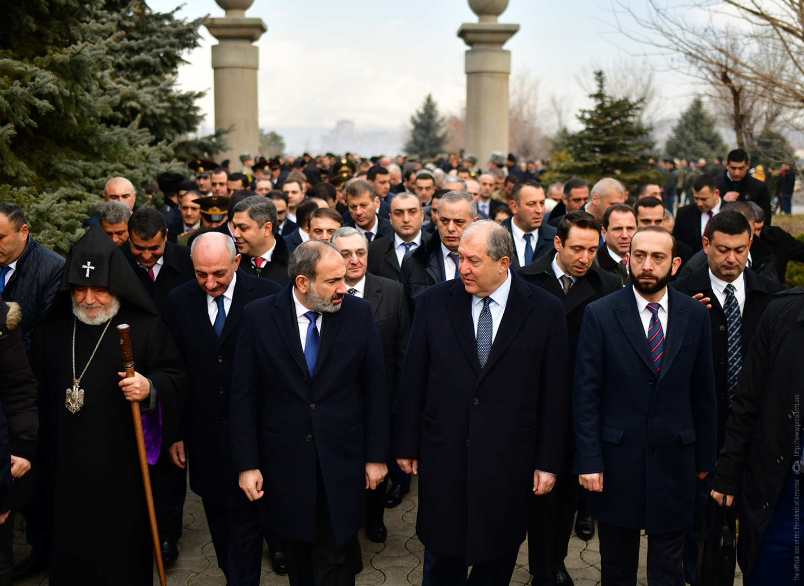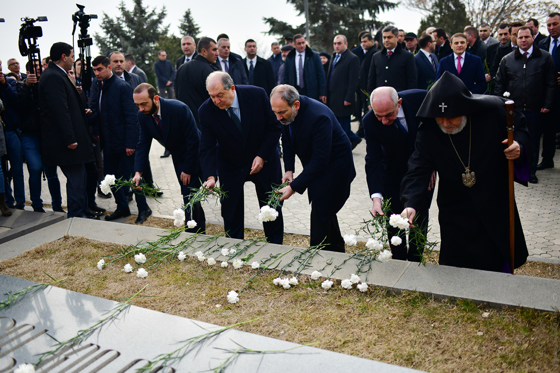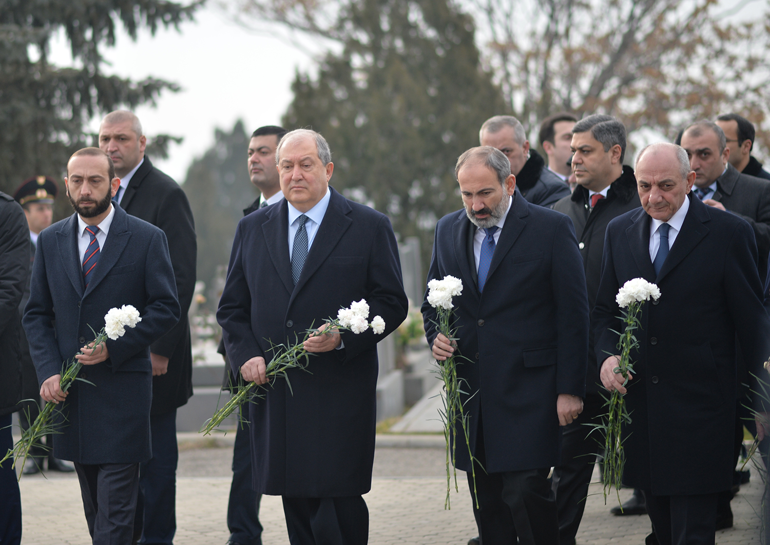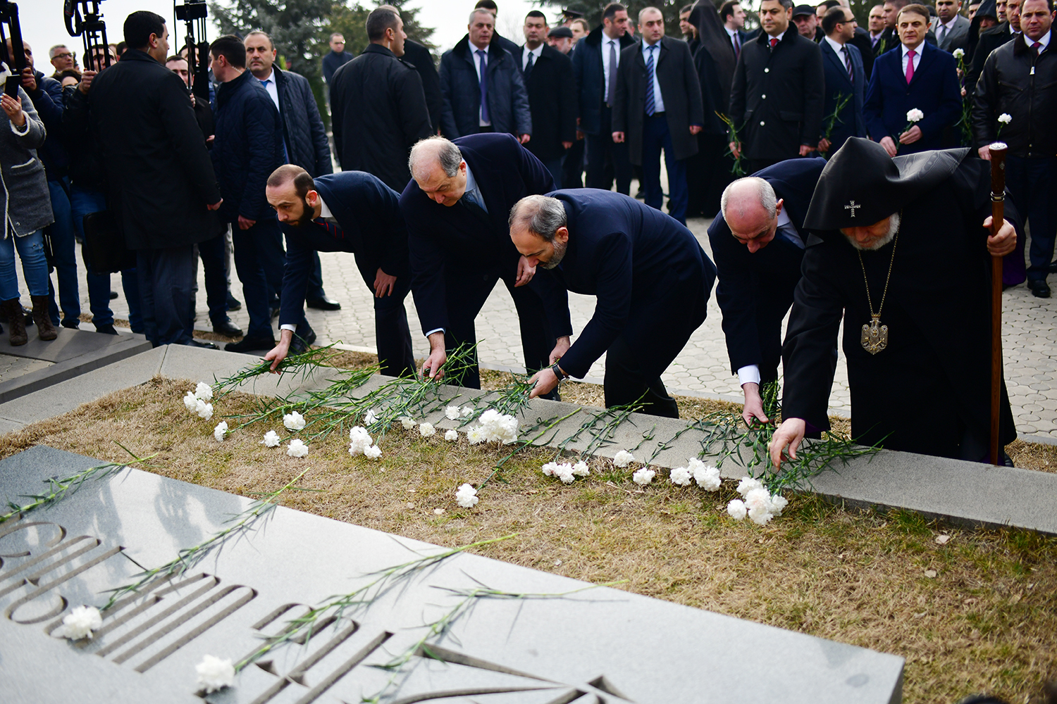 President Armen Sarkissian, accompanied by His Holiness Supreme Patriarch and Catholicos of All Armenians Garegin II, Prime Minister Nikol Pashinian, President of the Republic of Artsakh Bako Sahakian, Speaker of the Parliament Ararat Mirzoyan, members of the National Security Council, the highest leadership of the Ministry of Defense and Armed Forces visited today the Erablur military pantheon and paid tribute to the memory of the sons of the Armenian nation who gave their lives for the Fatherland’s independence.