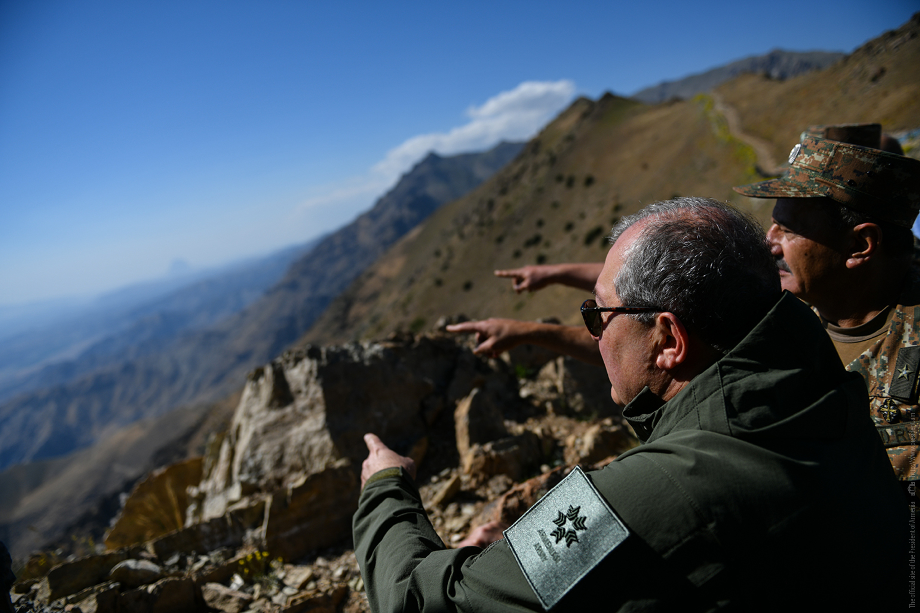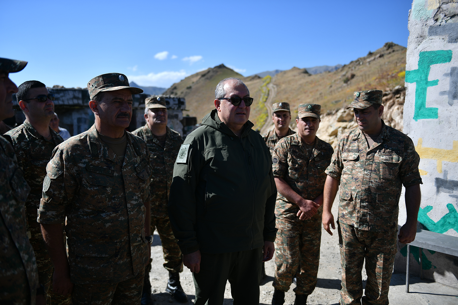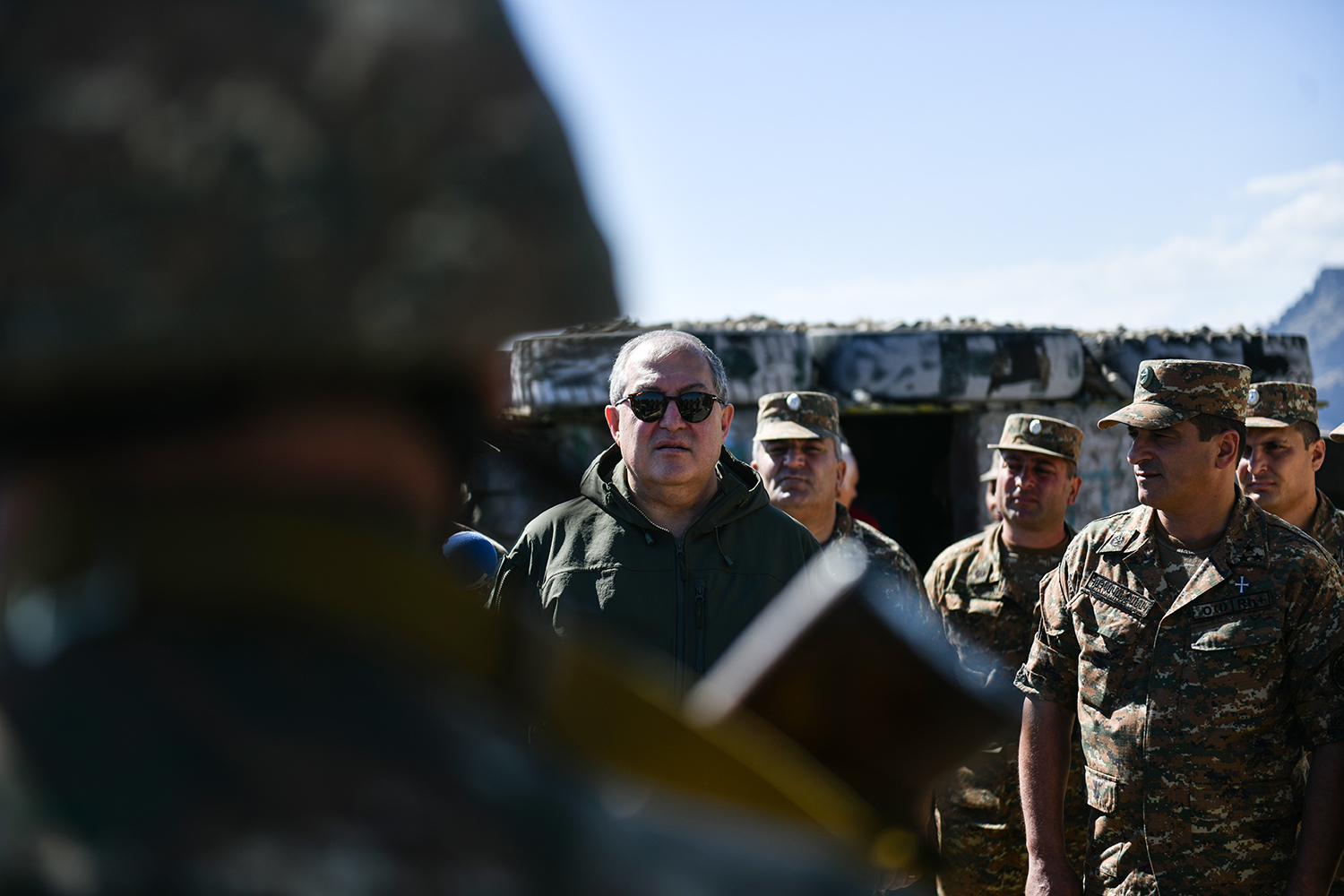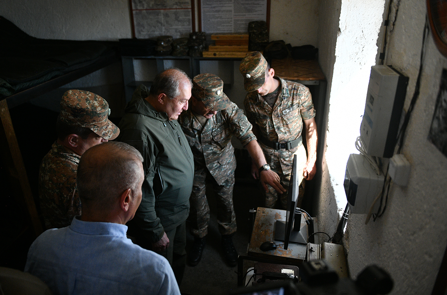 President Armen Sarkissian, who is in Syunik marz on a working visit, was today at the combat position of the N military division of the RA Defense Army. The President met with the troops and officers on duty, toured the position, familiarized with the service conditions, and combat readiness of the unit.