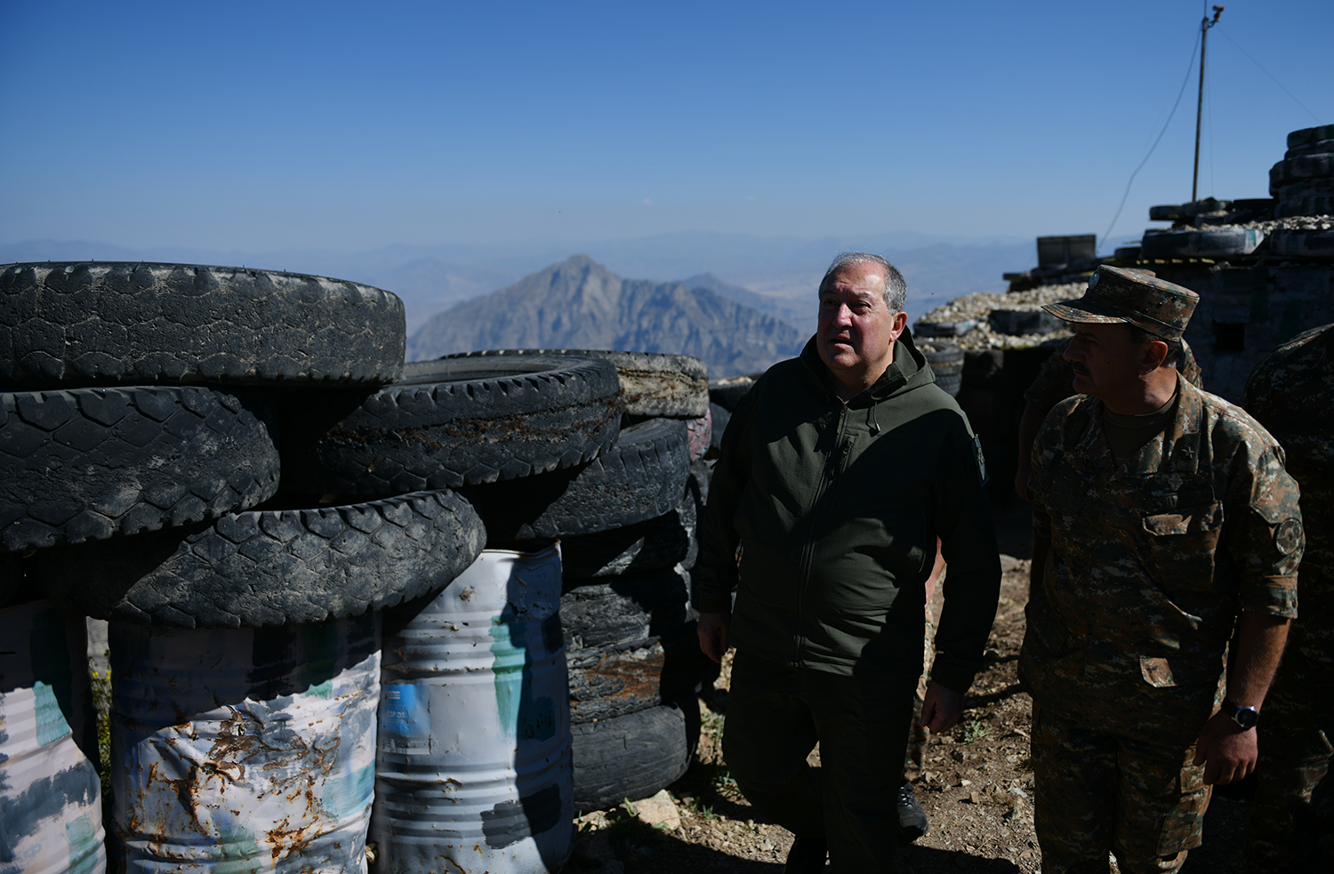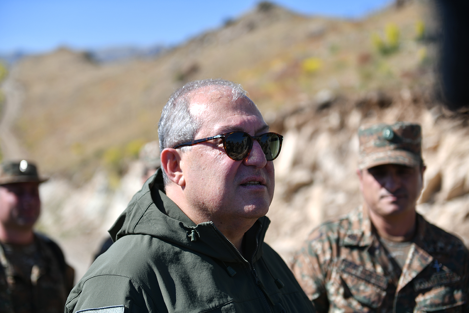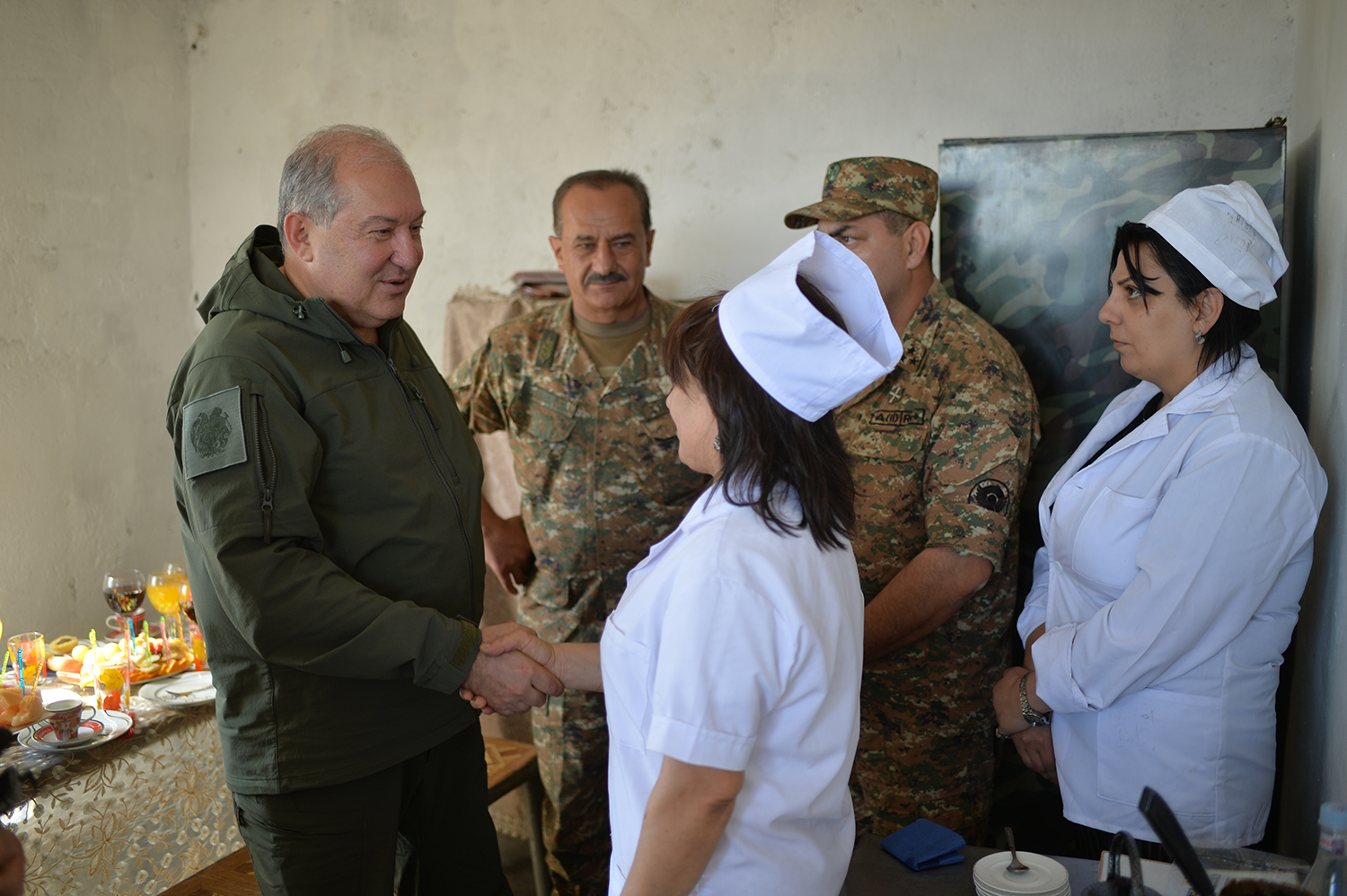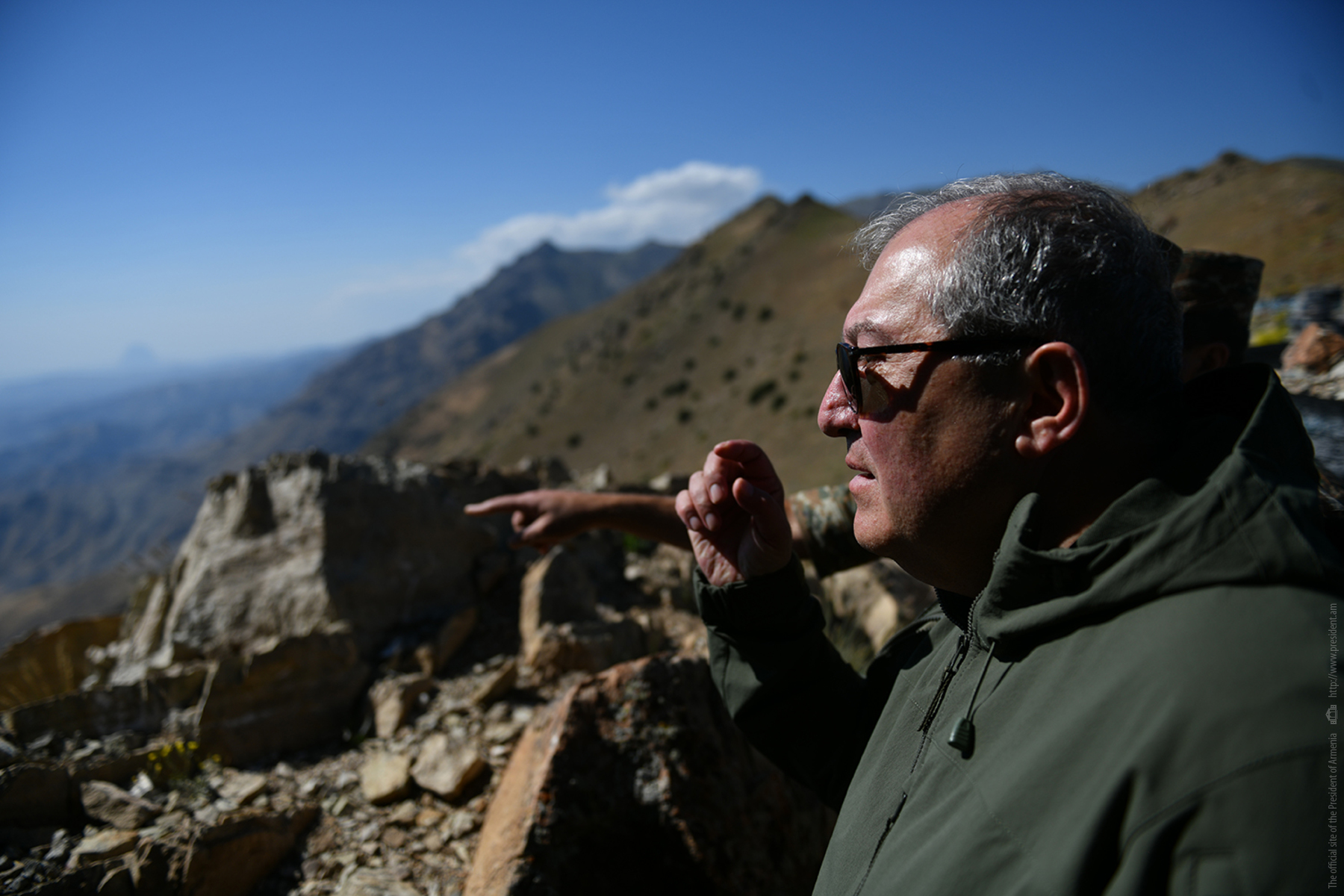 President Armen Sarkissian, who is in Syunik marz on a working visit, was today at the combat position of the N military division of the RA Defense Army. The President met with the troops and officers on duty, toured the position, familiarized with the service conditions, and combat readiness of the unit.