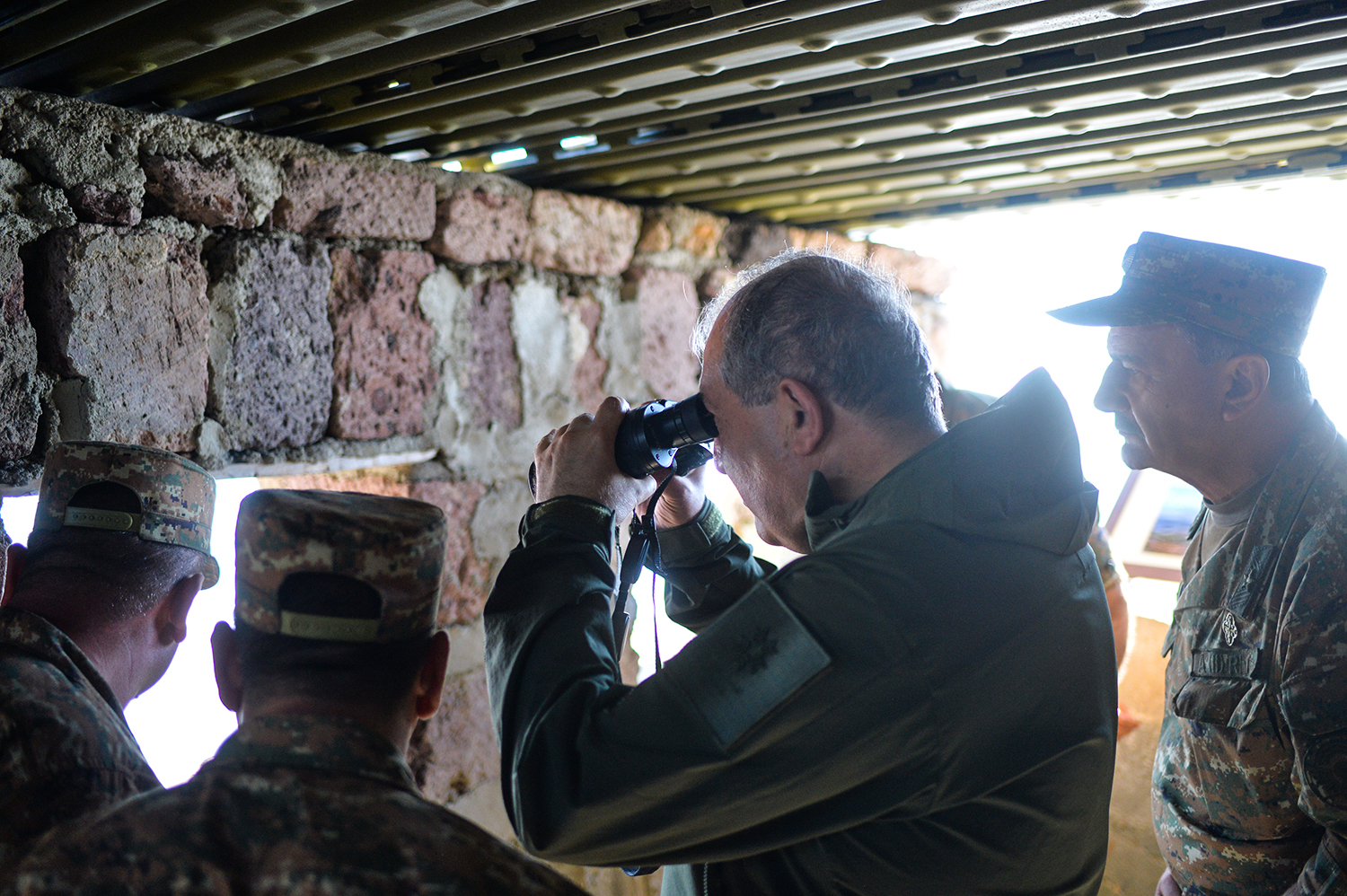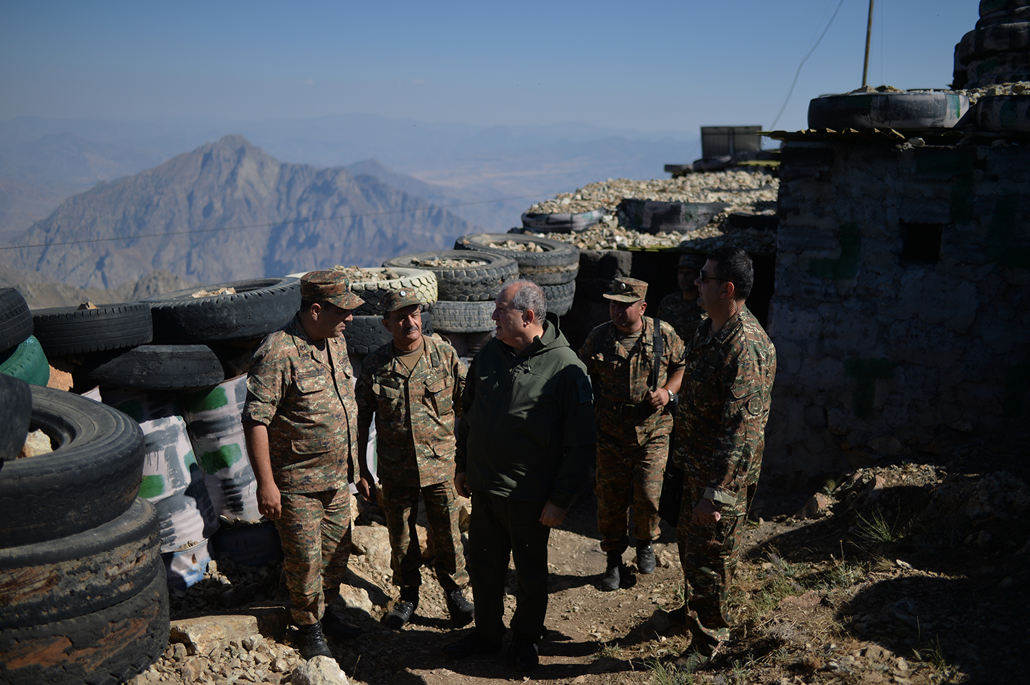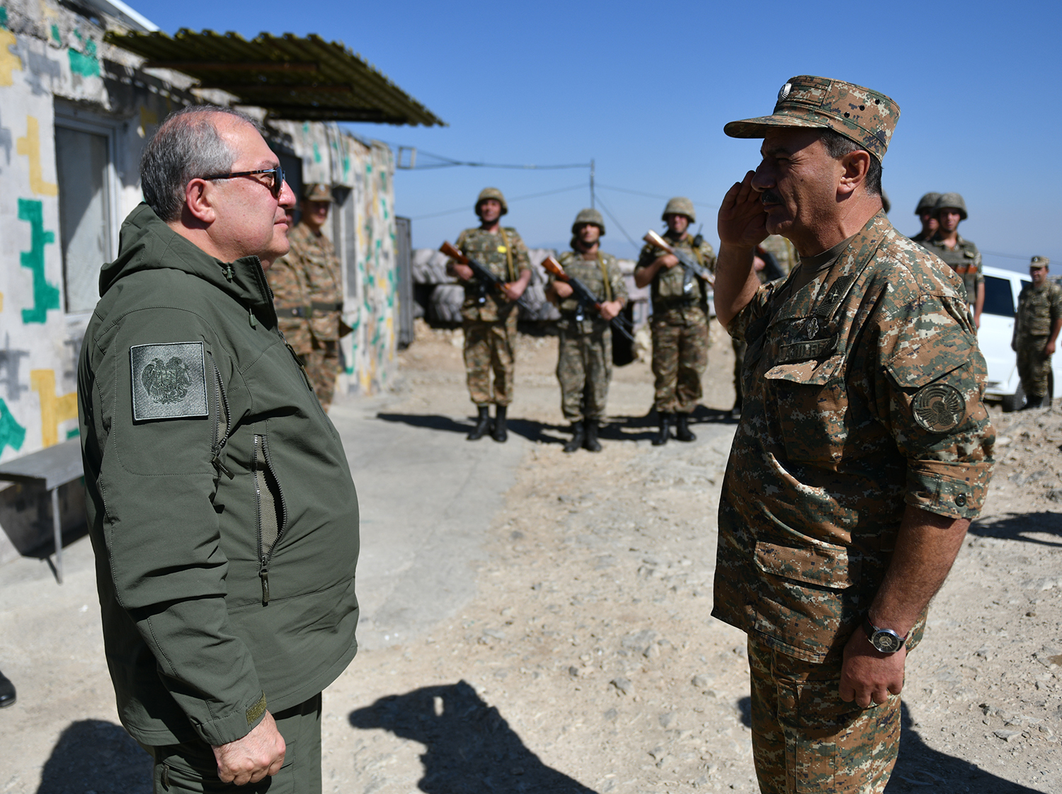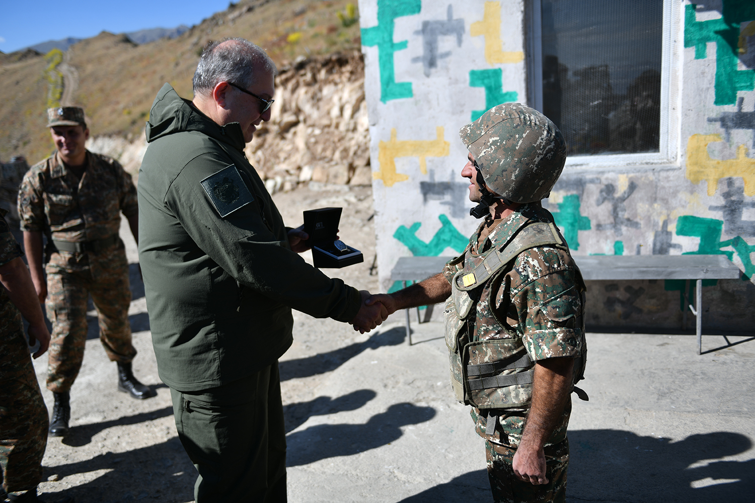 President Armen Sarkissian, who is in Syunik marz on a working visit, was today at the combat position of the N military division of the RA Defense Army. The President met with the troops and officers on duty, toured the position, familiarized with the service conditions, and combat readiness of the unit.