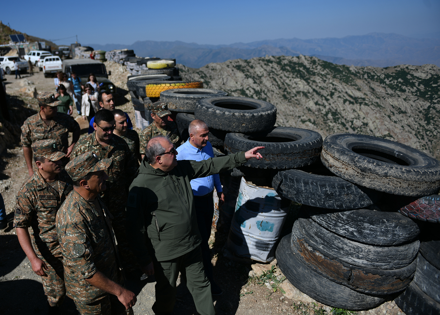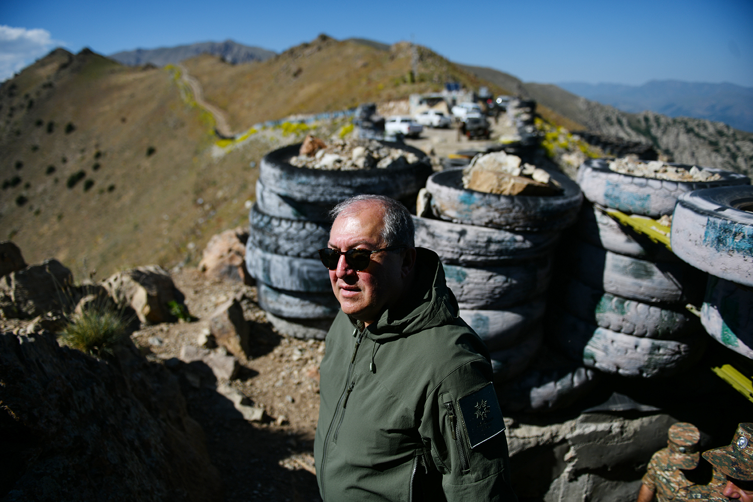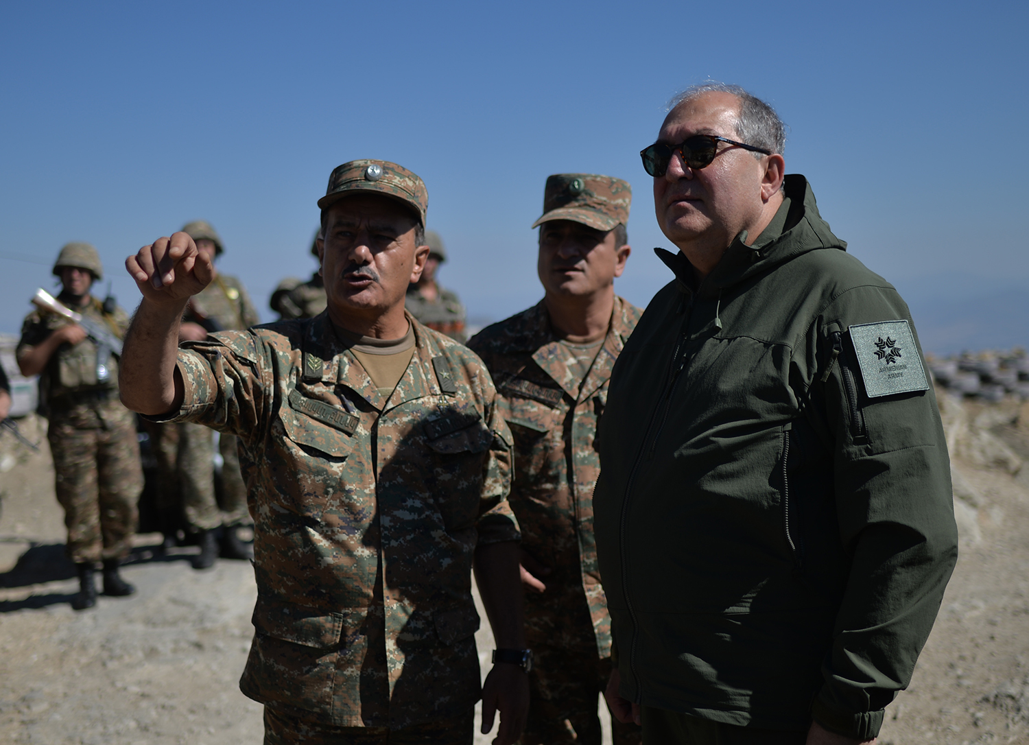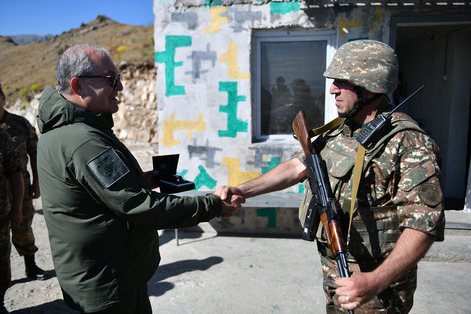 President Armen Sarkissian, who is in Syunik marz on a working visit, was today at the combat position of the N military division of the RA Defense Army. The President met with the troops and officers on duty, toured the position, familiarized with the service conditions, and combat readiness of the unit.
