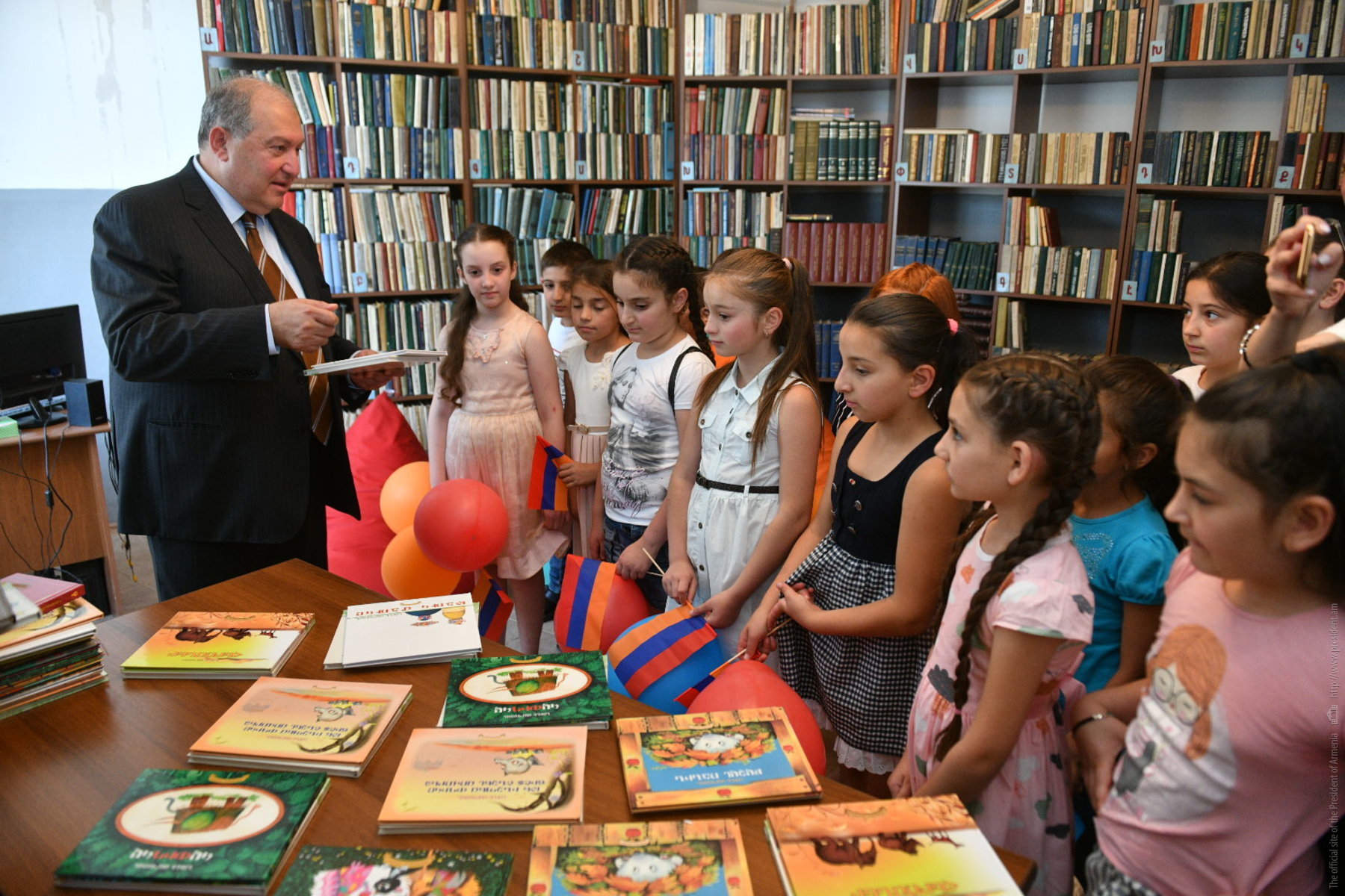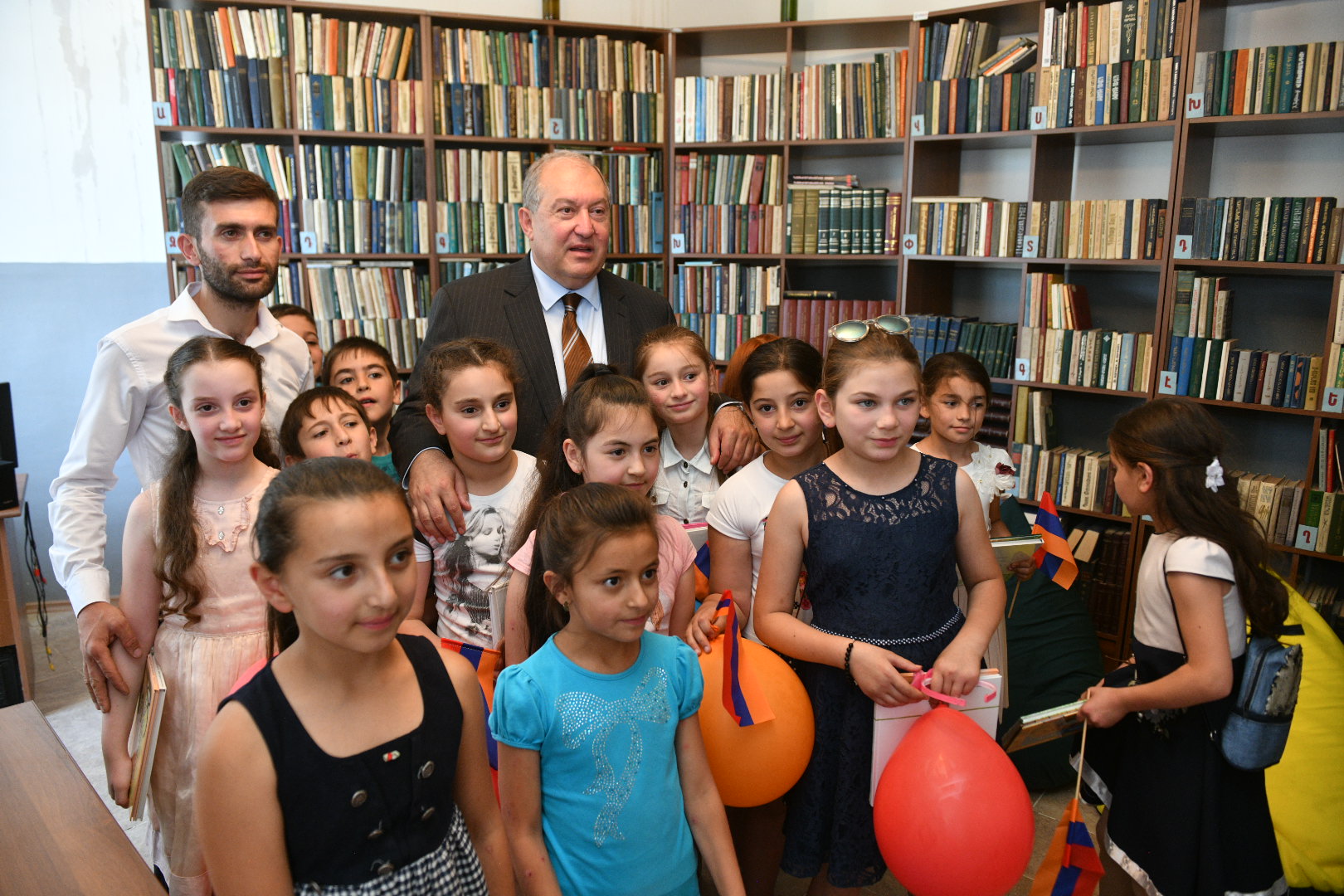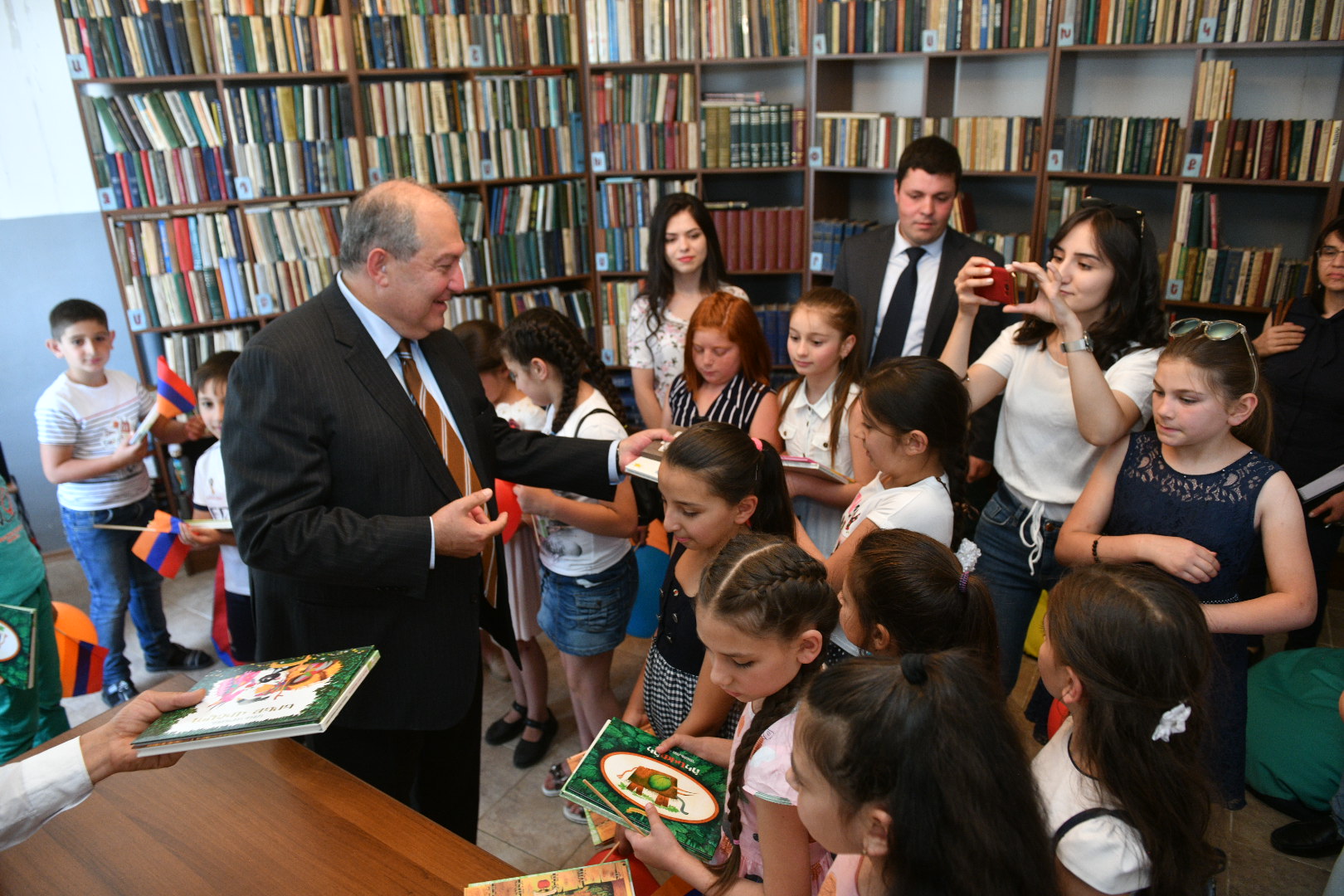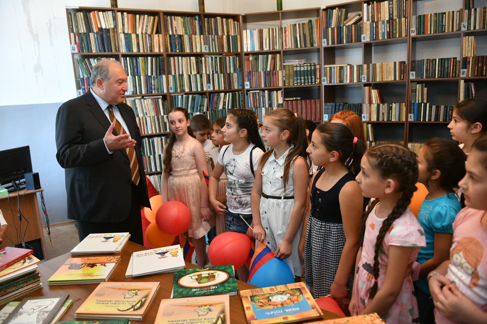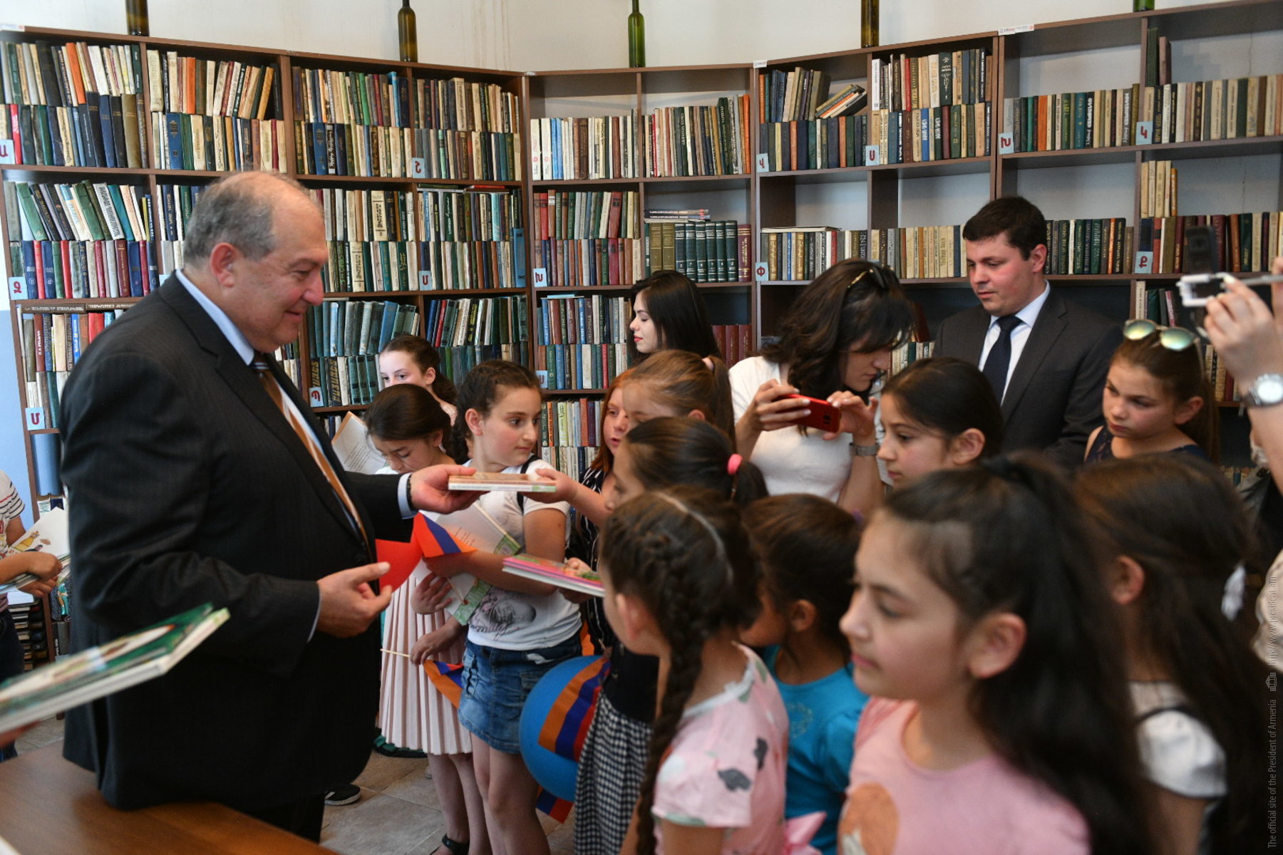 Accompanied by the children of the village, President Sarkissian visited the community library and presented them with the books of the fairy tales authored by his spouse Nouneh Sarkissian.
