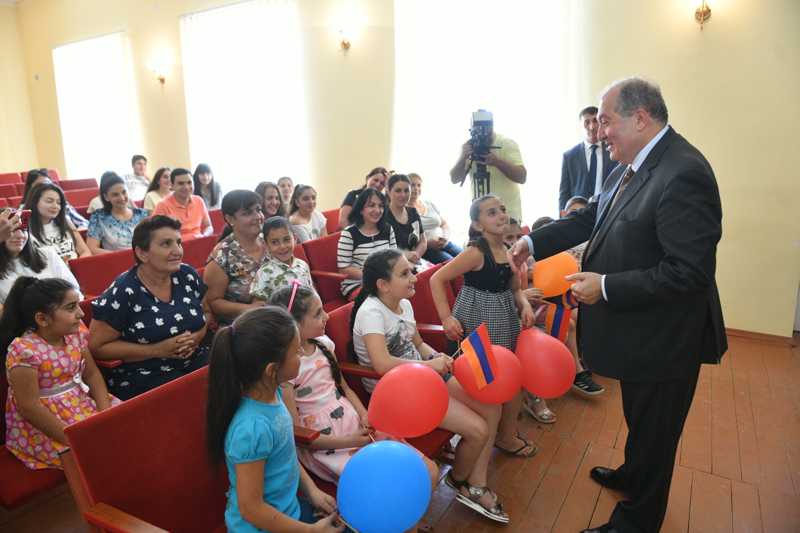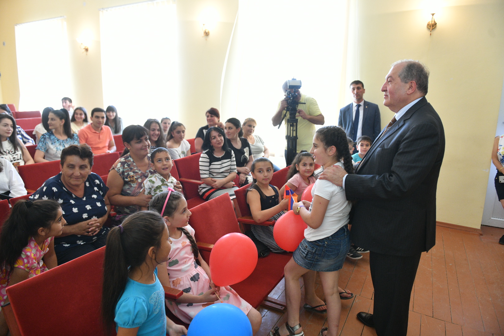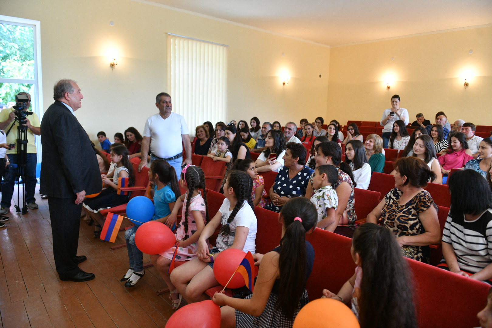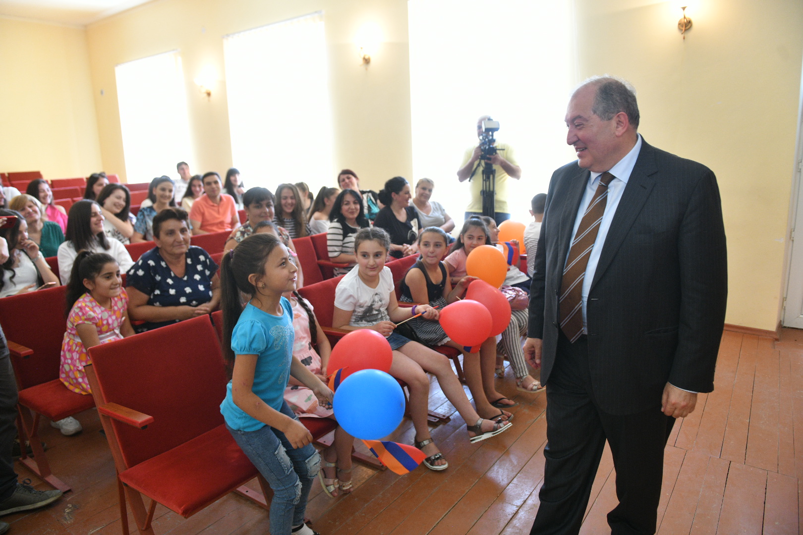 Accompanied by the children of the village, President Sarkissian visited the community library and presented them with the books of the fairy tales authored by his spouse Nouneh Sarkissian.
