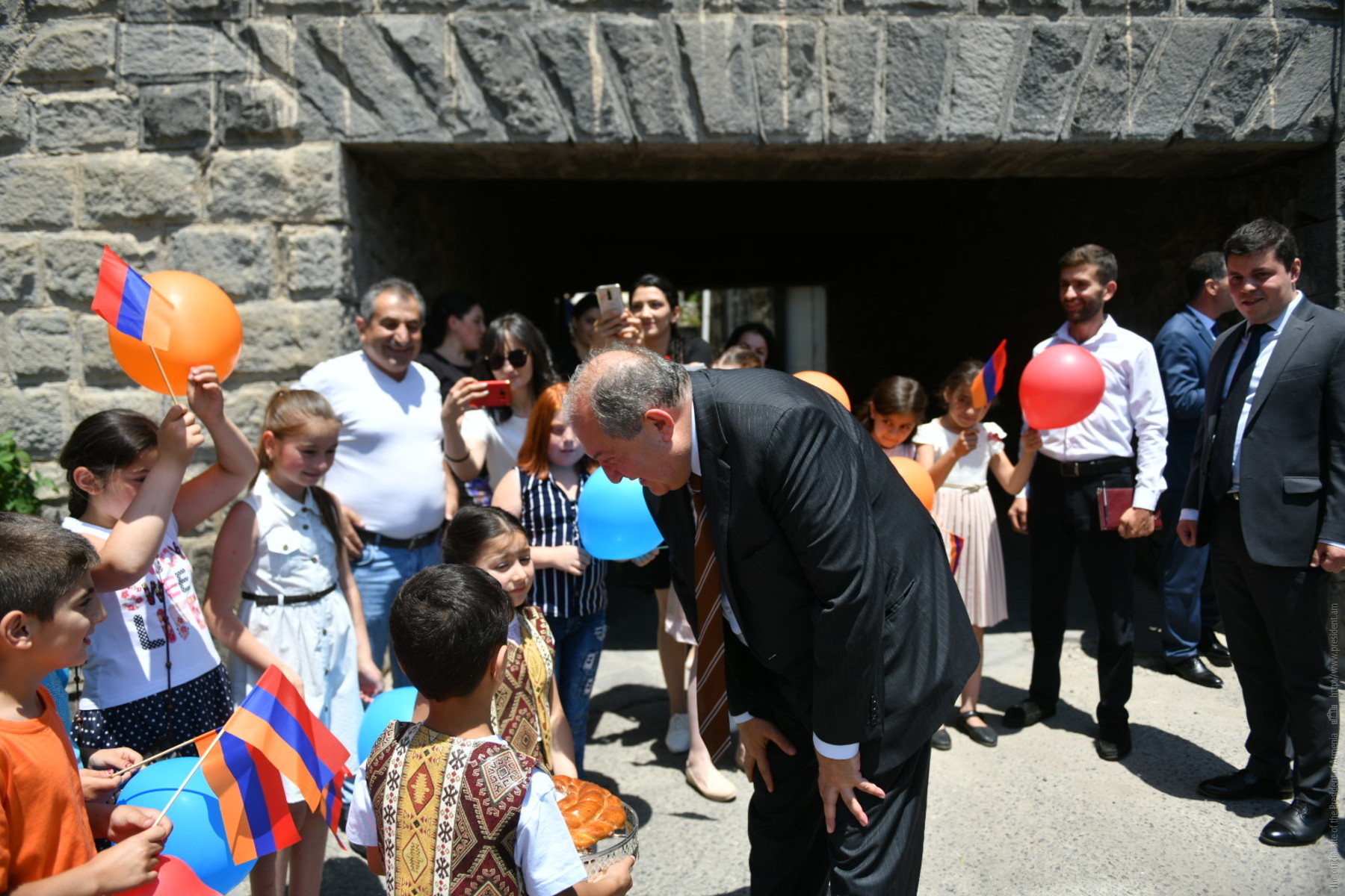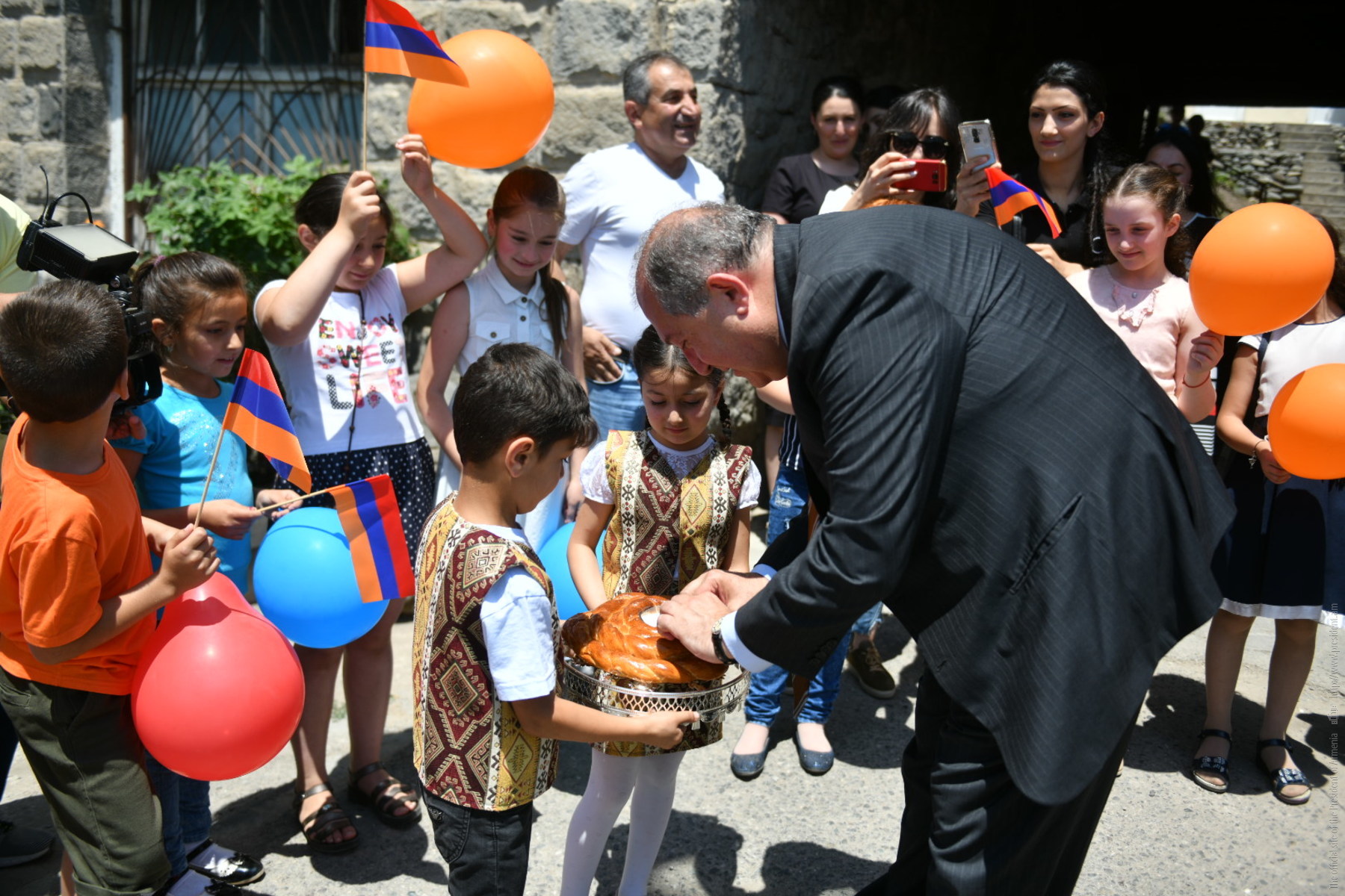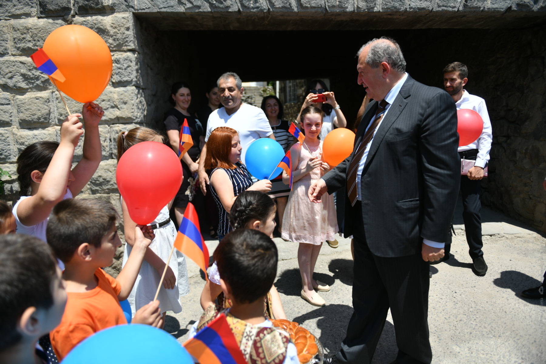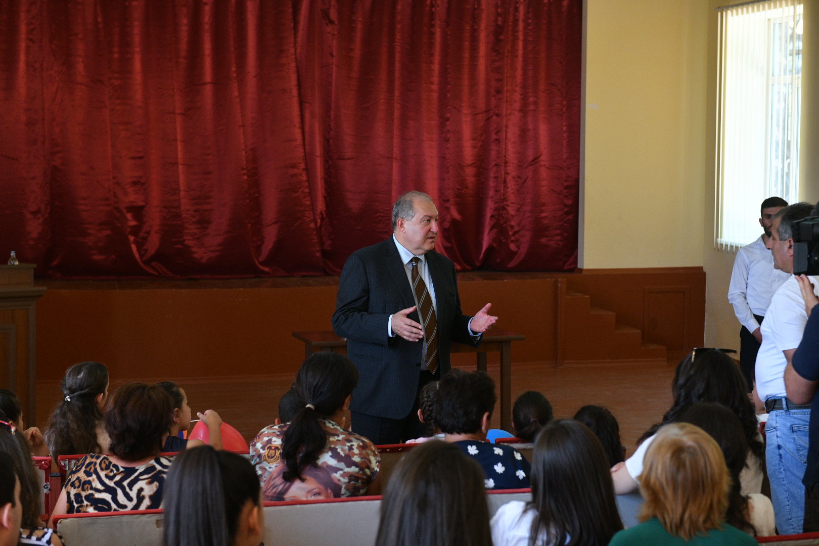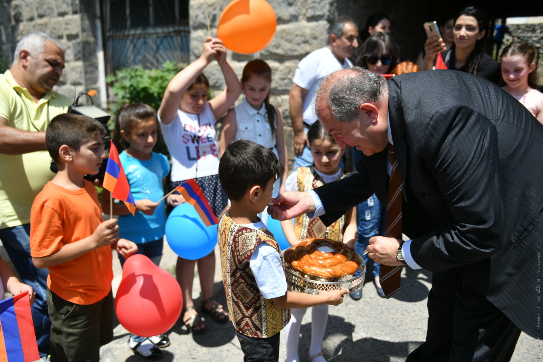 Accompanied by the children of the village, President Sarkissian visited the community library and presented them with the books of the fairy tales authored by his spouse Nouneh Sarkissian.