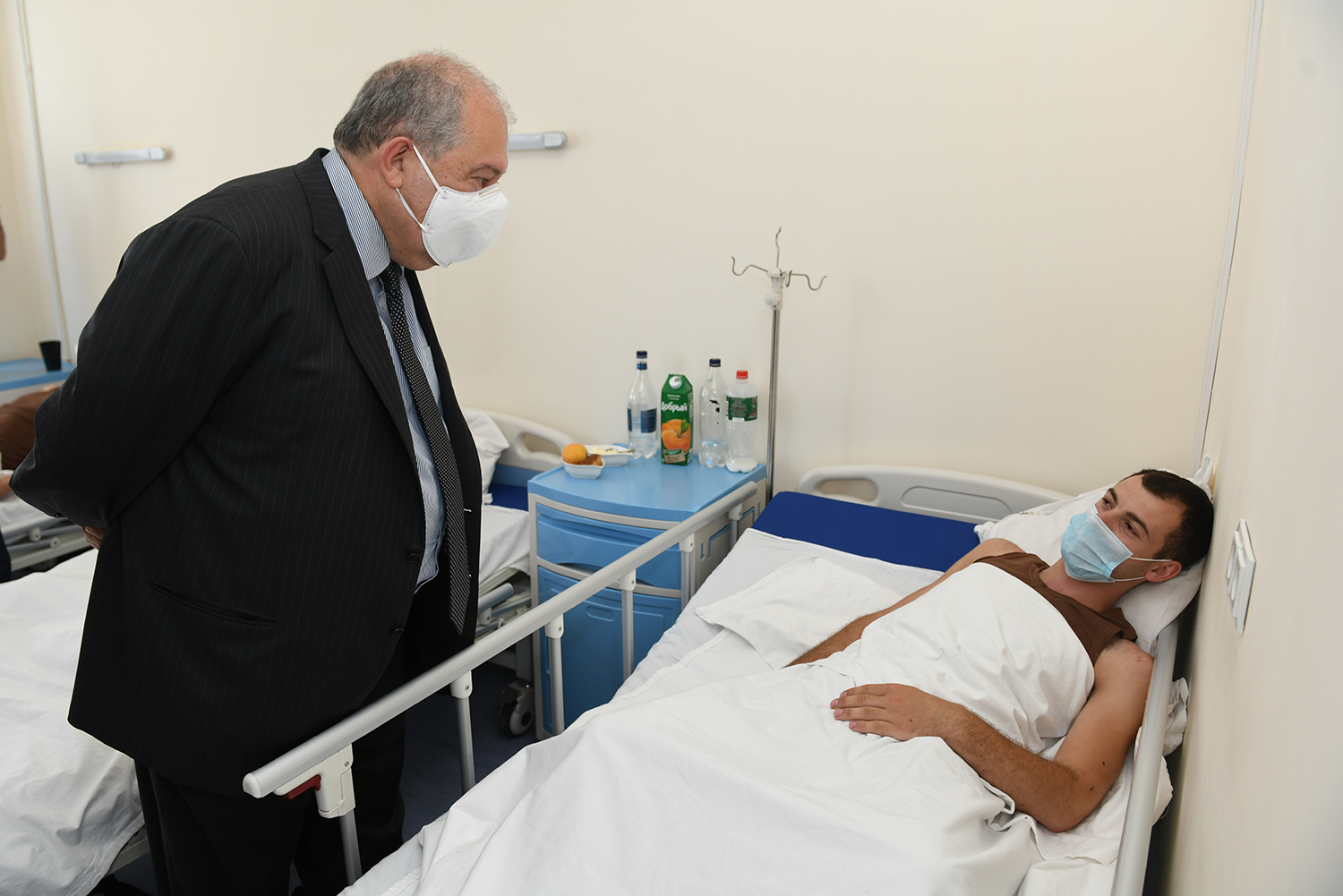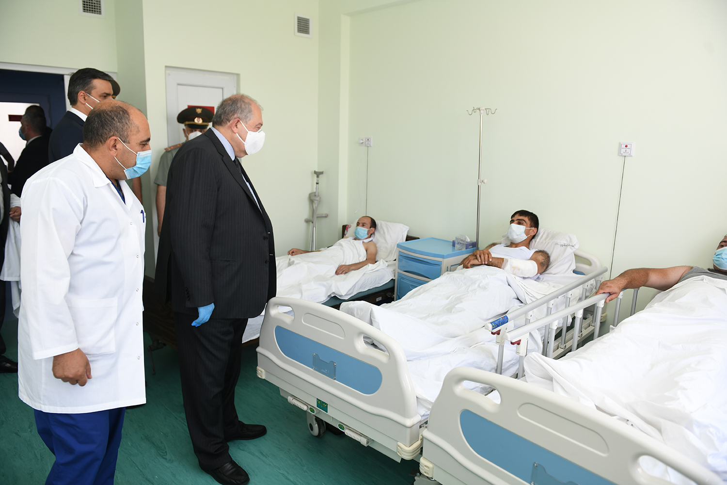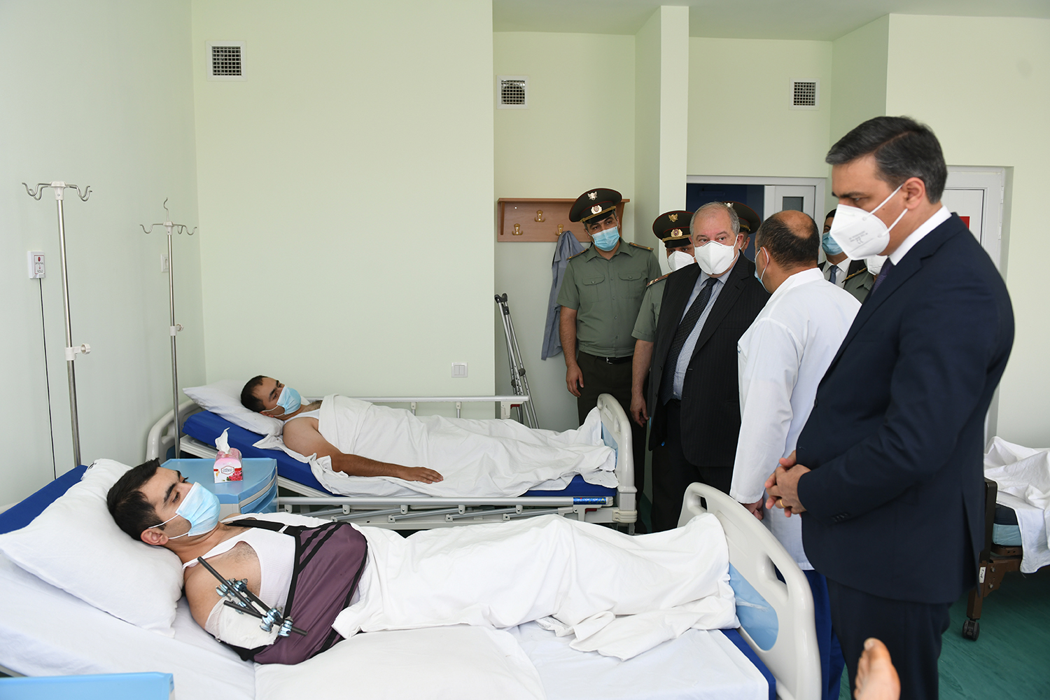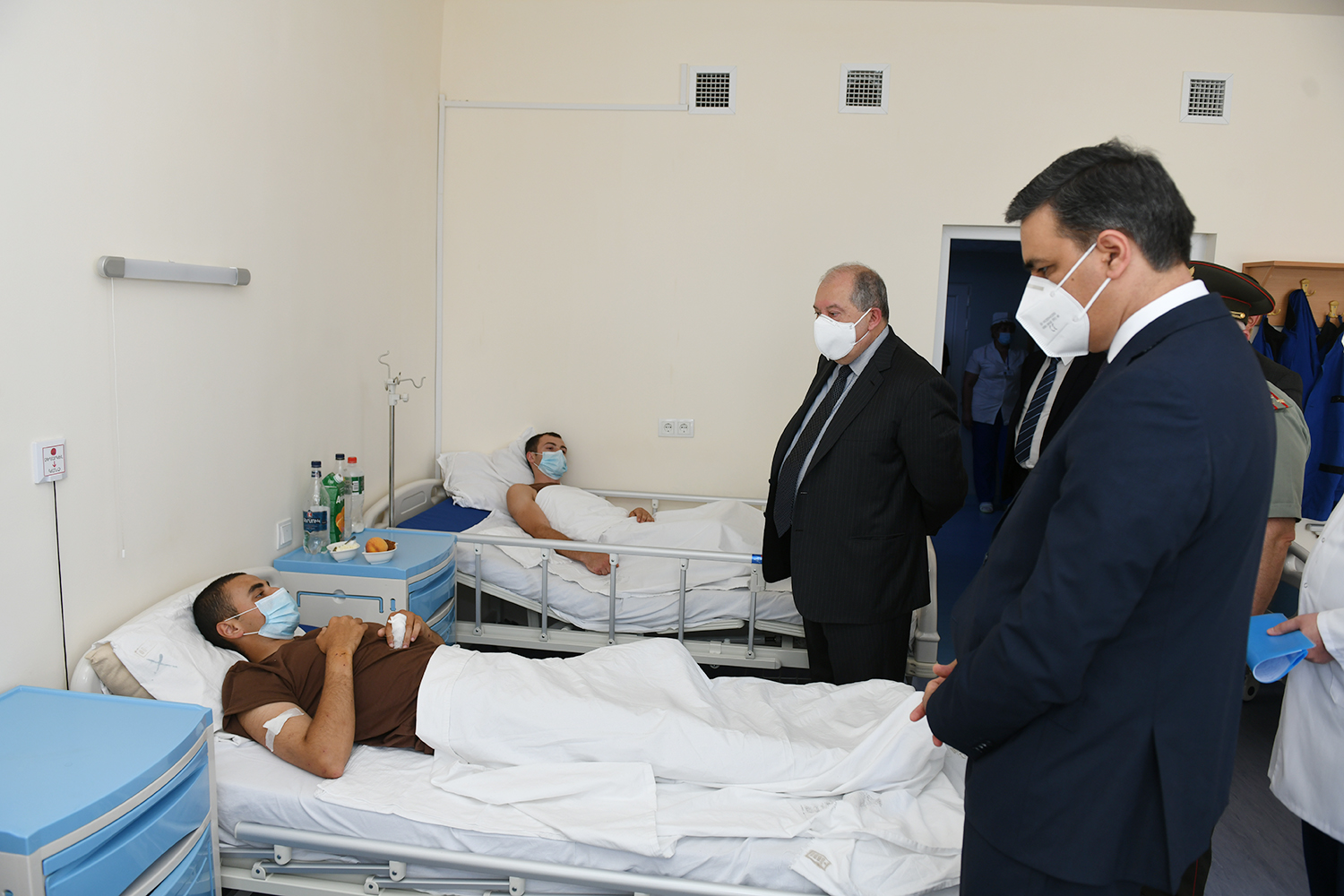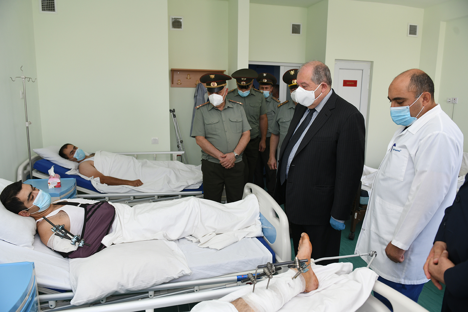 Accompanied by the RA Ombudsman Arman Tatoyan and Head of the Military Medicine Department of the RA Armed Forces Sahak Ohanian, the President visited the servicemen, inquired about their health condition, received treatment and wished them a speedy recovery. Representatives of the medical personnel told about the current condition of the servicemen and the process of recuperation.
