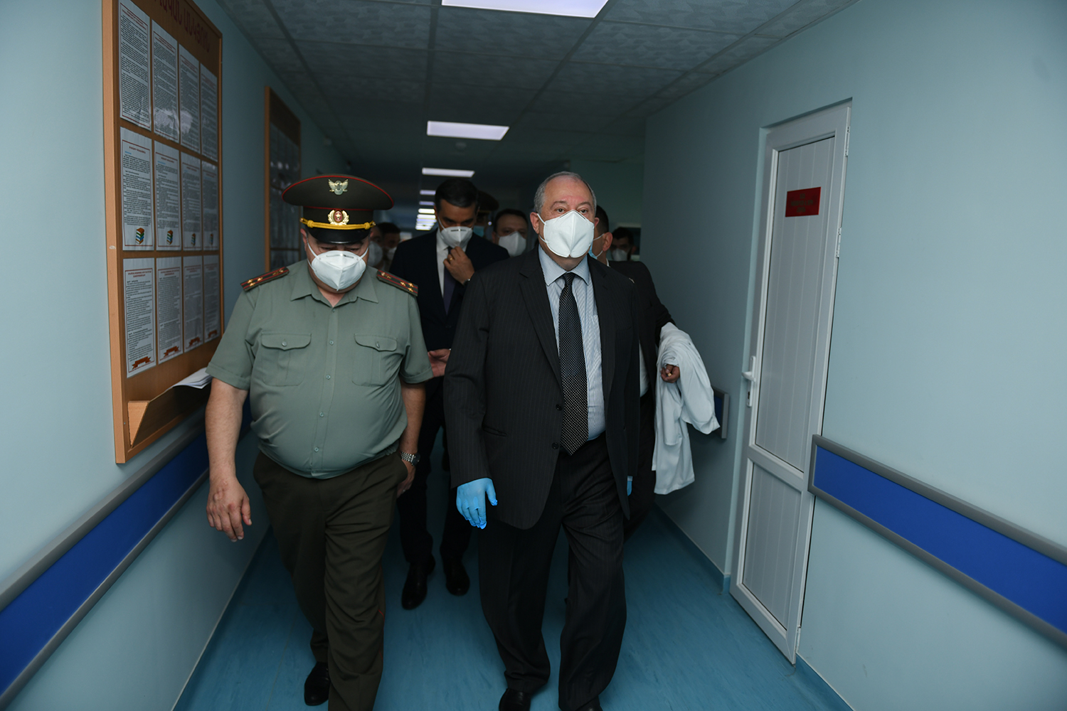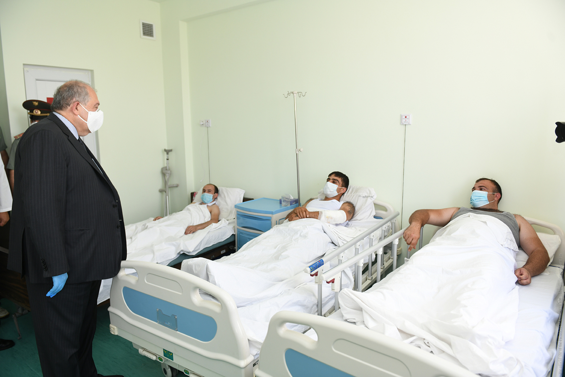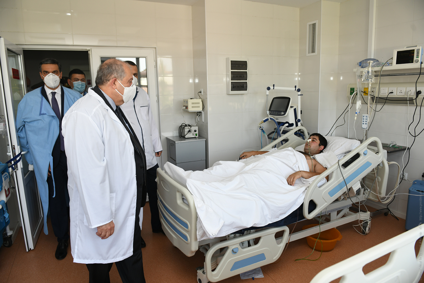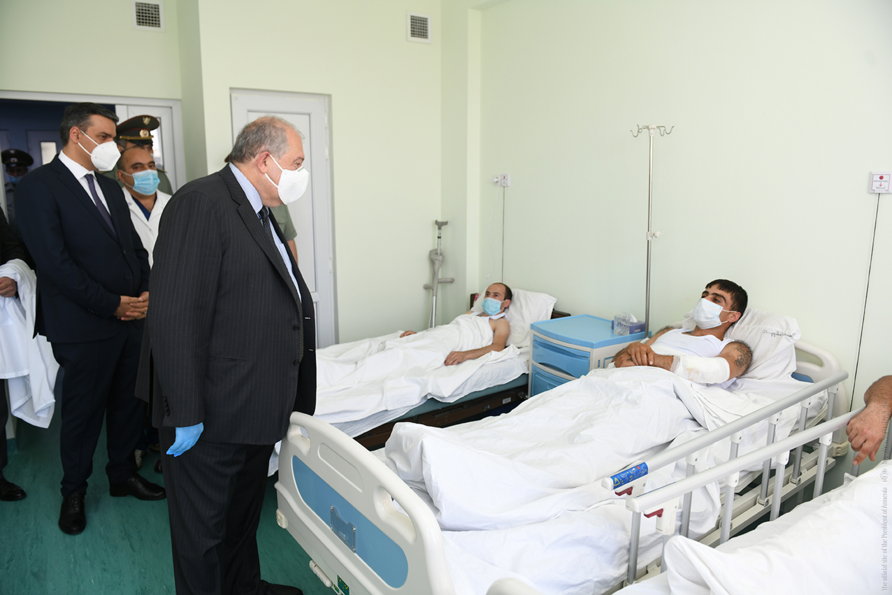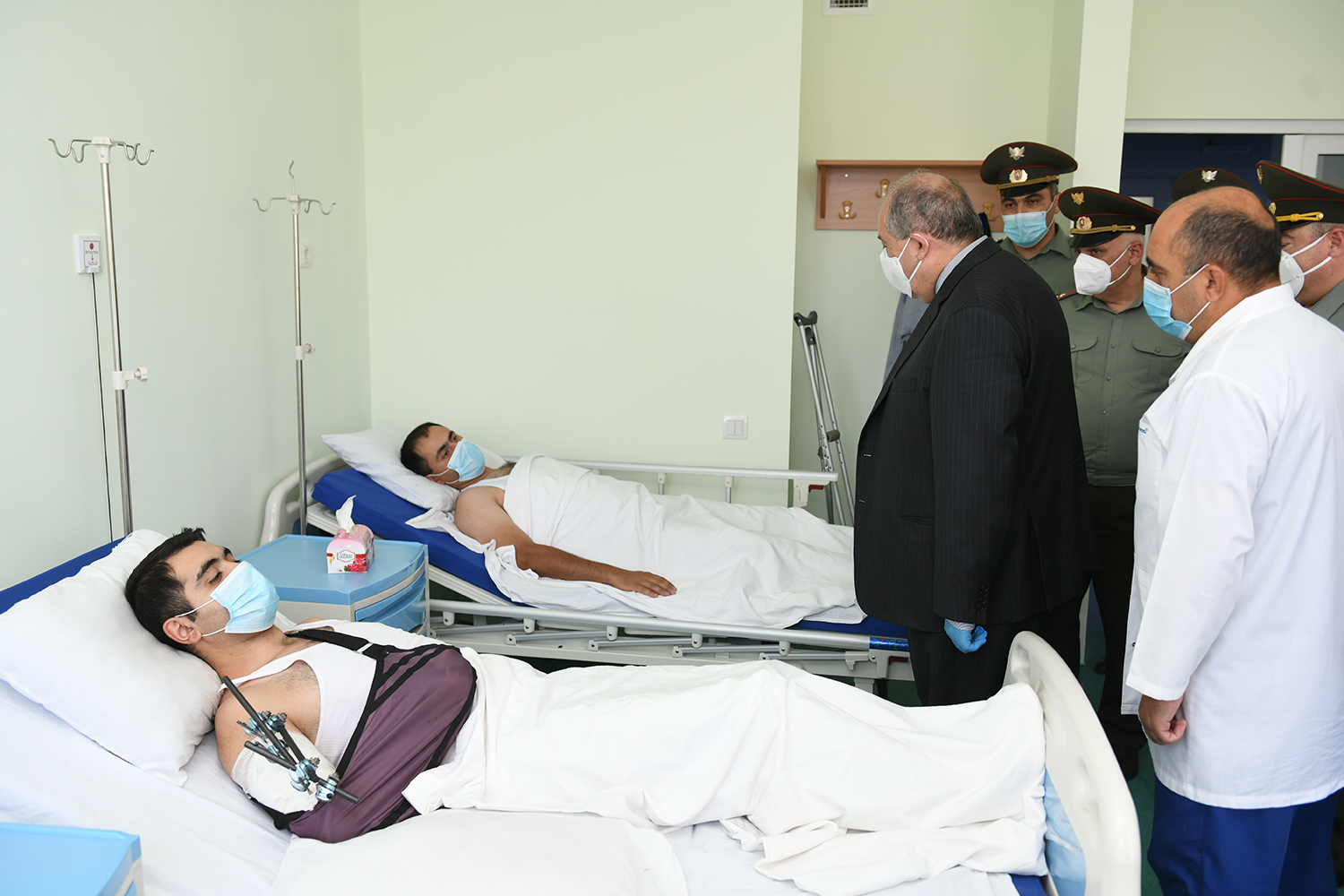 Accompanied by the RA Ombudsman Arman Tatoyan and Head of the Military Medicine Department of the RA Armed Forces Sahak Ohanian, the President visited the servicemen, inquired about their health condition, received treatment and wished them a speedy recovery. Representatives of the medical personnel told about the current condition of the servicemen and the process of recuperation.
