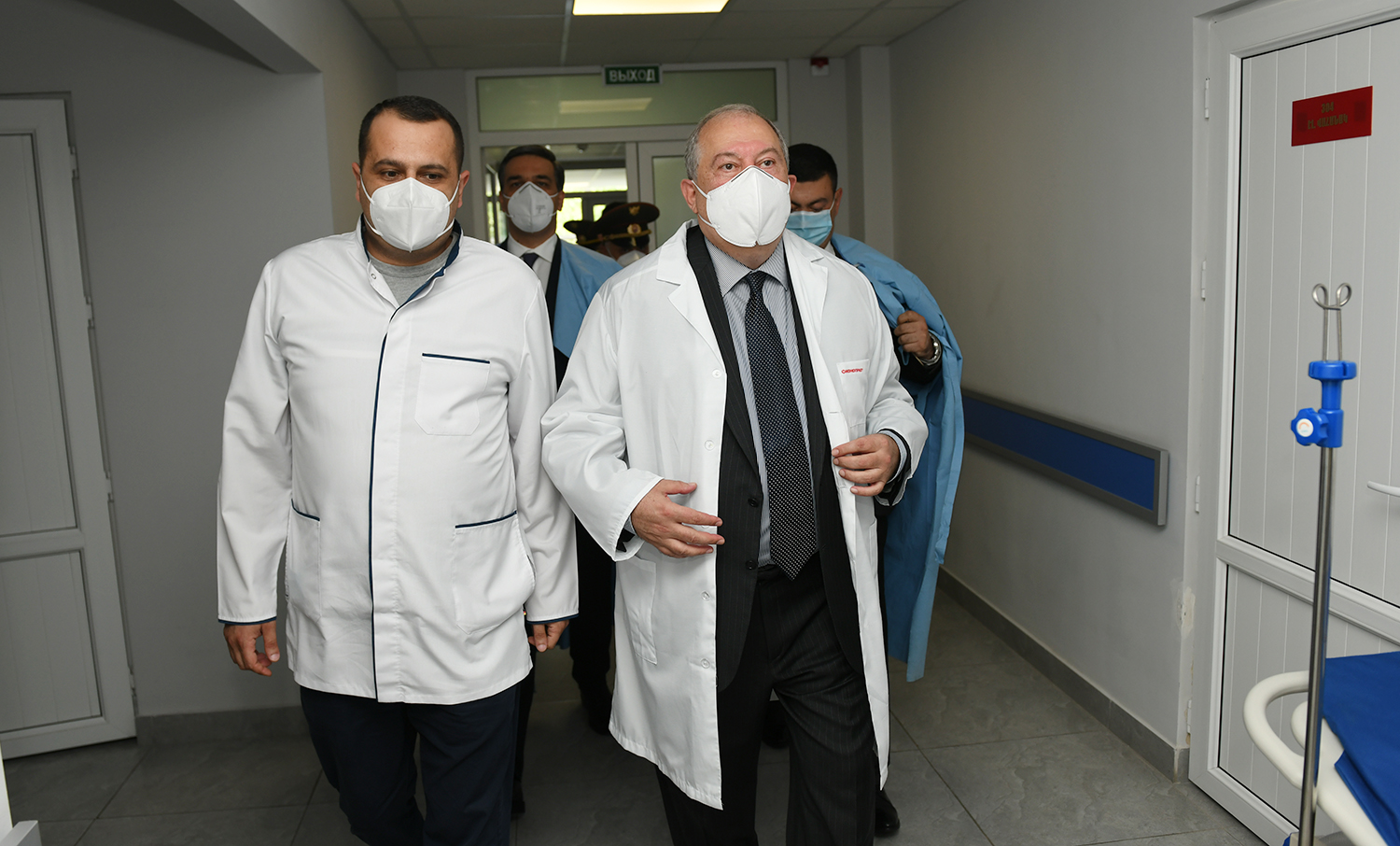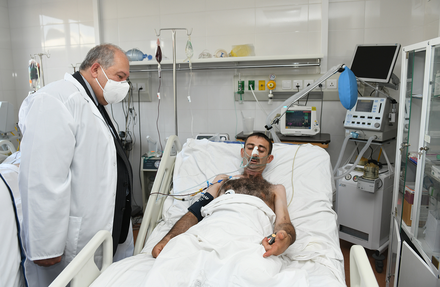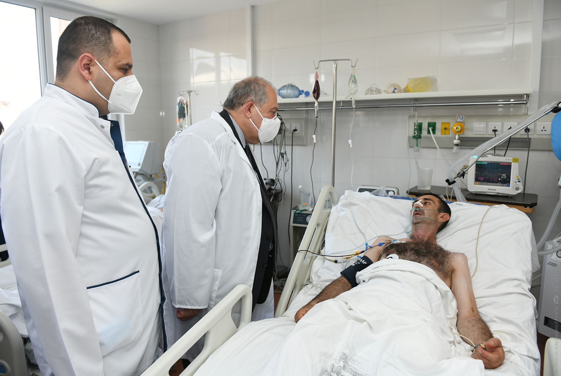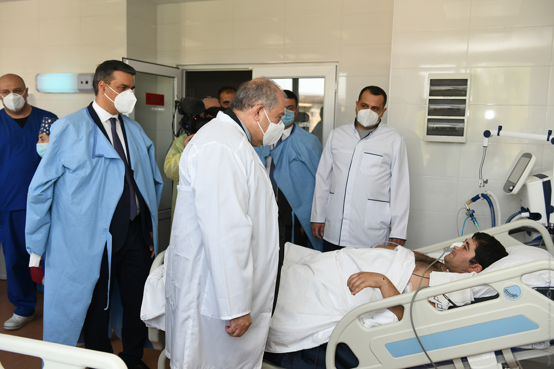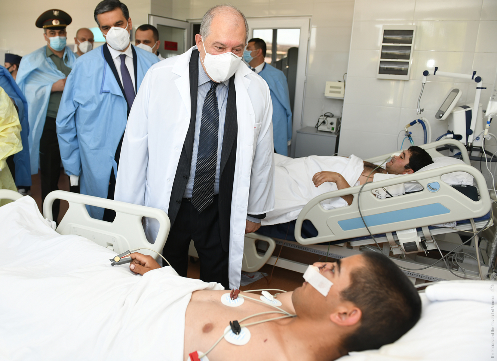 Accompanied by the RA Ombudsman Arman Tatoyan and Head of the Military Medicine Department of the RA Armed Forces Sahak Ohanian, the President visited the servicemen, inquired about their health condition, received treatment and wished them a speedy recovery. Representatives of the medical personnel told about the current condition of the servicemen and the process of recuperation.