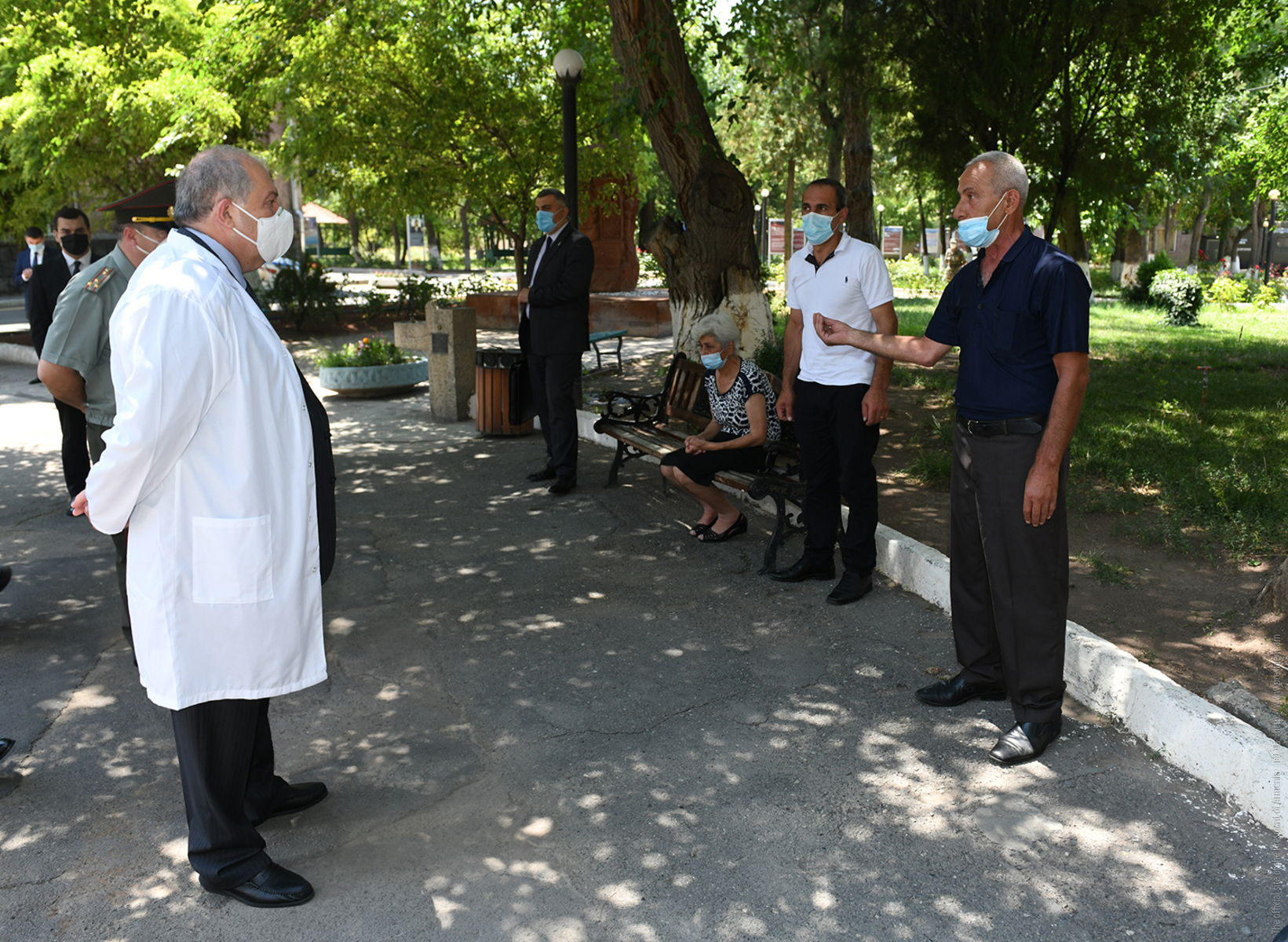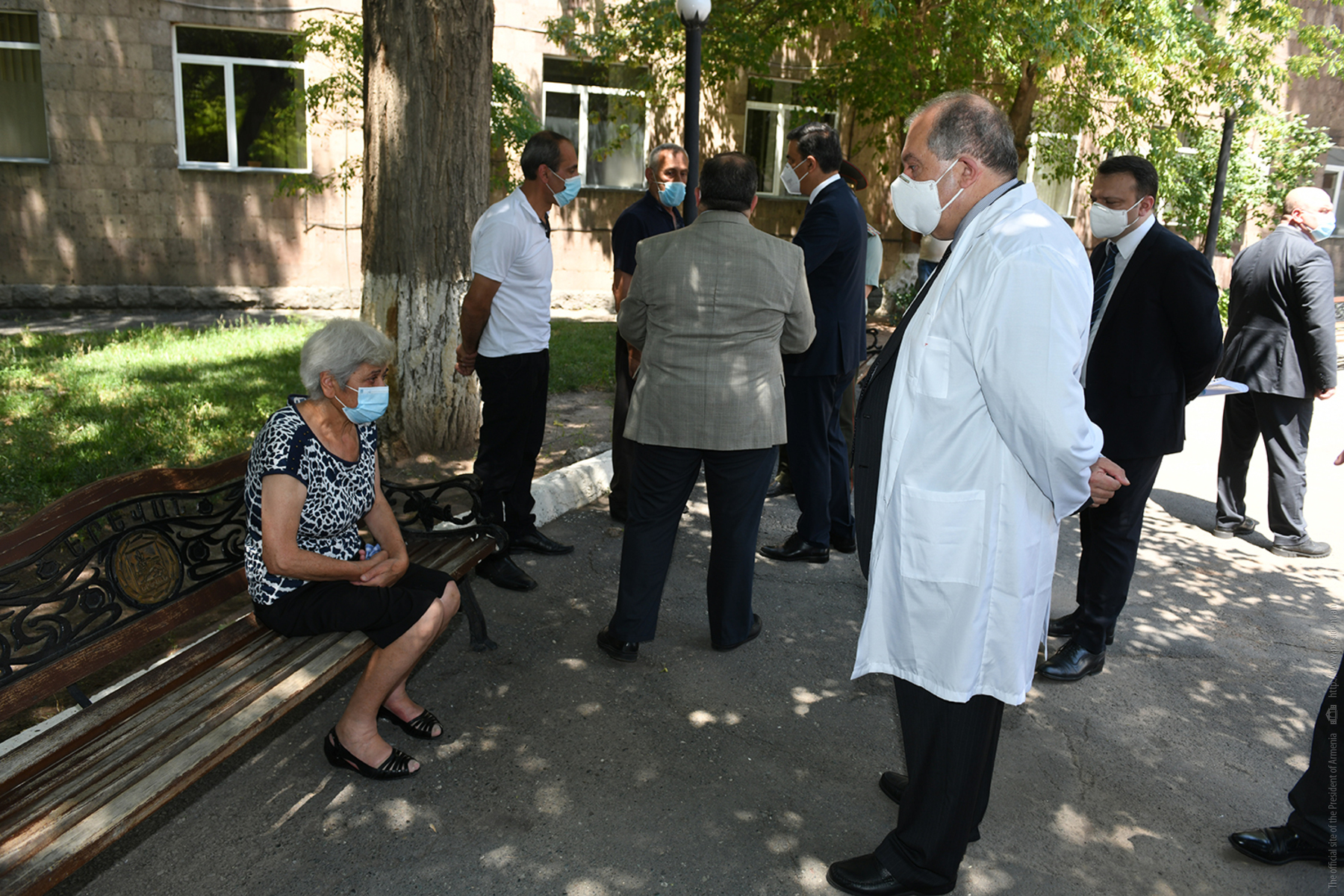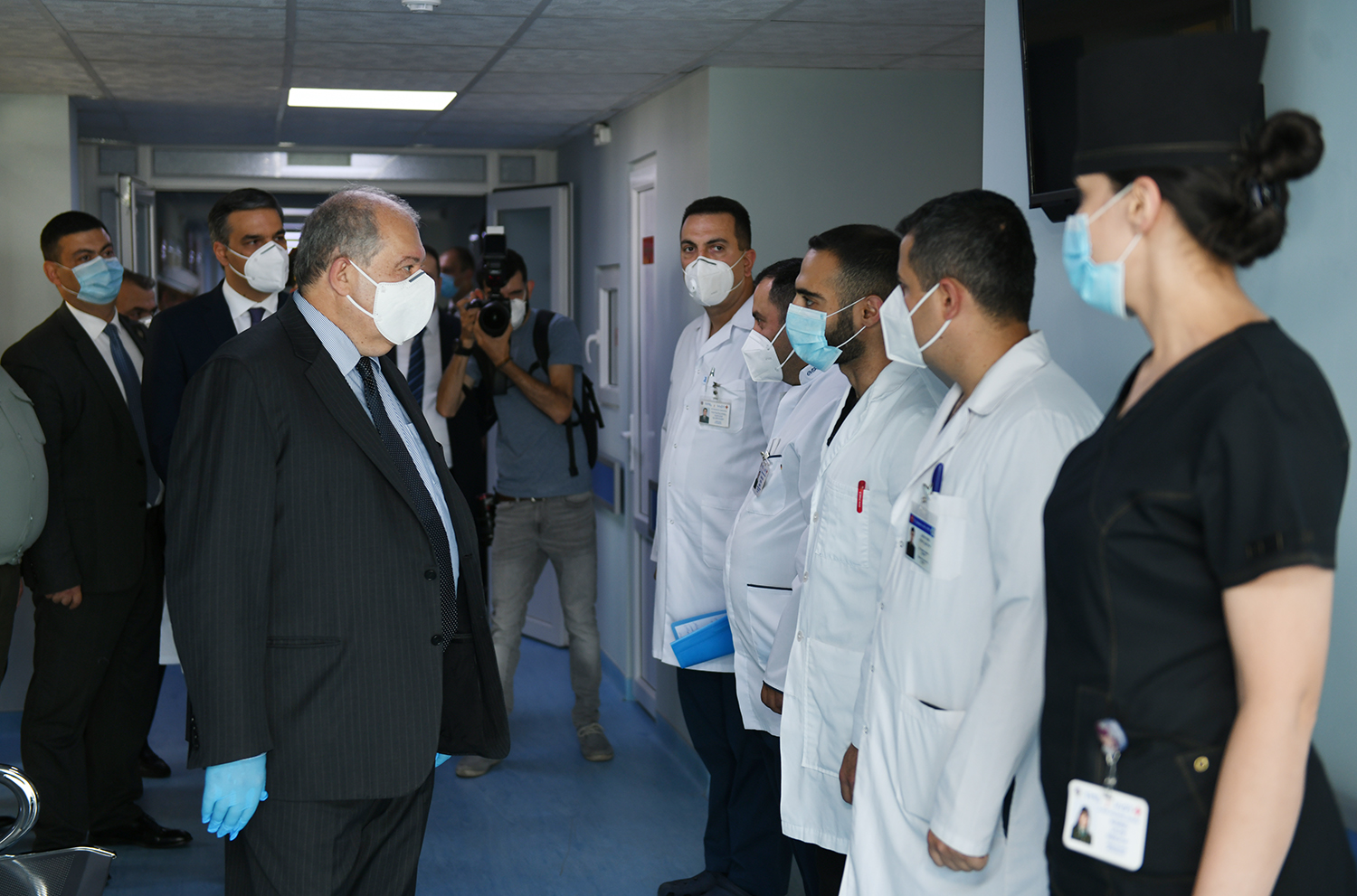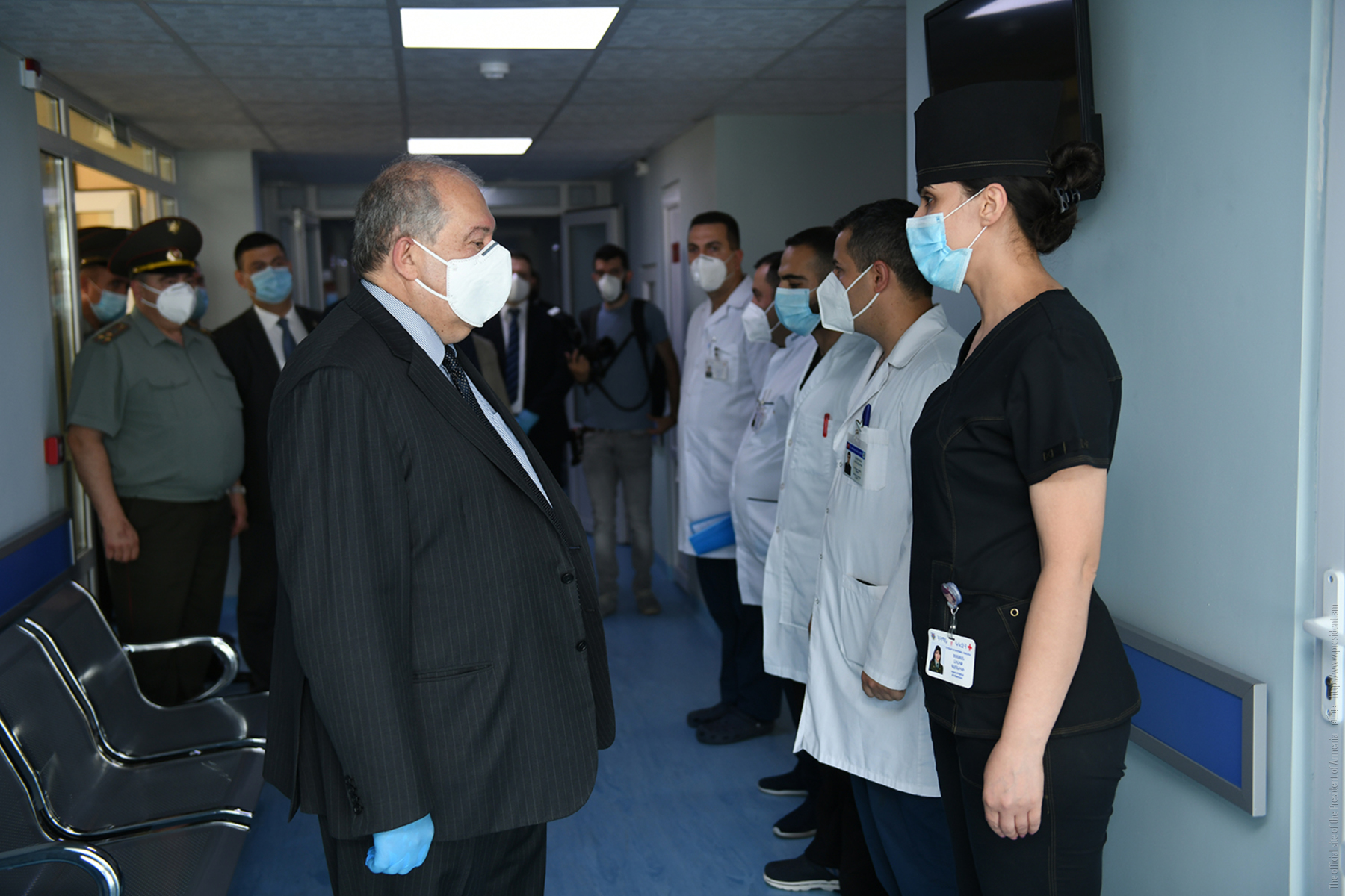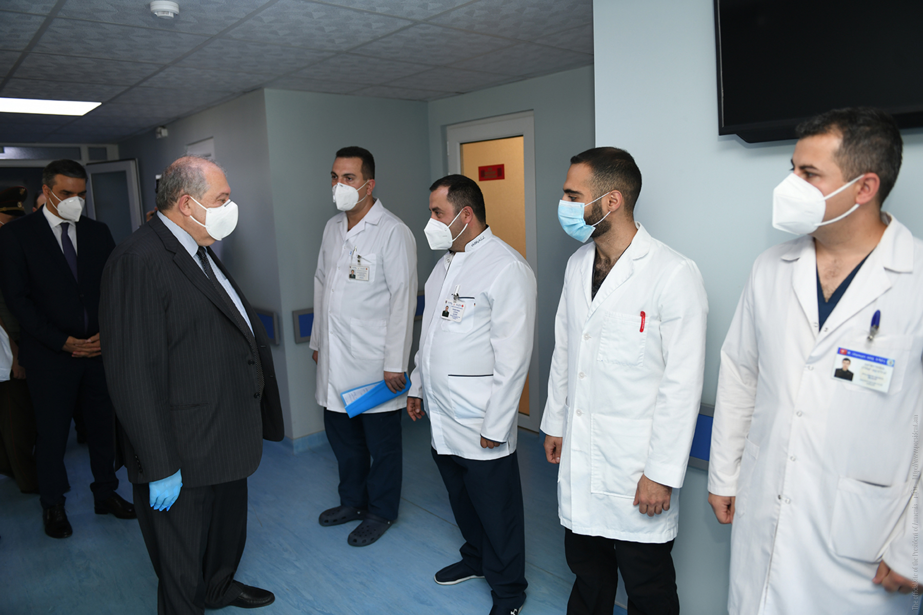 Accompanied by the RA Ombudsman Arman Tatoyan and Head of the Military Medicine Department of the RA Armed Forces Sahak Ohanian, the President visited the servicemen, inquired about their health condition, received treatment and wished them a speedy recovery. Representatives of the medical personnel told about the current condition of the servicemen and the process of recuperation.