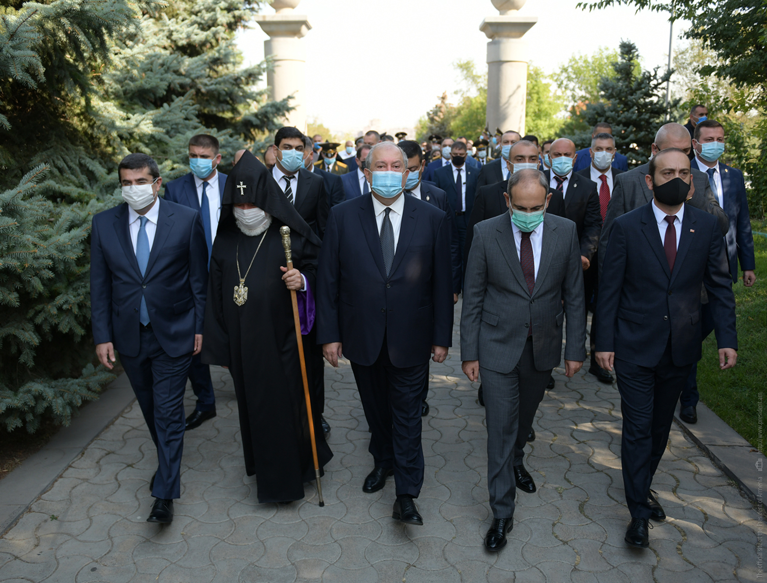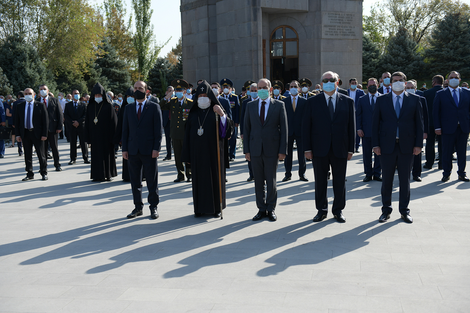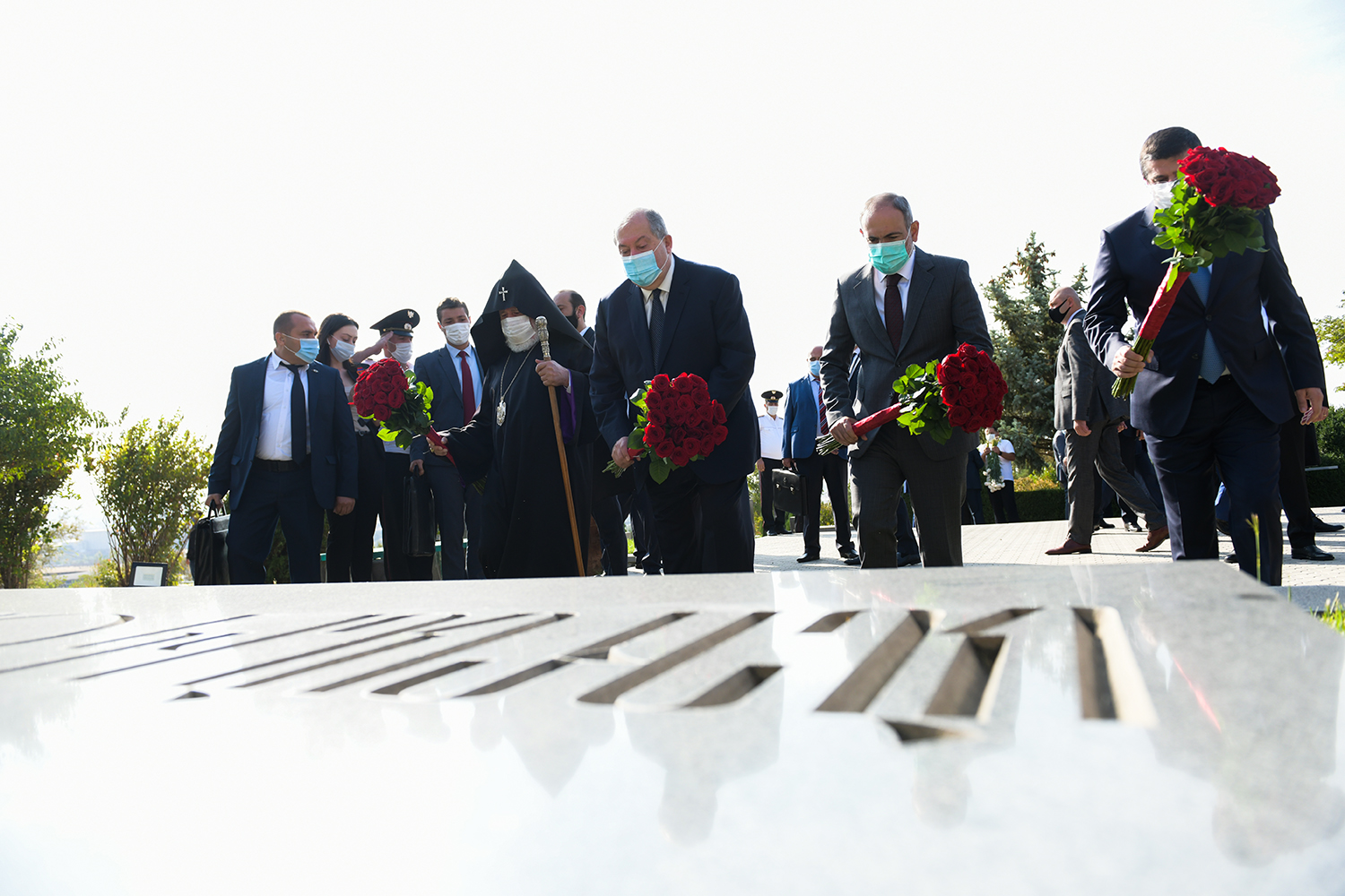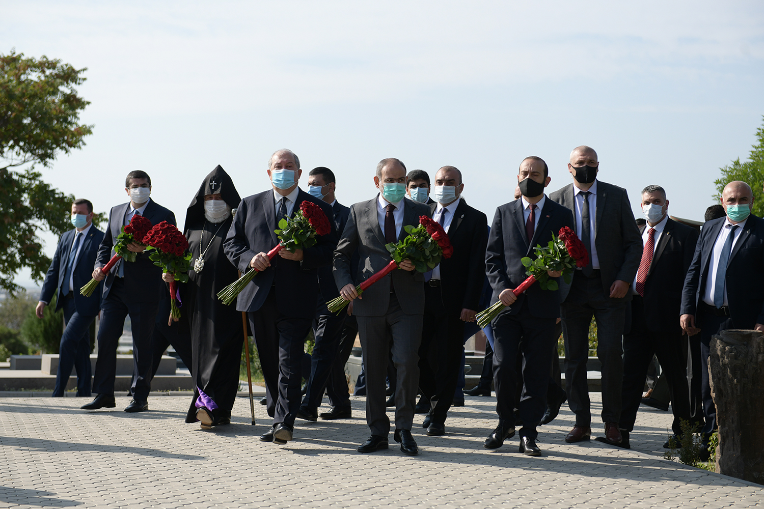 On the occasion of Independence Day, President Armen Sarkissian together with His Holiness Supreme Patriarch and Catholicos of All Armenians Garegin II, Prime Minister Nikol Pashinian, President of the Republic of Artsakh Arayik Harutyunian, Speaker of the National Assembly Ararat Mirzoyan, and members of the Security Council, accompanied by the highest echelon of the Ministry of Defense and Armed Forces visited today the Erablur military pantheon and paid tribute to the memory of the devotees who gave their lives for independence of the Fatherland.