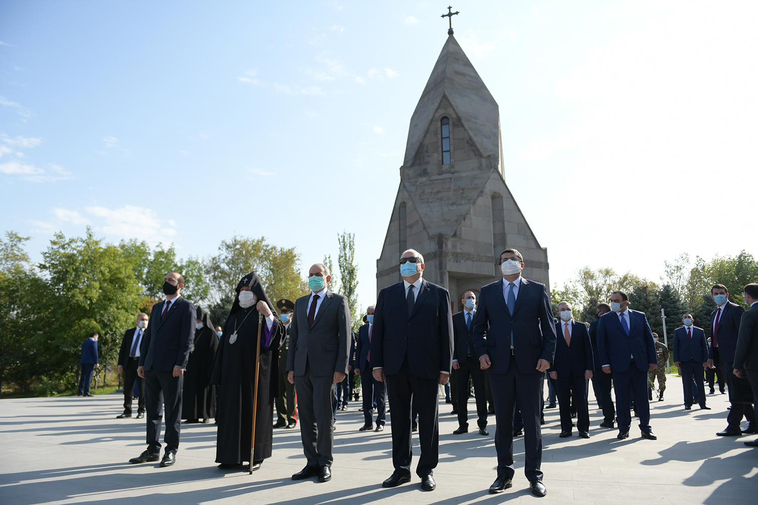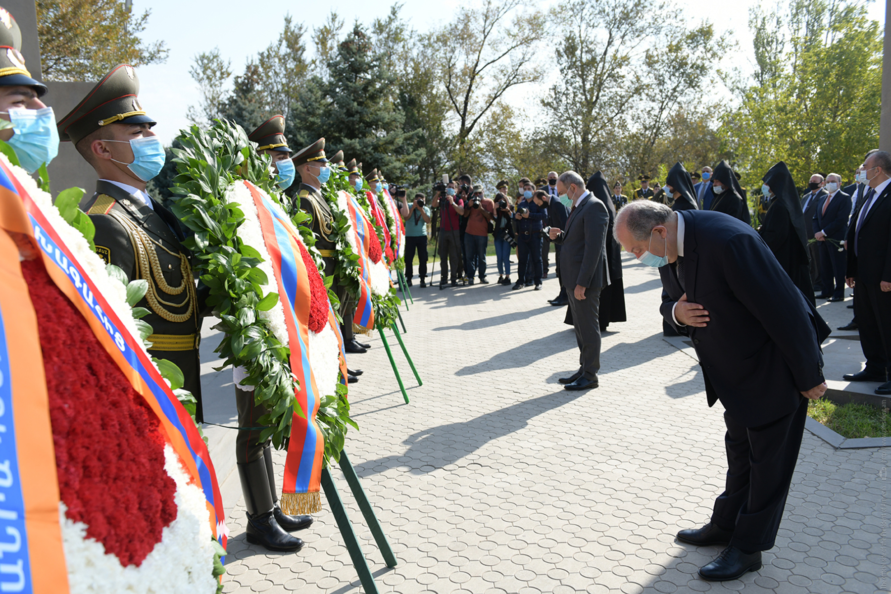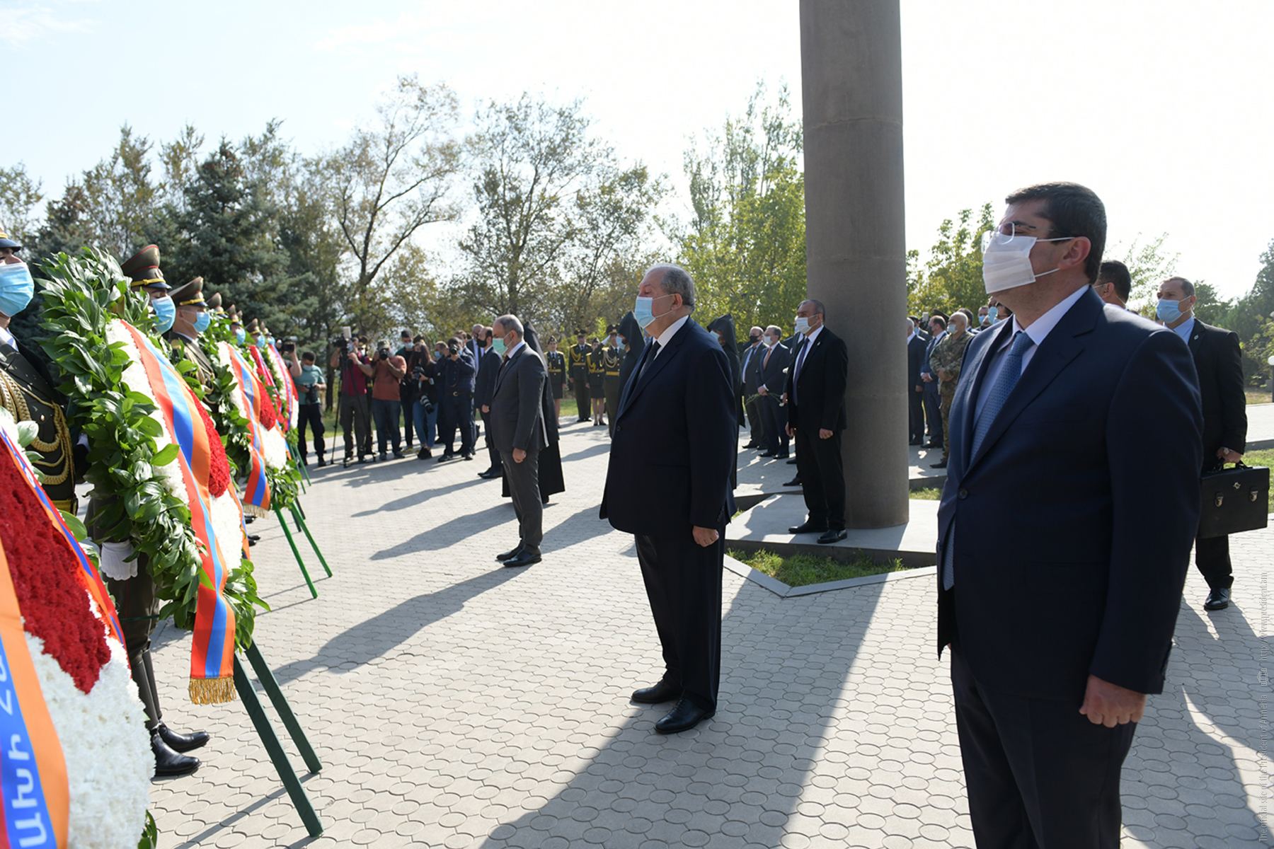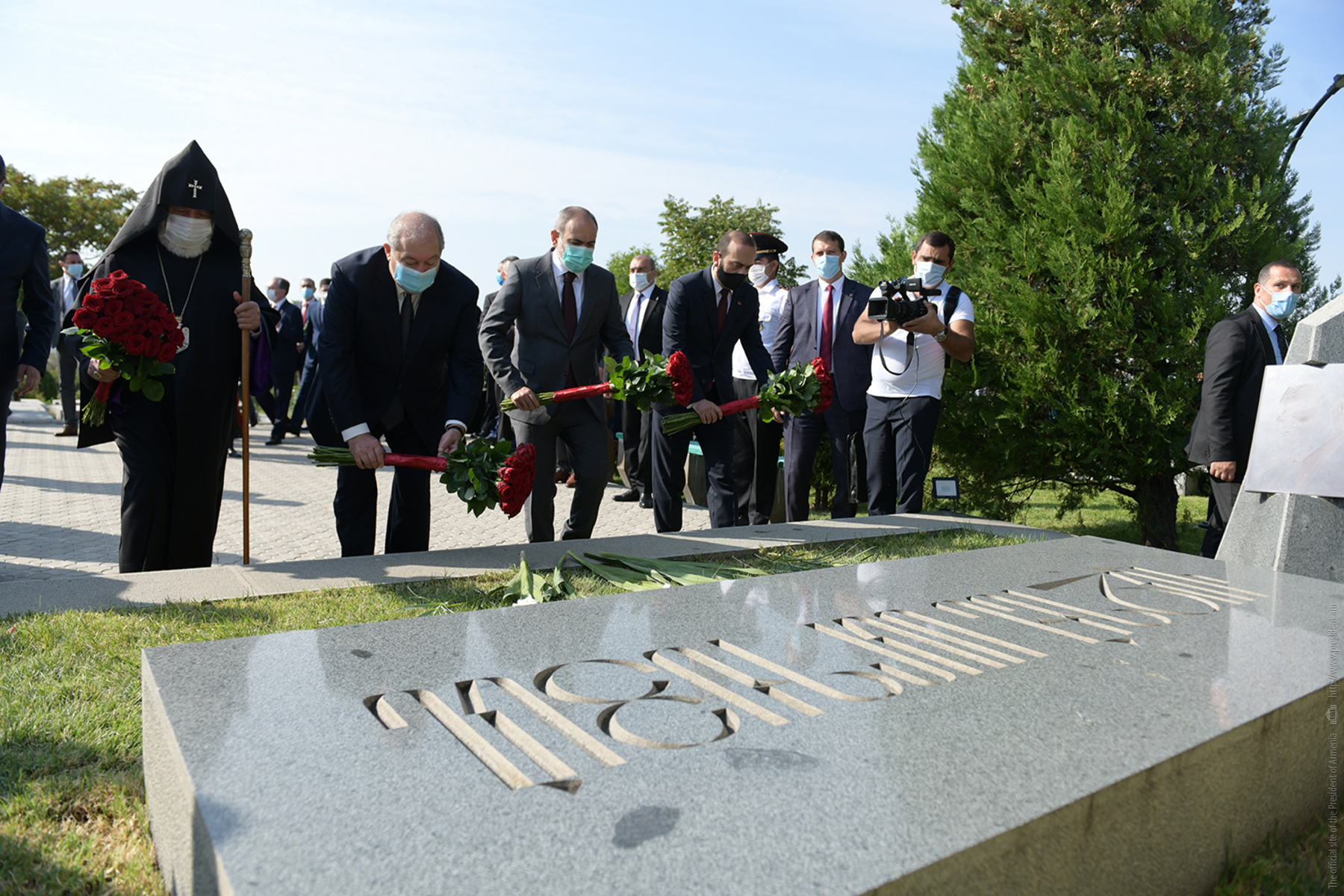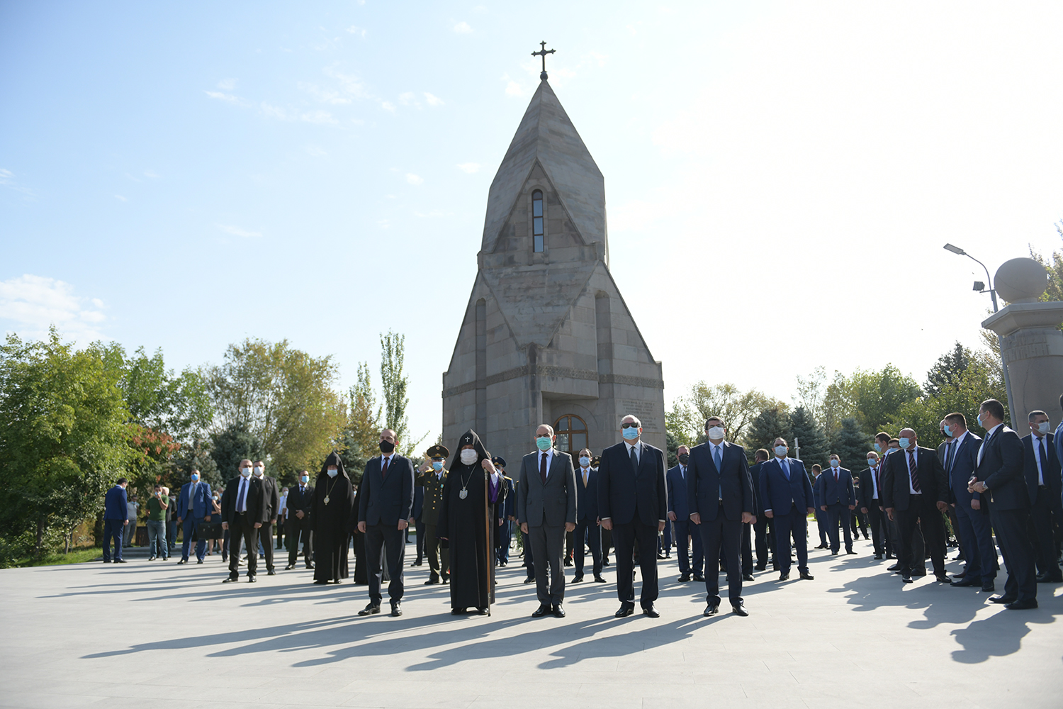 On the occasion of Independence Day, President Armen Sarkissian together with His Holiness Supreme Patriarch and Catholicos of All Armenians Garegin II, Prime Minister Nikol Pashinian, President of the Republic of Artsakh Arayik Harutyunian, Speaker of the National Assembly Ararat Mirzoyan, and members of the Security Council, accompanied by the highest echelon of the Ministry of Defense and Armed Forces visited today the Erablur military pantheon and paid tribute to the memory of the devotees who gave their lives for independence of the Fatherland.
