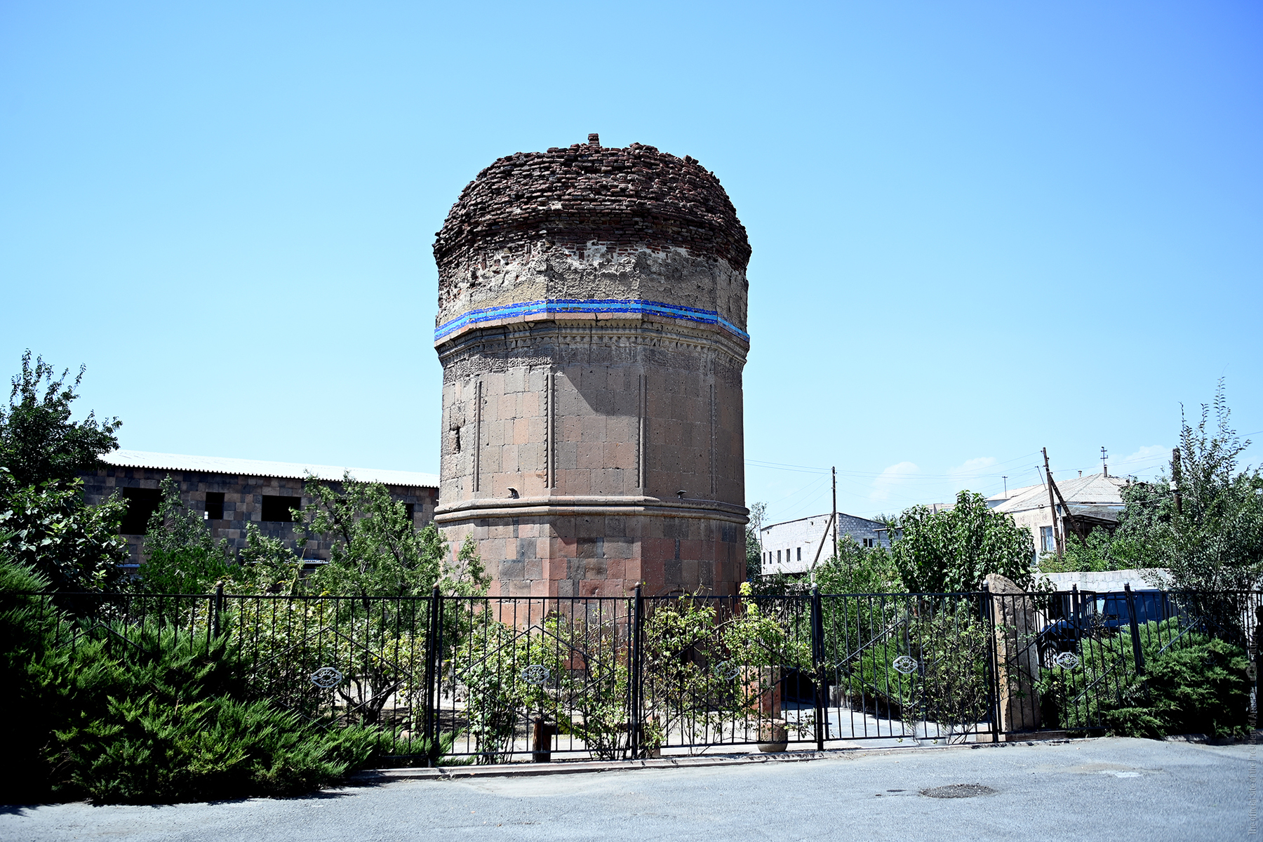 The monument-mausoleum, built by Armenian masters, is a synthesis of medieval Armenian and Islamic architectural elements. It is a tuff-built, tower-like, domed structure divided into three equal parts, with the dome constructed of baked brick. An inscription in Arabic script on the front of the mausoleum states that this sacred domed mausoleum was built in 1413.