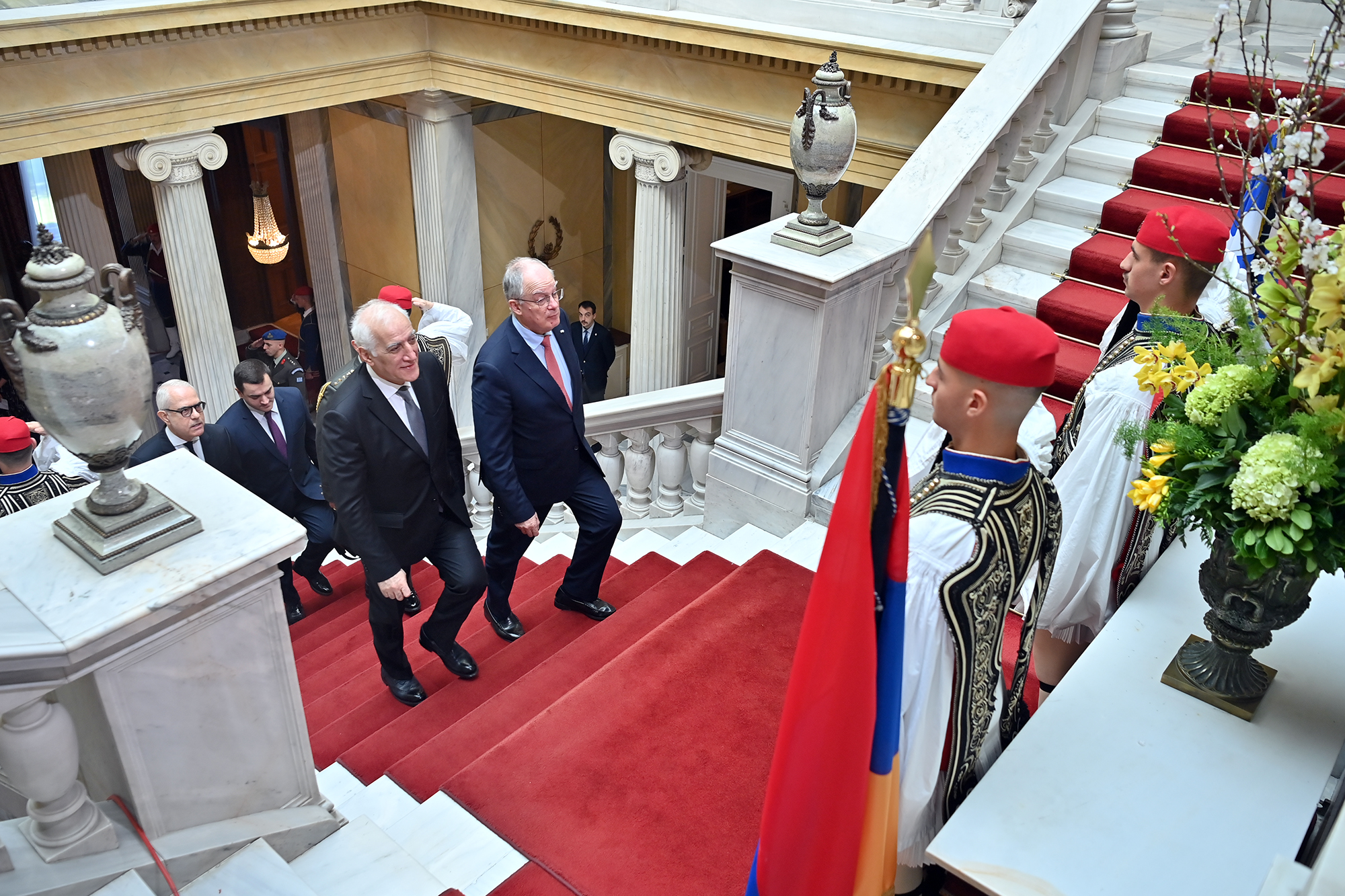 At the residence of the President of Greece, an official welcoming ceremony was held for President Vahagn Khachaturyan, who arrived in Athens on a state visit. This was followed by a private meeting between President Vahagn Khachaturyan and President of Greece Konstantinos Tassoulas.