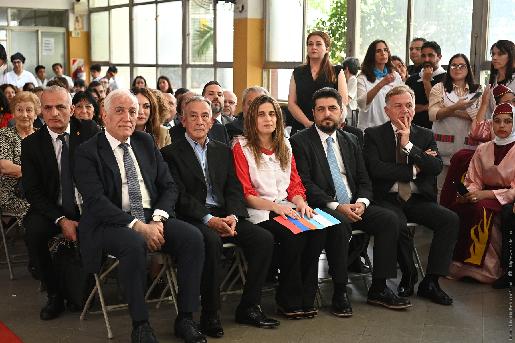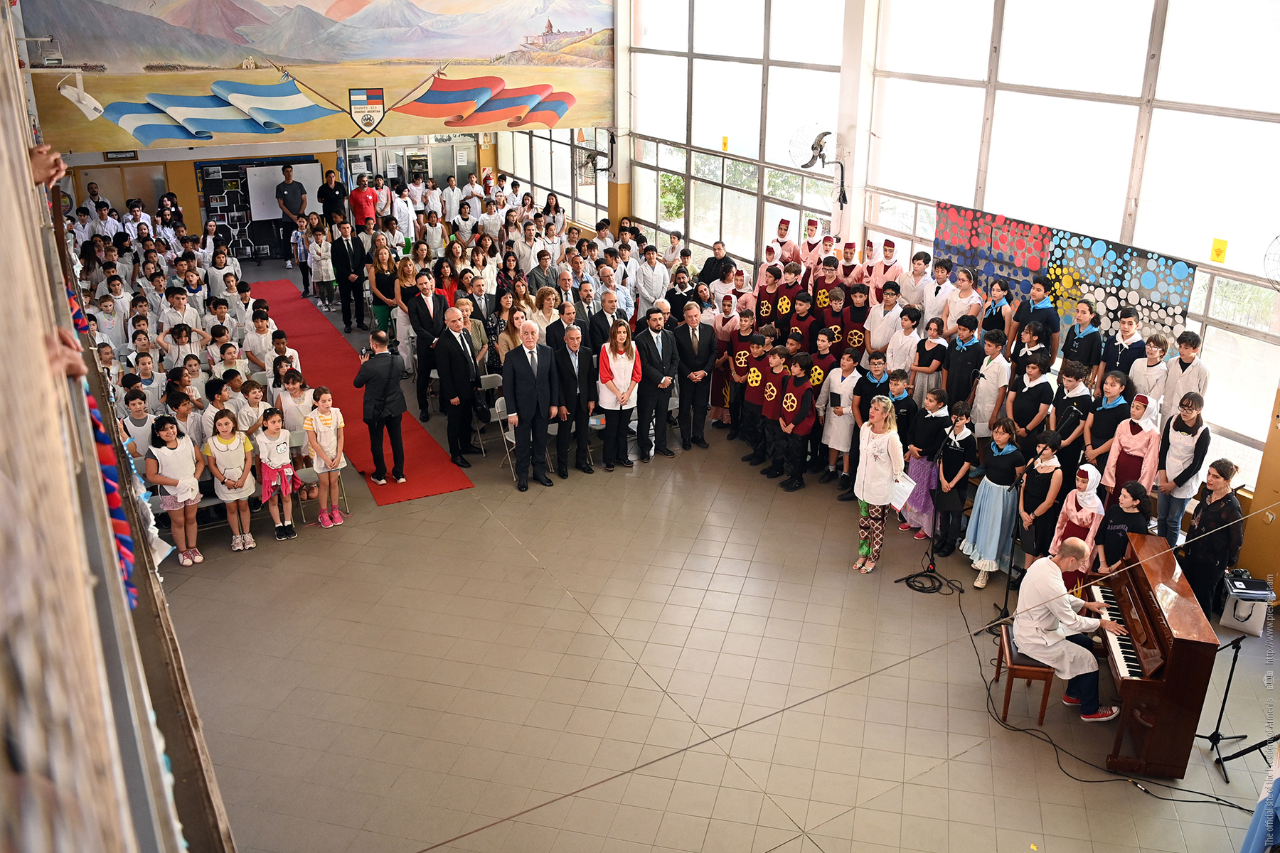 Le président de la République d'Arménie a été accueilli par la directrice de l'école, Soledad Strong, et le représentant du ministère de la culture de Buenos Aires. En l'honneur de la visite du président arménien à l'école, le personnel enseignant et les étudiants du complexe ont préparé un programme culturel arméno-argentin comprenant des danses nationales, de la musique et des traditions des deux pays.