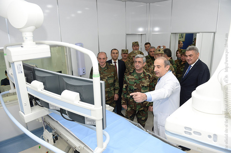 Աշխատանքային այցի ավարտին Նախագահ Սերժ Սարգսյանը Ստեփանակերտի հանրապետական բժշկական կենտրոնում ներկա է գտնվել անգիոգրաֆիկ կենտրոնի բացմանը: Բժշկական այս կենտրոնում կատարվելու են սրտի և մնացած բոլոր օրգանների անոթների ստենտավորումները, ախտորոշվելու և բուժվելու են անոթային խնդիրներ ունեցողները:
