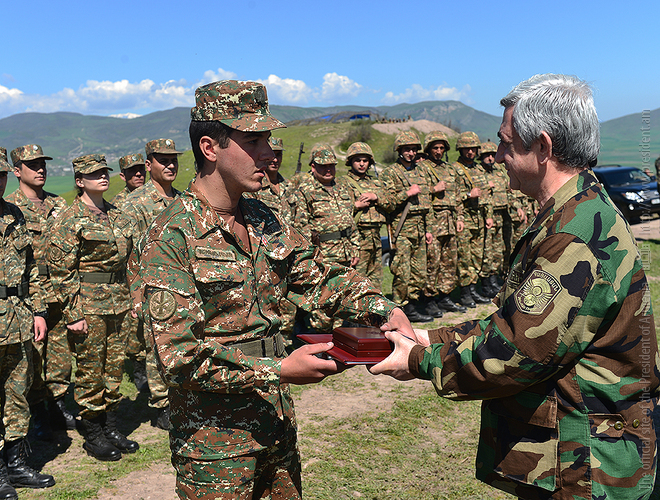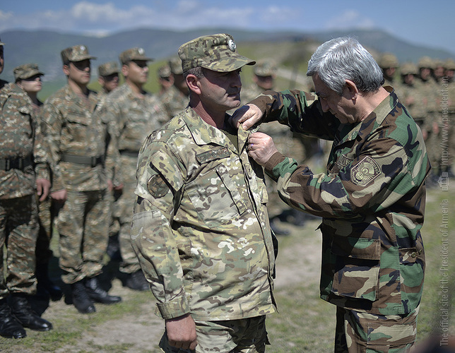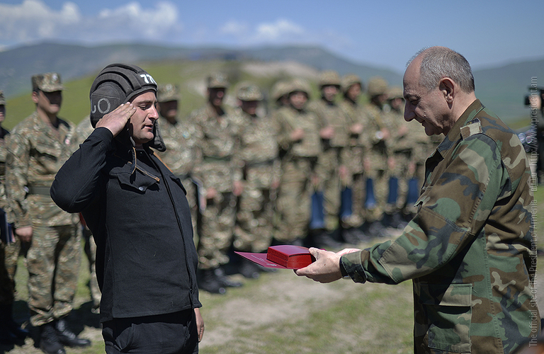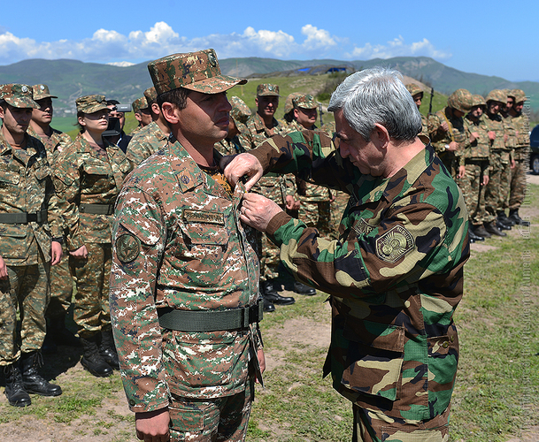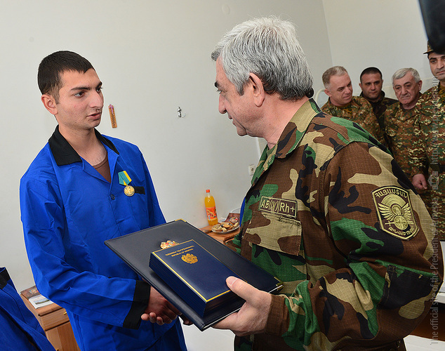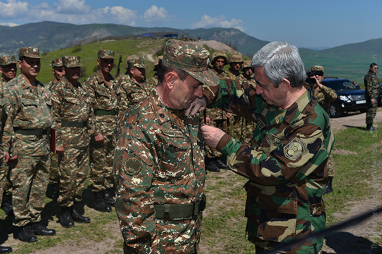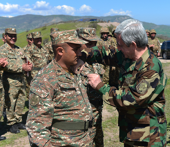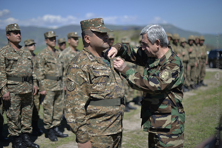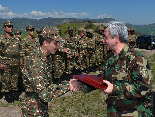 ՀՀ Նախագահ Սերժ Սարգսյանը և ԼՂՀ Նախագահ Բակո Սահակյանը Լեռնային Ղարաբաղի Հանրապետությունում ապրիլի 19-ին այցելել են Պաշտպանության բանակի զորամասերից մեկը և ապրիլի 2-5-ը ընկած ժամանակահատվածում հակառակորդի սանձազերծած ռազմական գործողությունների ընթացքում ԼՂՀ պետական սահմանը պաշտպանելիս ցուցաբերած արիության ու խիզախության համար պետական պարգևներ հանձնել մի խումբ զինծառայողների: