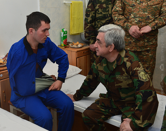 Հայկական երկու հանրապետությունների նախագահներն այնուհետև այցելել են Ստեփանակերտի կենտրոնական զինվորական հոսպիտալ, որտեղ բուժում է ստանում Արիության մեդալով պարգևատրված ժամկետային զինծառայող, կրտսեր սերժանտ Վրեժ Վալերիի Բզնունին: ՀՀ Նախագահը զինծառայողին հանձնել է պետական բարձր պարգևը, շնորհակալություն հայտնել և մաղթել նրան շուտափույթ ապաքինում: Նախագահներ Սերժ Սարգսյանը և Բակո Սահակյանը զինվորական հոսպիտալում այցելել են նաև բուժում ստացող մյուս զինծառայողներին: