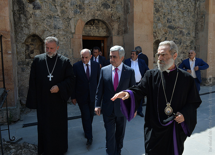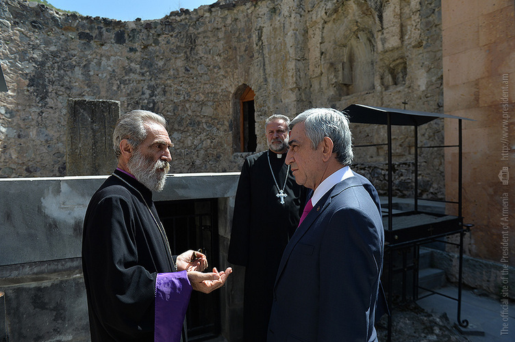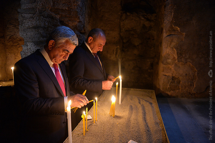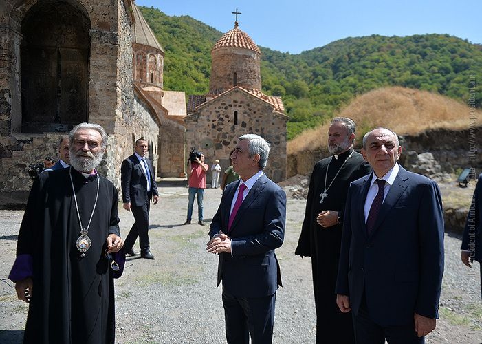 Նախագահներ Սերժ Սարգսյանը և Բակո Սահակյանը Արցախի թեմի առաջնորդ գերաշնորհ Պարգև Սրբազանի հետ այցելել են նաև Դադիվանք՝ ծանոթացել վանական համալիրում իրականացվող վերականգնողական աշխատանքների ընթացքին և մոմ վառել Դադիվանքի Սբ. Աստվածածին Կաթողիկե եկեղեցում: