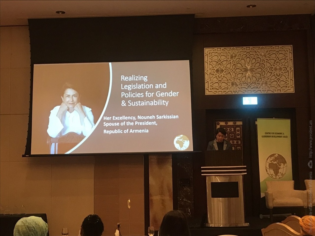 Տիկին Նունե Սարգսյանը գագաթնաժողովին հանդես է եկել որպես բանախոս: Նա իր ելույթում մասնավորապես անդրադարձել է Հայաստանում կանանց տնտեսական ակտվությանը, ղեկավարման գործընթացներին նրանց մասնակցությանը, ինչպես նաև քաղաքական դաշտում դերակատարության ավելացմանը, կանանց հանդեպ բռնության դրսևորումների դեմ պայքարի իրավական կարգավորման ոլորտում իրականացվող աշխատանքներին: