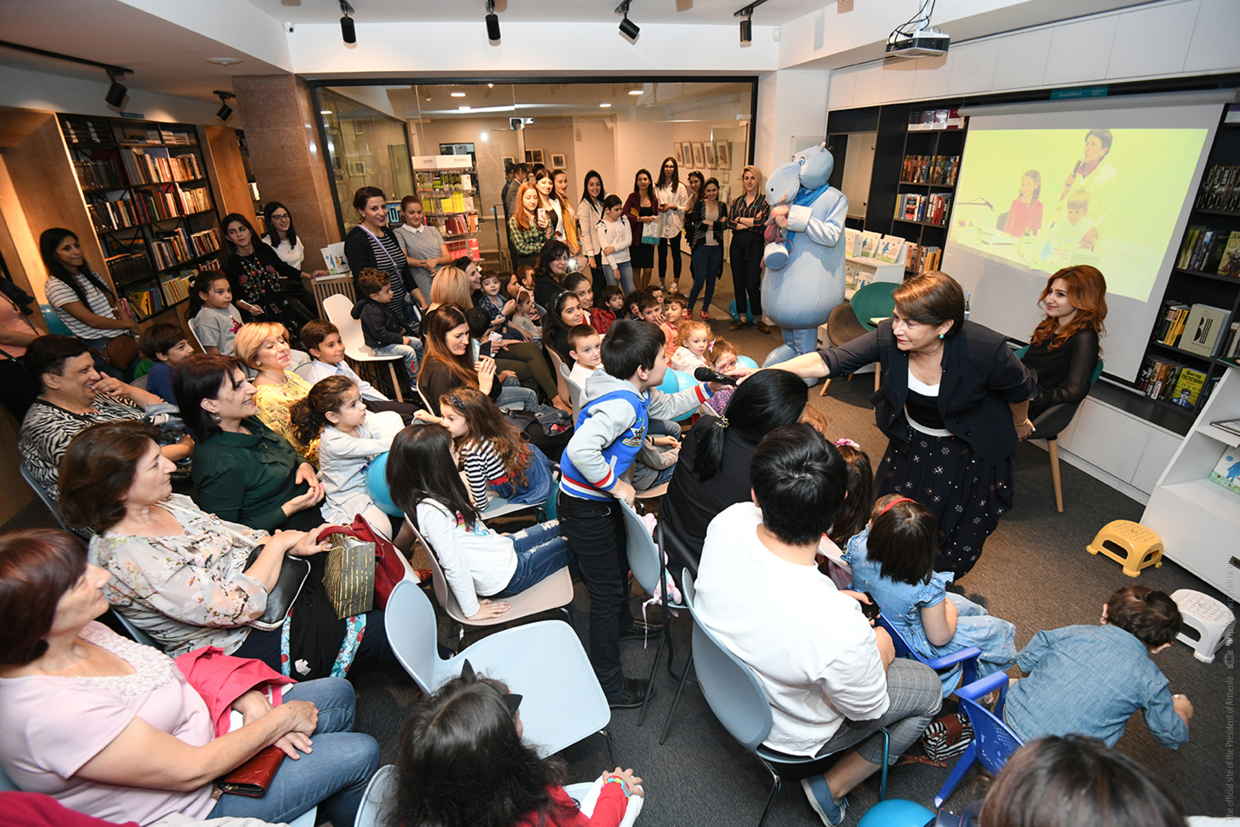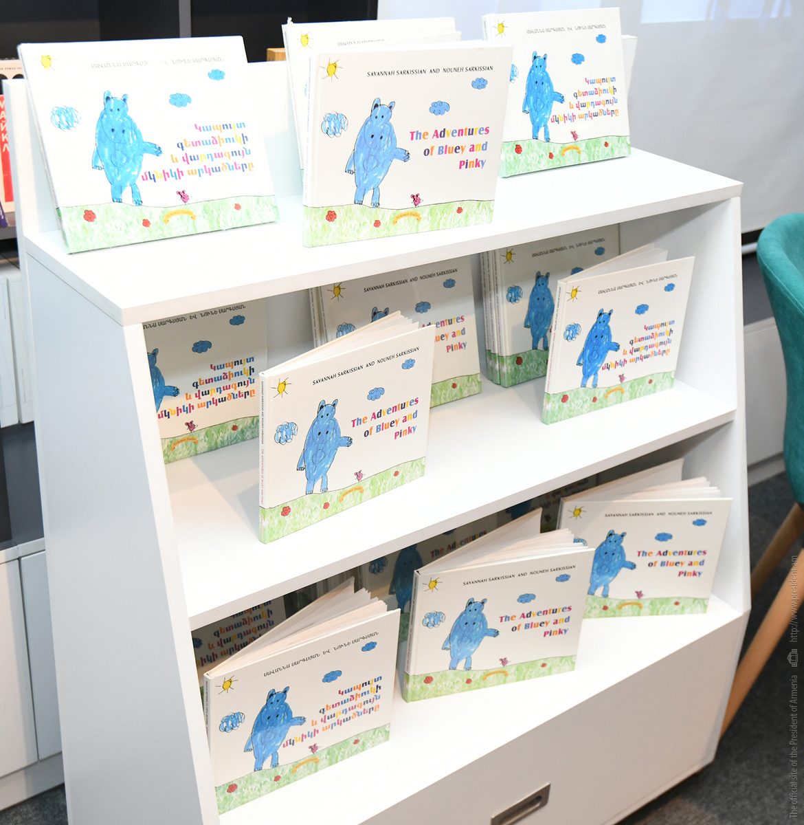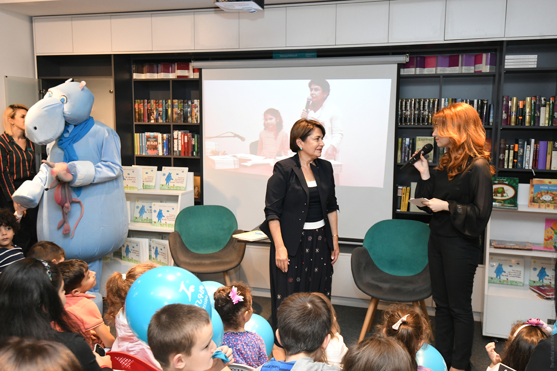 Հանրապետության նախագահի տիկին Նունե Սարգսյանը «Զանգակ» գրատան «Աբովյան» մասնաճյուղում փոքրիկ ընթերցողներին և նրանց ծնողներին է ներկայացրել իր և թոռնուհու՝ Սավաննայի հեղինակած «Կապույտ գետաձիուկի և վարդագույն մկնիկի արկածները» գրքի հայերեն տարբերակը։