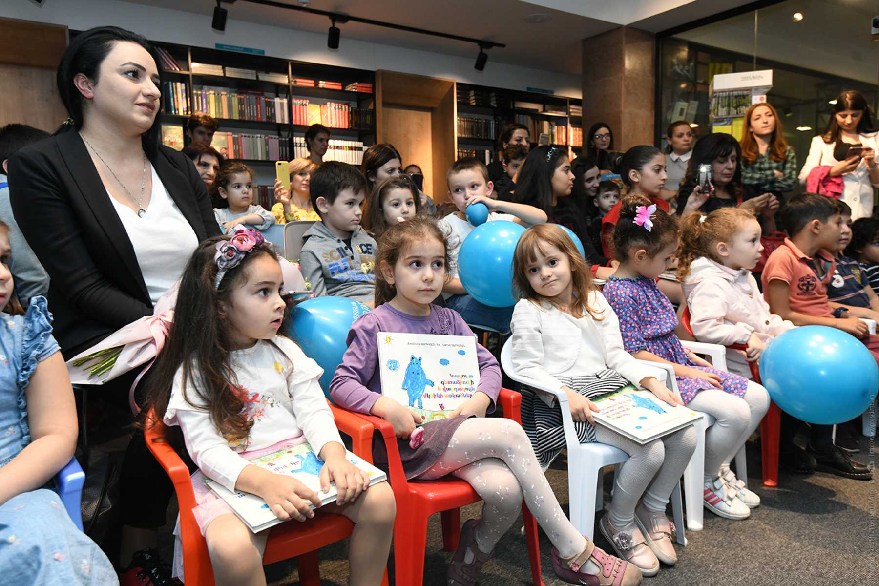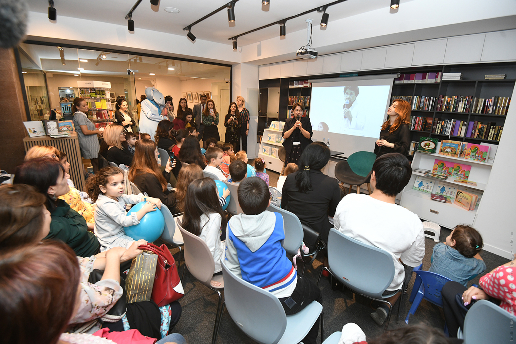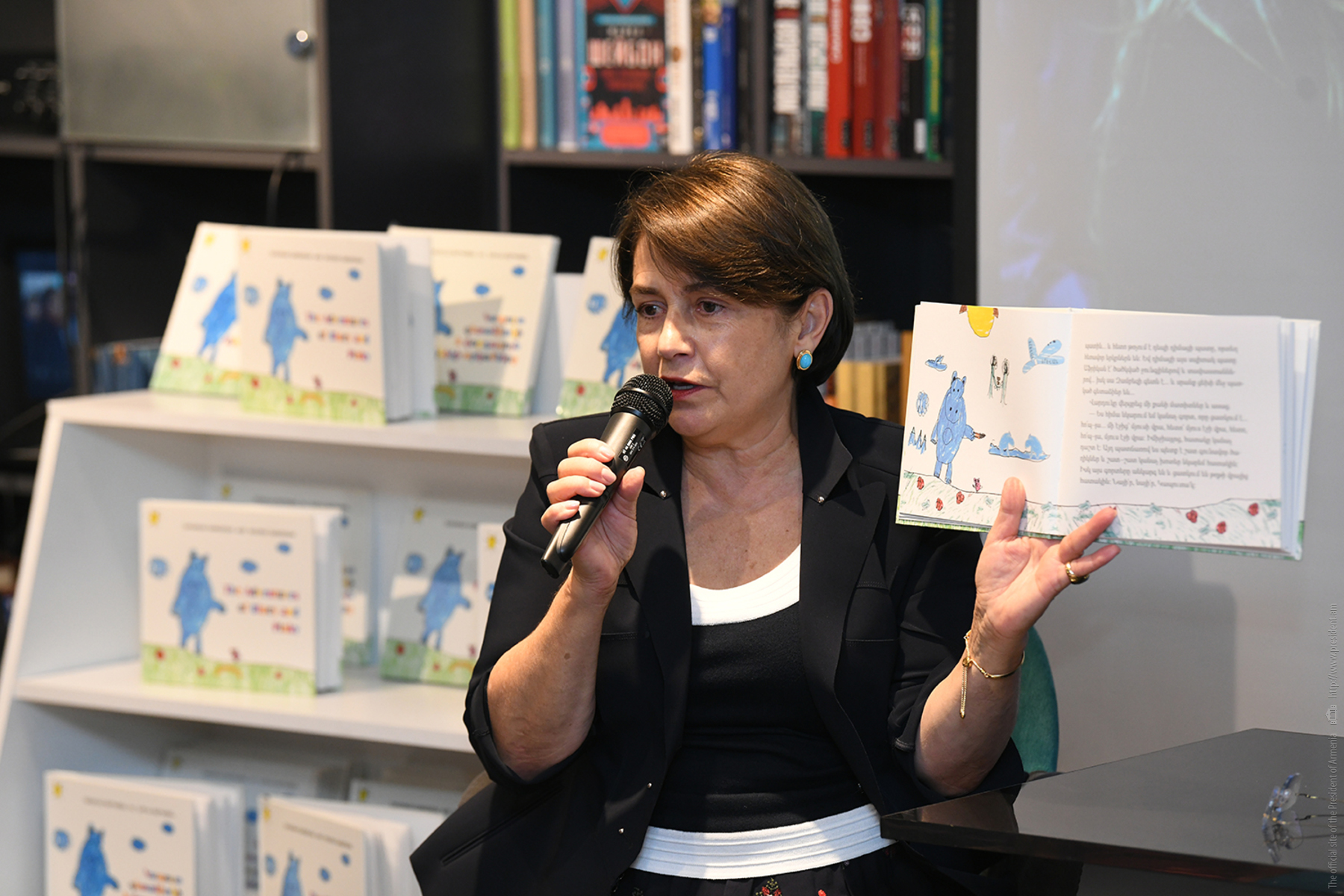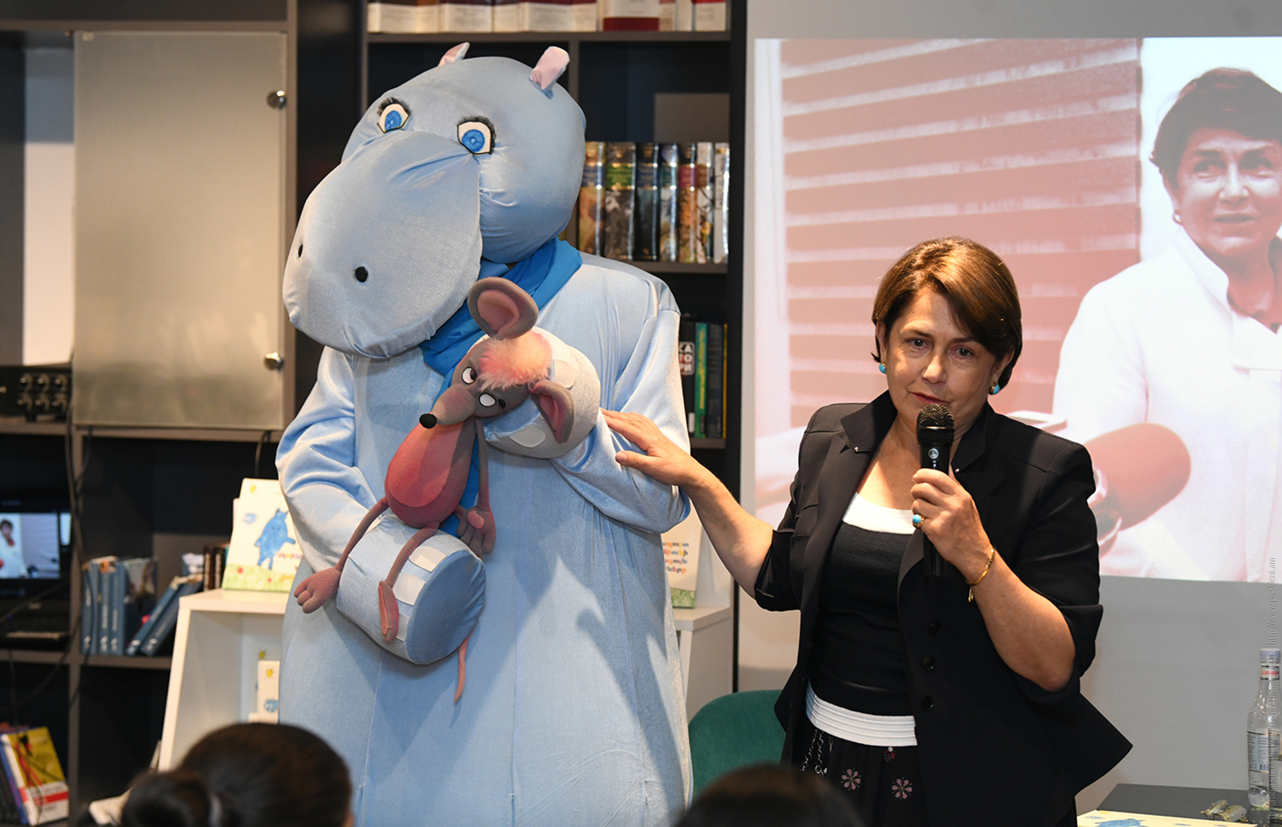 Հանրապետության նախագահի տիկին Նունե Սարգսյանը «Զանգակ» գրատան «Աբովյան» մասնաճյուղում փոքրիկ ընթերցողներին և նրանց ծնողներին է ներկայացրել իր և թոռնուհու՝ Սավաննայի հեղինակած «Կապույտ գետաձիուկի և վարդագույն մկնիկի արկածները» գրքի հայերեն տարբերակը։