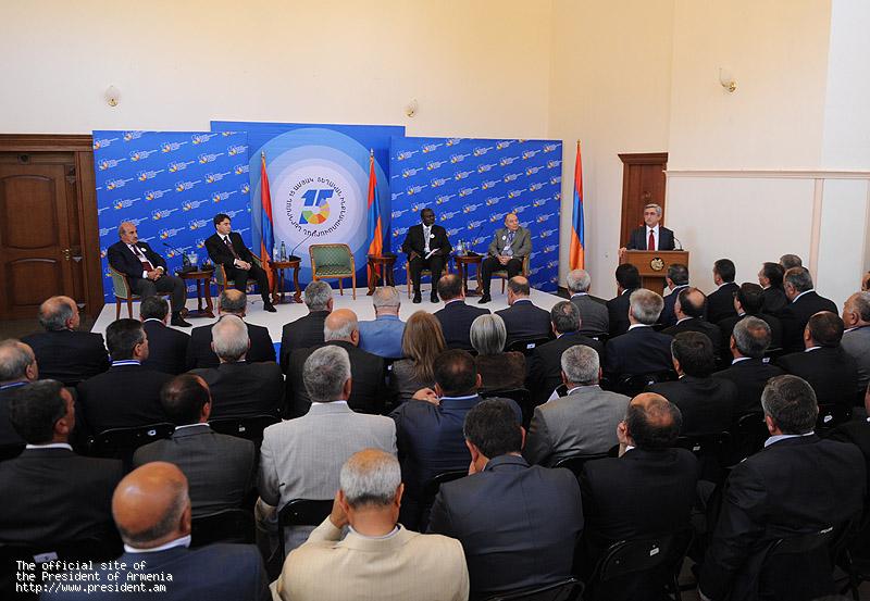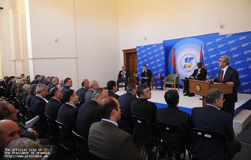 Նախագահը շնորհավորել է համաժողովի մասնակիցներին ՏԻՄ 15-ամյակի առթիվ, ողջունել համաժողովի անցկացումը, որը, Հանրապետության ղեկավարի խոսքով, թույլ է տալիս ուշադրությունը կենտրոնացնել գյուղի և նրա հիմնախնդիրների վրա, համատեղ քննարկել առկա հարցերը: Սերժ Սարգսյանն ընդգծել է, որ պետության համար շարունակում է առաջնային մնալ տարածքների համաչափ զարգացման ապահովումը: Այդ նպատակով մշակվել է ՀՀ տարածքների զարգացման հայեցակարգը, որը թույլ է տալու այս կամ այն ծրագրի իրականացումը դիտարկել տարածքների համաչափ զարգացման տեսանկյունից: Նախագահի խոսքով, համաչափ զարգացումը բազմաթիվ այլ ուղղությունների շարքում ենթադրում է նաև անհրաժեշտ ենթակառուցվածքների և արդյունավետ գյուղատնտեսության զարգացում: «Ուզում եմ մեկ անգամ ևս շեշտել, որ այս տարի մեր պետության և ժողովրդի համար շատ կարևոր հոբելյաններ ենք նշում: Մեր անկախության 20-ամյակի տարում լրանում են նաև պետության կարևորագույն ինստիտուտների հոբելյանները, և դրանց թվում ցանկանում եմ առանձնացնել մեր տեղական ինքնակառավարման համակարգի 15-ամյա հոբելյանը: Կարծում եմ, իր նշանակությամբ այն մեր պետության ամենակարևոր հաստատություններից մեկն է: