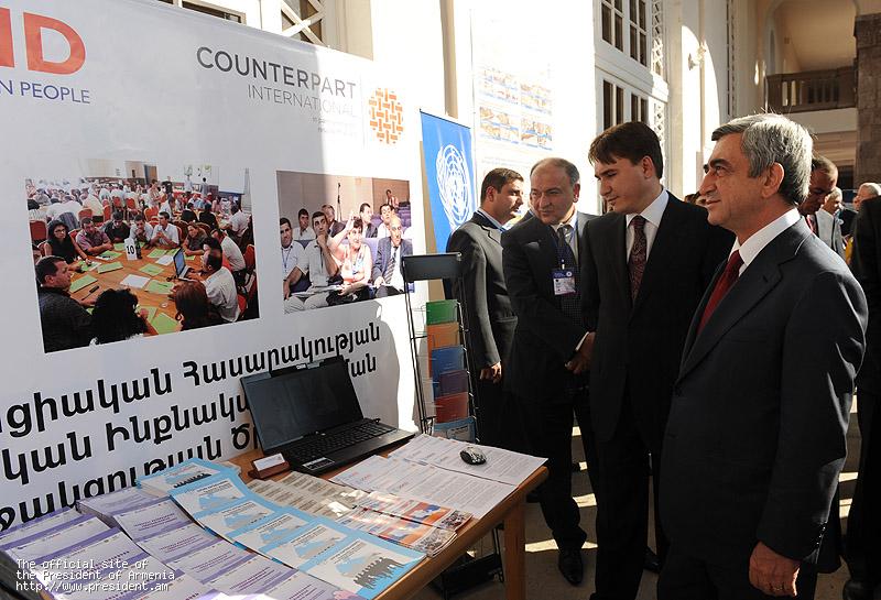 Ջերմուկում Սերժ Սարգսյանն այցելել է նաև համաժողովի շրջանակներում կազմակերպված ցուցահանդես` նվիրված Հանրապետության մարզերում և համայնքներում անցած 20 տարիներին ծրագրեր իրականացրած միջազգային կազմակերպությունների գործունեության արդյունքներին ու ձեռքբերումներին: