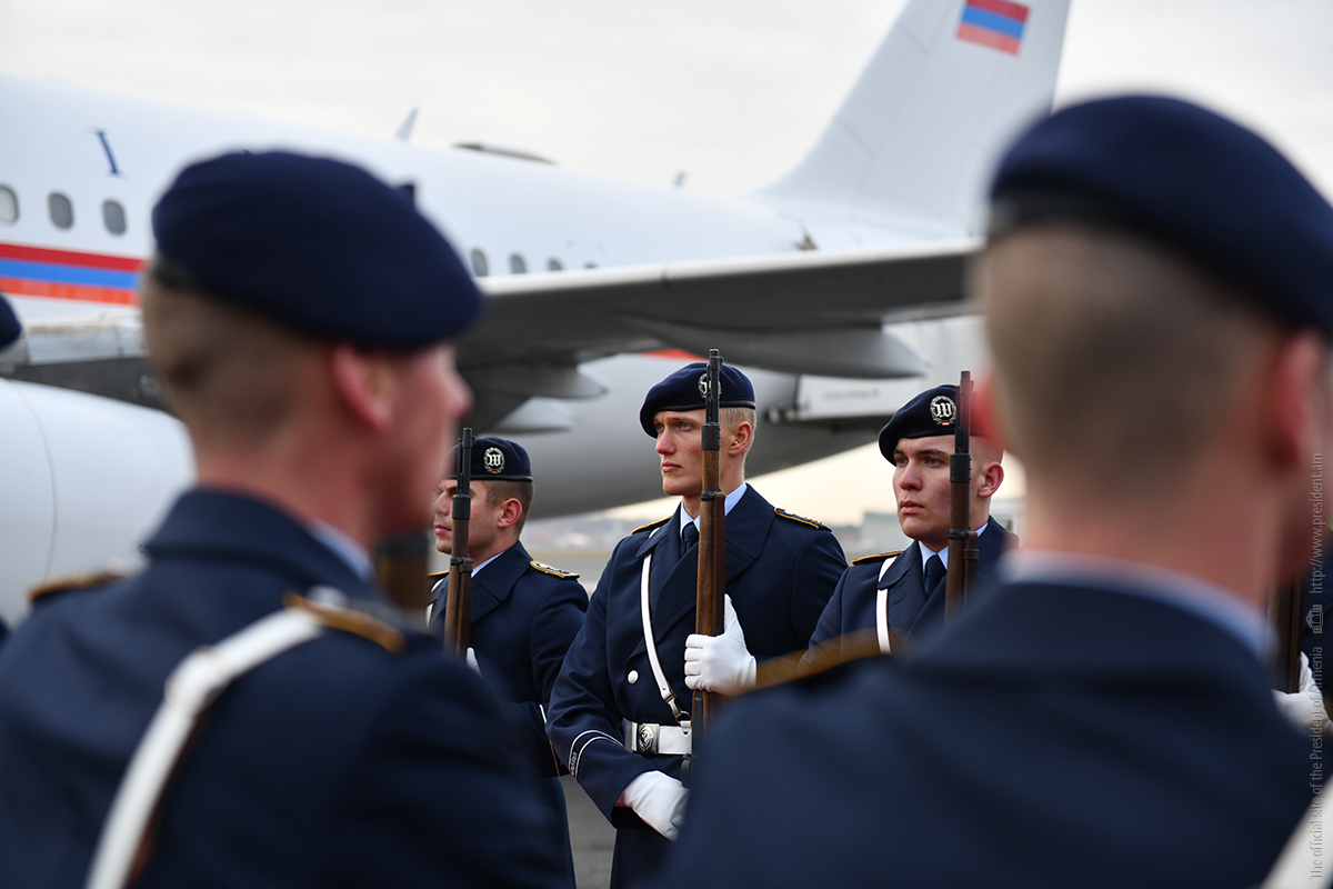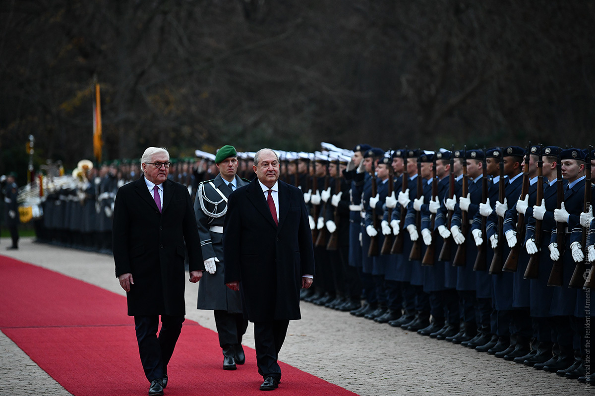 Զինվորական նվագախմբի կատարմամբ հնչել են Հայաստանի և Գերմանիայի պետական օրհներգերը, նախագահներն ընդունել են պատվո պահակային վաշտի ողջույնը։
