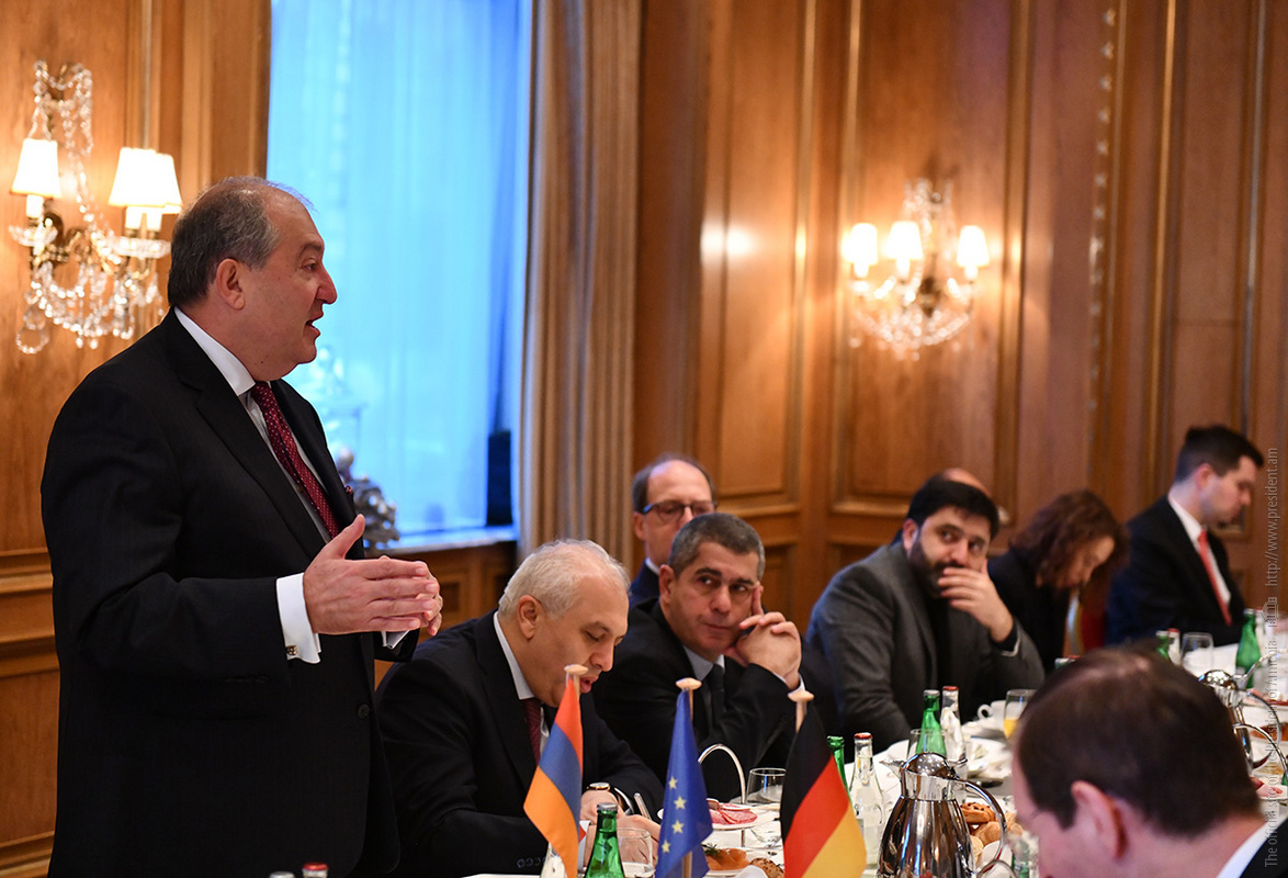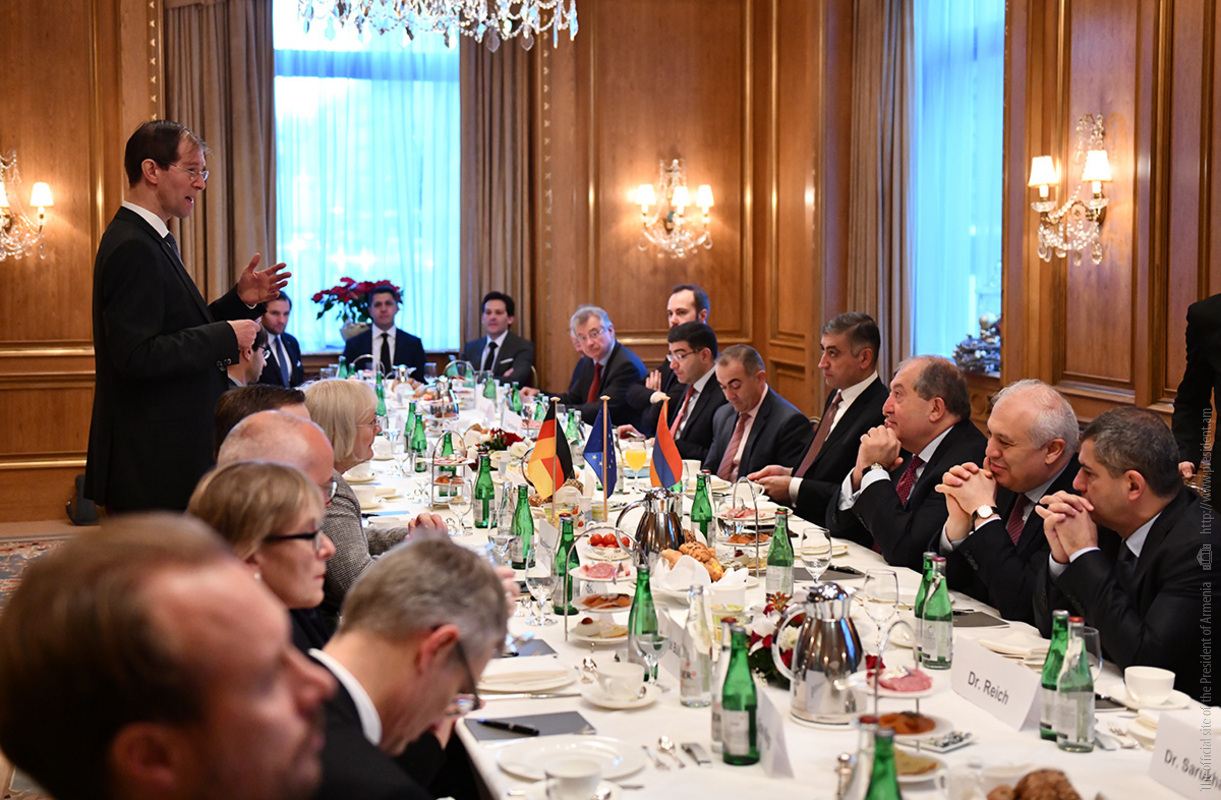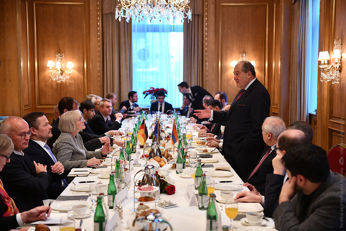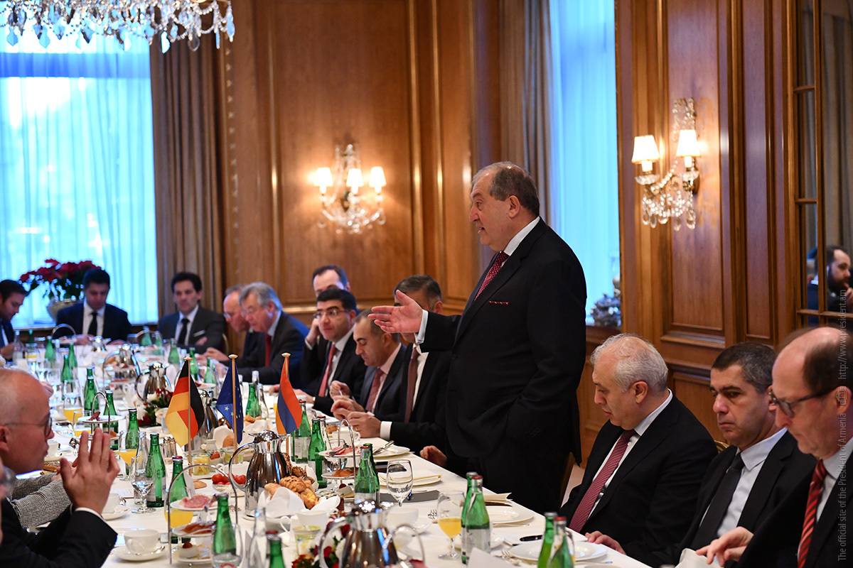 Պաշտոնական այցով Գերմանիայի Դաշնային Հանրապետությունում գտնվող նախագահ Արմեն Սարգսյանը նոյեմբերի 28-ին աշխատանքային նախաճաշ է ունեցել գերմանական մի շարք առաջատար ընկերությունների ղեկավարների հետ, որոնք գործունեություն են ծավալում Հայաստանում կամ հետաքրքրված են Հայաստանի հետ համագործակցությամբ: Հանդիպումը կազմակերպվել է Գերմանիայում ՀՀ դեսպանության, OWC հրատարակչության, Գերմանիայի տնտեսության Արևելյան հանձնաժողովի ու «Արևելյան Եվրոպա. մանր ու միջին տնտեսվարողների միության» կողմից։