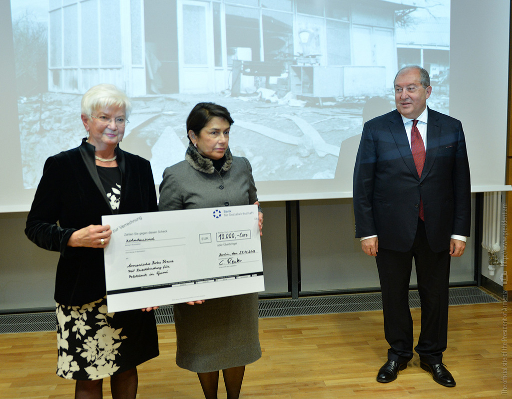 Միջոցառման ավարտին Գերմանական Կարմիր խաչի նախագահ Գերդա Հասսելֆելդթը Հայաստանի նախագահի տիկնոջը՝ Նունե Սարգսյանին է հանձնել Գյումրիի «Բեռլին» պոլիկլինիկայի վերանորոգման աշխատանքների համար նախատեսված 10 հազար եվրո գումարի նվիրատվության կտրոնը: