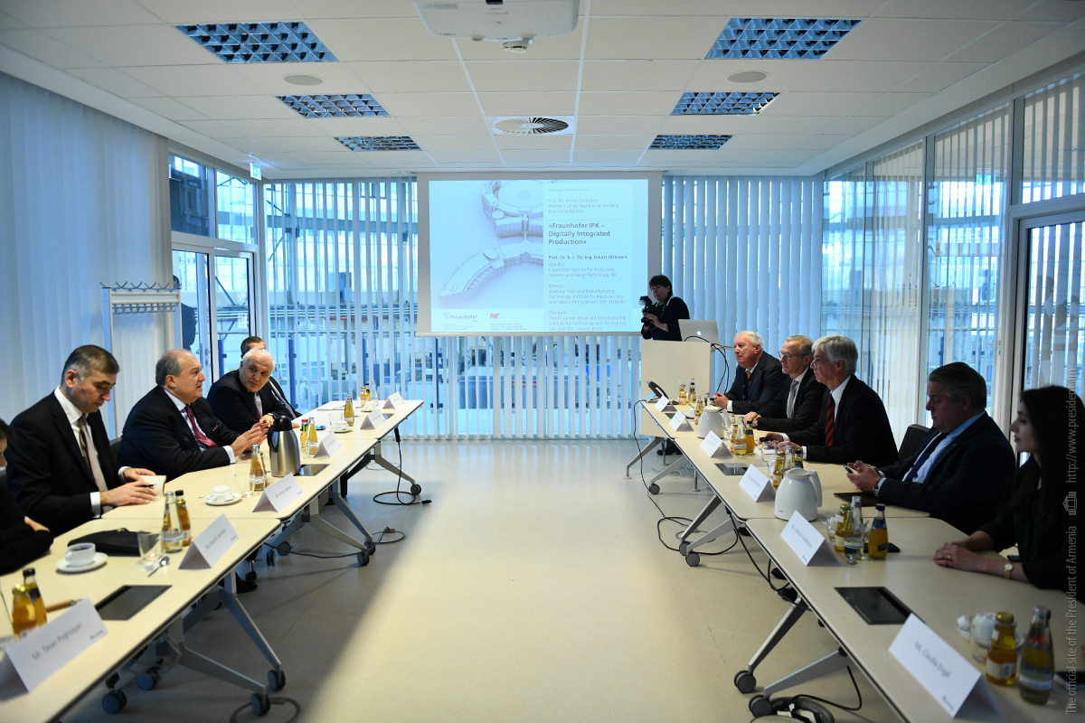 Հանրապետության նախագահ Արմեն Սարգսյանը տիկնոջ՝ Նունե Սարգսյանի հետ այցելել է գերմանական «Ֆրաունհոֆեր» արտադրական համակարգերի և նախագծային տեխնոլոգիաների ինստիտուտ (Fraunhofer IPK), որը մասնագիտացած է արտադրական գործընթացների ողջ սպեկտրի համար տեխնոլոգիական նորարար լուծումների մշակման ոլորտում: Ինստիտուտը նաև նորարարական գաղափարների զարգացմանն ուղղված հետազոտական ծրագրեր է իրականացնում: «Ֆրաունհոֆեր» ինստիտուտը յոթ տասնյակից ավելի գիտահետազոտական կենտրոններ ունի և գործունեություն է ծավալում աշխարհի մի շարք երկրներում։