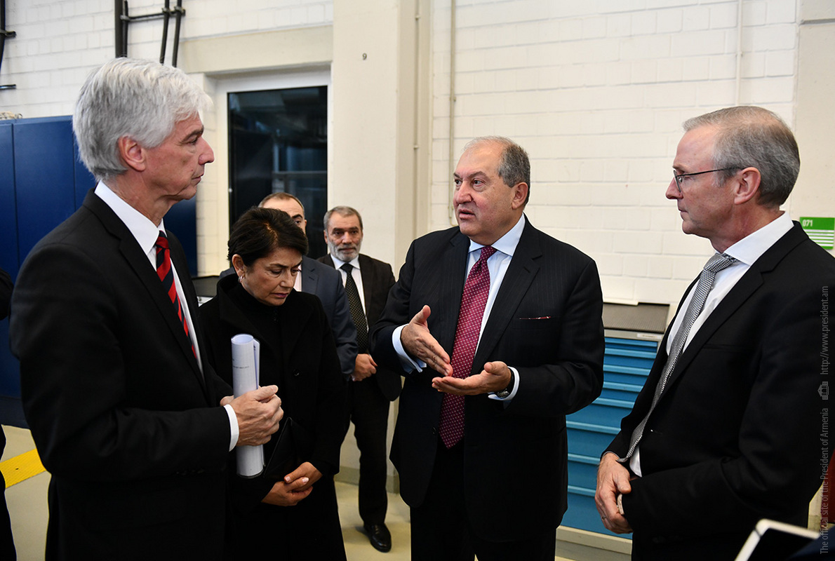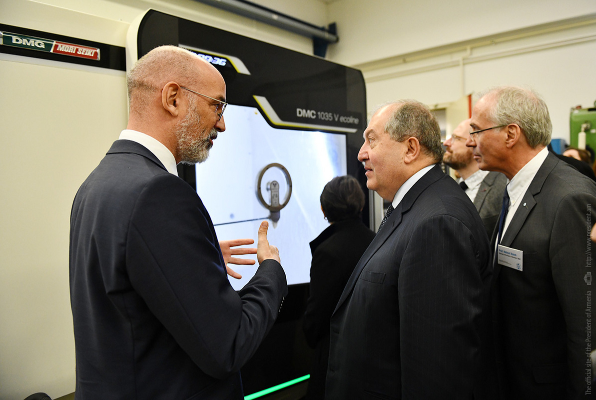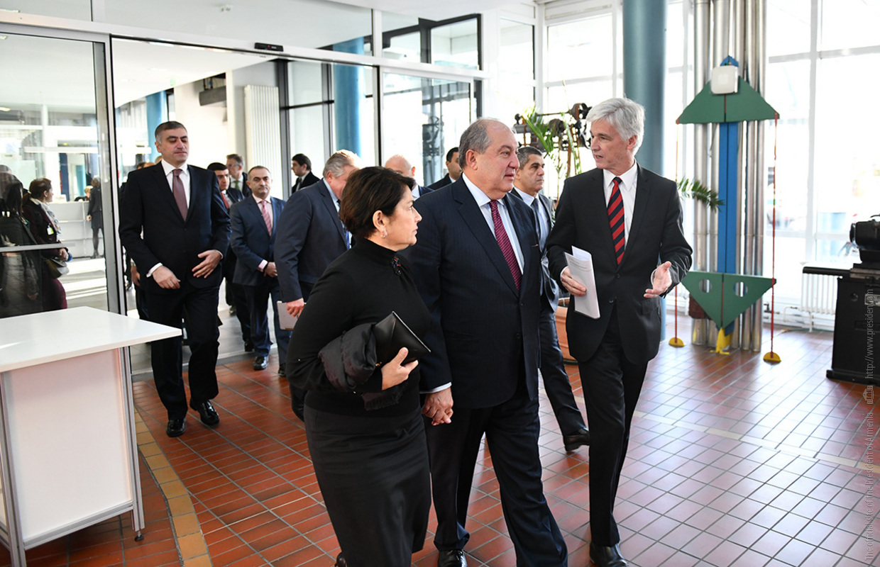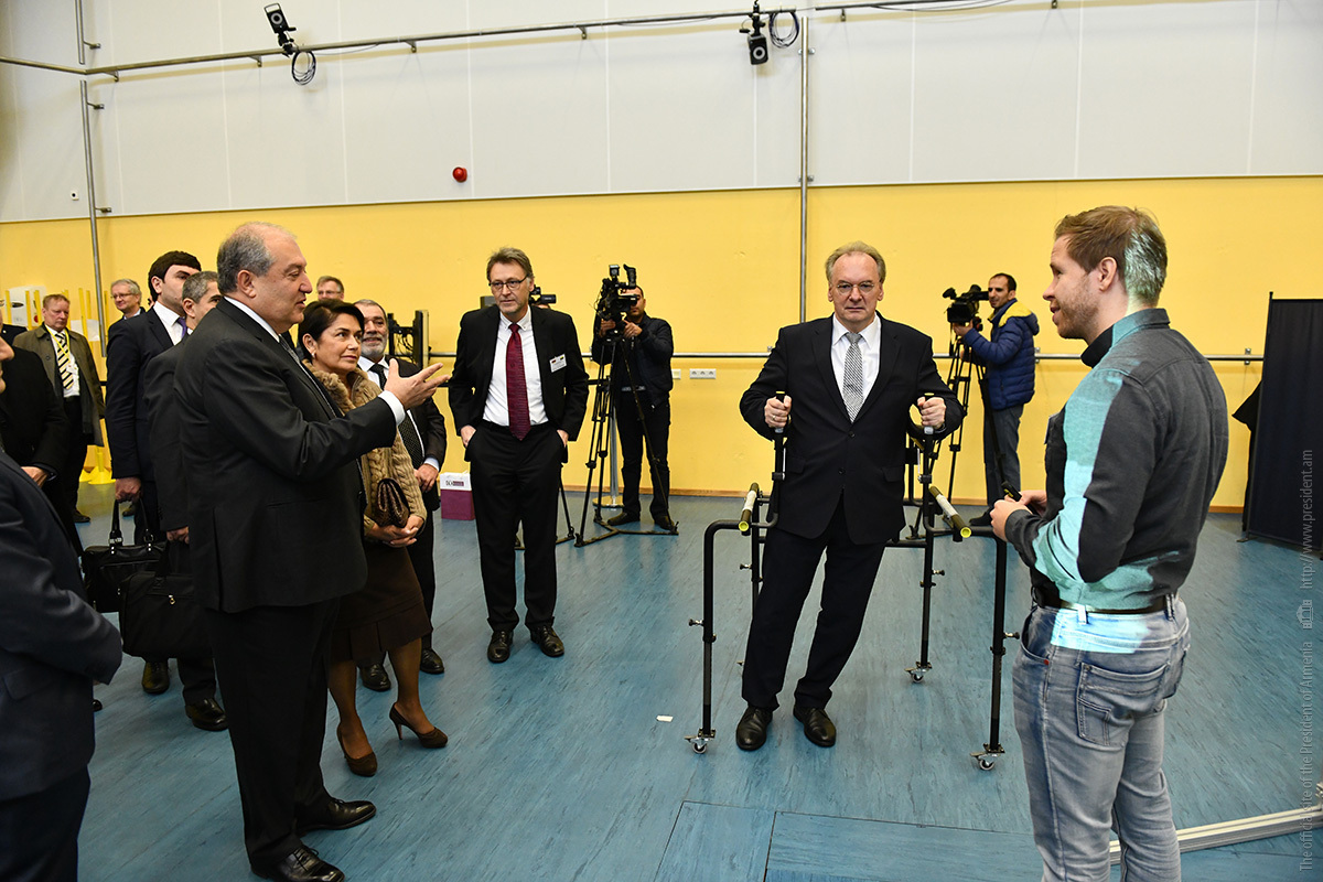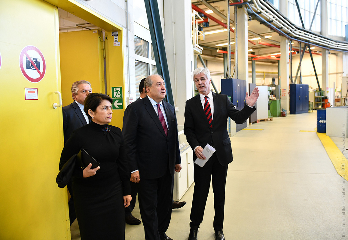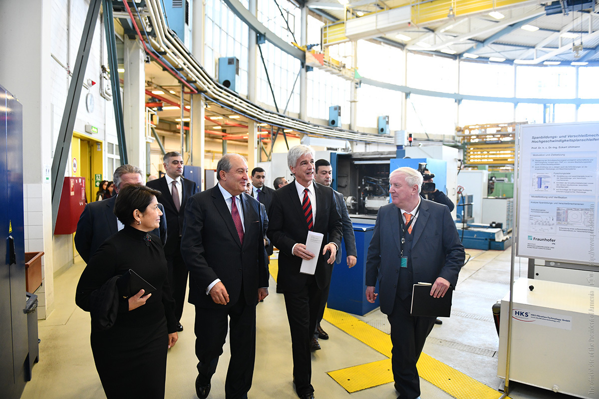 Ինստիտուտի տնօրեն Էքարթ Ուհլմանի ուղեկցությամբ նախագահ Արմեն Սարգսյանն ու տիկին Նունե Սարգսյանը շրջել են հաստատության «Արտադրական տեխնոլոգիաներ» փորձարարական սրահում, ծանոթացել ինստիտուտի գործունեությանը։