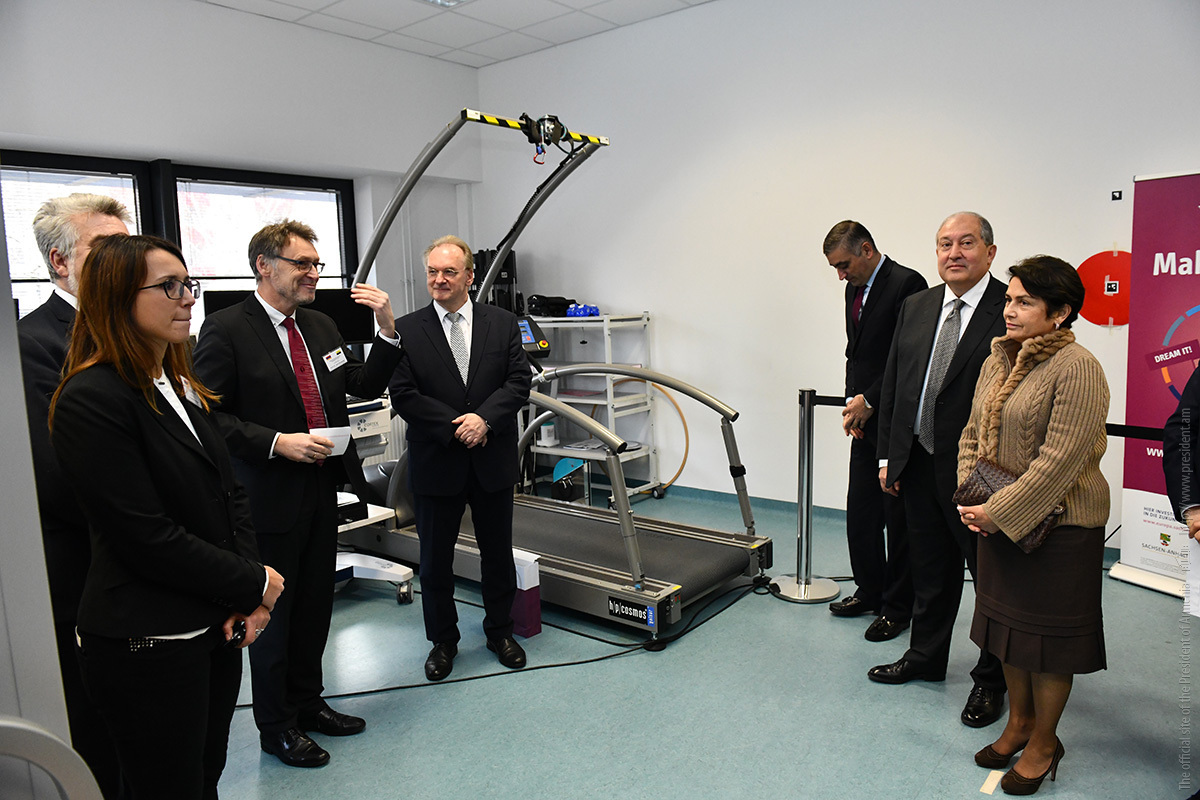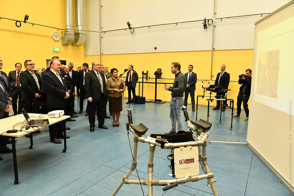 Ռեկտոր Յենս Շթրաքելիանի ուղեկցությամբ նախագահը շրջել է համալսարանի սպորտային գիտահետազոտական մասնաշենքում, ծանոթացել լաբորատորիաների գործունեությանը, որտեղ ուսանողներն ու գիտաշխատողներն զբաղվում են սահմանափակ կարողություններով անձանց համար սարքավորումների մշակմամբ։