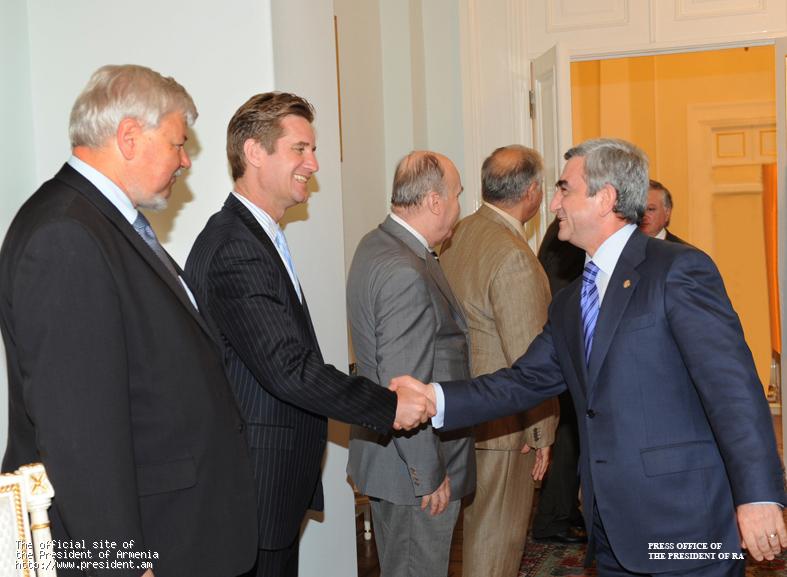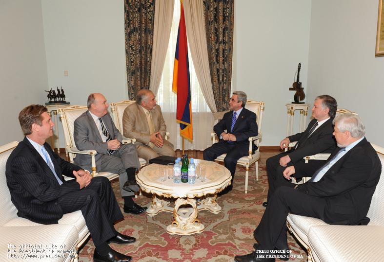 Նախագահ Սերժ Սարգսյանն այսօր ընդունել է տարածաշրջանային այցելության շրջանակում Երեւան ժամանած ԵԱՀԿ Մինսկի խմբի համանախագահներ Յուրի Մերզլյակովին (Ռուսաստան), Բեռնար Ֆասիեին (Ֆրանսիա), Մեթյու Բրայզային (ԱՄՆ) եւ ԵԱՀԿ գործող նախագահի անձնական ներկայացուցիչ Անջեյ Կասպրչիկին: Հանդիպմանը մասնակցել է նաեւ Հայաստանի արտաքին քաղաքական գերատեսչության ղեկավար Էդվարդ Նալբանդյանը: