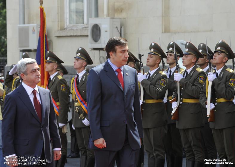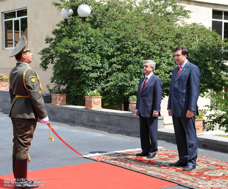 ՀՀ Նախագահի նստավայրում տեղի է ունեցել բարձրաստիճան հյուրի դիմավորման պաշտոնական արարողությունը, որին հաջորդել է Նախագահներ Սերժ Սարգսյանի եւ Միխեիլ Սաակաշվիլիի առանձնազրույցը: