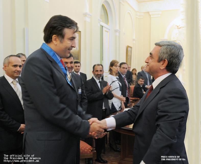 Հանդիպման ավարտին Նախագահ Սարգսյանը Միխեիլ Սաակաշվիլիին պարգեւատրել է Պատվո շքանշանով, որը օտարերկրյա քաղաքացիներին տրվող Հայաստանի բարձրագույն պետական պարգեւն է եւ, որին Վրաստանի Նախագահն արժանացել է ՀՀ նախագահի հունիսի 24-ի հրամանագրով` հայ-վրացական դարավոր բարեկամության ամրապնդման, Հայաստանի եւ Վրաստանի համագործակցության խորացմանն ուղղված գործունեության համար: