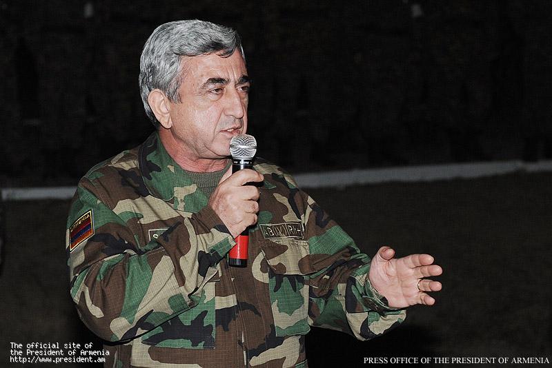 Եվ որպեսզի այս խնդիրը լուծվի, պարոնա՛յք զինվորներ և սպաներ, դուք մշտապես պետք է կարողանաք ավելի բարձր լինել, լինել ավելի մարտունակ, ձեր զենքը պետք է ավելի շուտ խոցի, ձեր կամքը պետք է գերակայի, ձեր նվիրվածությունը սահման չպետք է ունենա: Ես վստահ եմ, որ եթե հանկարծ գա ժամը, մենք կարողանալու ենք ոչ թե կրկնել այն, ինչ տեղի ունեցավ 1992-94 թվականներին, այլև վերջնականապես խնդիրը լուծելու ենք, վերջնականապես հարցը փակվելու է: Ի՞նչ պետք է անենք, որպեսզի կարողանանք հասնել մեր նպատակին: Մենք պետք է միշտ զգոն լինենք, միշտ պետք է պատրաստ լինենք: Եվ որևէ մեկը չպետք է կասկածի ձեր վճռականության վրա, ինչպես ե՛ս չեմ կասկածում, որովհետև շարունակվում են սադրանքները, կրակոցները, զոհվում են մարդիկ, և ոչ բոլորն են պատշաճ ուշադրության արժանացնում Ադրբեջանի այսպիսի պահվածքը: Ուրեմն պետք է զգոն լինենք, ուրեմն մեր զորավարժությունները, որ առավելագույնս մոտ էին մարտական իրավիճակին, պետք է զգուշացում լինեն ուրիշների համար, իսկ մեզ համար` դառնան կյանքի նորմ: Այդ զորավարժությունների ընթացքում սպաները պետք է ցուցադրեն իրենց գիտելիքները, զինվորները` իրենց կարողությունները, հրամանատարությունը պետք է մշտապես կատա¬րելագործի իր հմտությունները: Սա՛ է մեր ճանապարհը, մենք այլ ճանապարհ չունենք: Որպես Գերագույն գլխավոր հրամանատար, որպես Հանրապետության ղեկավար, սիրելի՛ զինվորներ և սպաներ, ես խոստանում եմ, որ դուք որևէ բանի կարիք չեք ունենալու: Մենք ձեռք ենք բերելու ժամանակակից միջոցներ, ինչպիսին հիմա էլ ունենք, մենք ունենալու ենք ամեն ինչ, որպեսզի կարողանանք խնայել մեզ համար ամենից թանկագինը` մեր զինվորների և սպաների կյանքը: Մեր ունեցածն ամբողջովին բավարար է, որպեսզի այսօր էլ կարողանանք պատվով կատարել մեր առջև դրված ամենակարևոր խնդիրը: