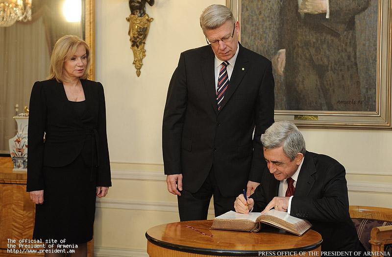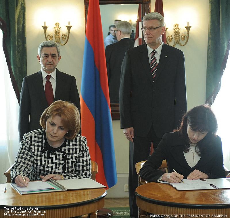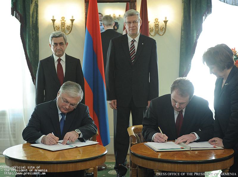 Հանդիպումից հետո տեղի է ունեցել փաստաթղթերի ստորագրման արարողություն: Մասնավորապես, ստորագրվել են Հայաստանի և Լատվիայի միջև 2011-2013թթ. մշակութային համագործակցության ծրագիր, ինչպես նաև երկու երկրների արտաքին գերատեսչությունների միջև եվրամերձեցման ոլորտում համագործակցության մասին արձանագրություն, որին հաջորդել է Հայաստանի և Լատվիայի նախագահների համատեղ մամուլի ասուլիսը: