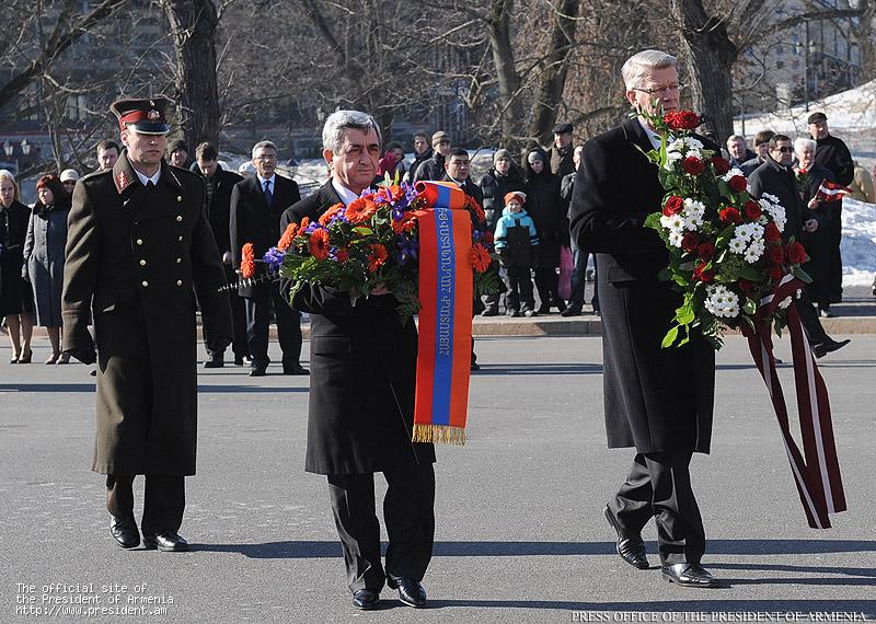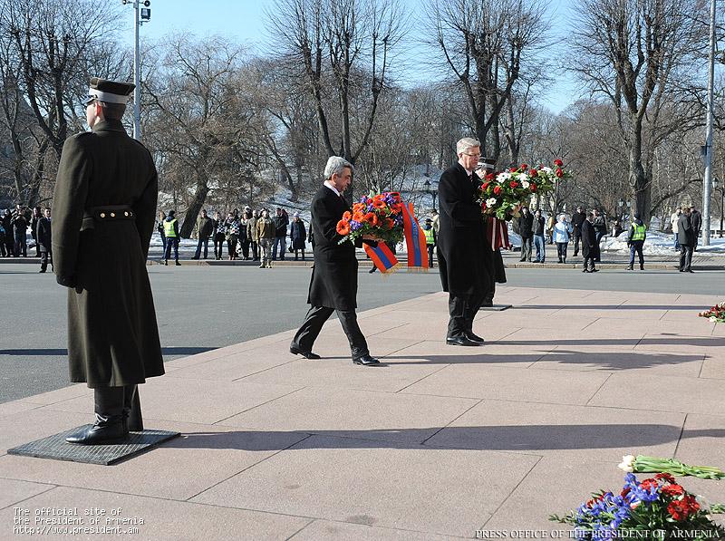 Պաշտոնական այցով Լատվիայի Հանրապետությունում գտնվող Նախագահ Սերժ Սարգսյանն այսօր Նախագահ Վալդիս Զատլերսի հետ հանդիպումից հետո ծաղկեպսակ է դրել Ազատության հուշարձանին: