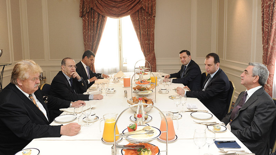 Աշխատանքային այցով Բրյուսելում գտնվող ՀՀ նախագահ, ՀՀԿ նախագահ Սերժ Սարգսյանն այսօր աշխատանքային նախաճաշ է ունեցել Եվրոպական խորհրդարանի արտաքին գործերի հանձնաժողովի նախագահ Էլմար Բրոքի և Եվրոպական խորհրդարանում Եվրոպական ժողովրդական կուսակցության (ԵԺԿ) խմբակցության փոխնախագահ Իոաննիս Կասուլիդեսի հետ: