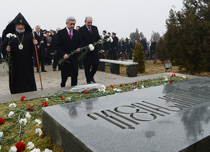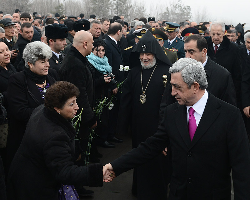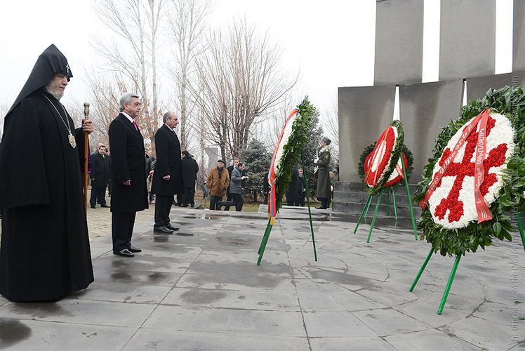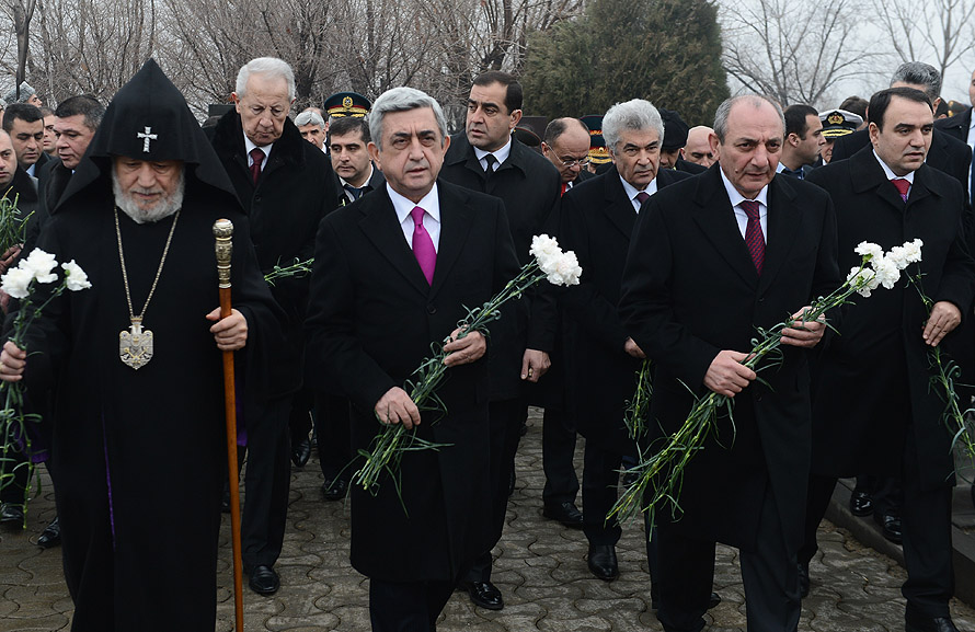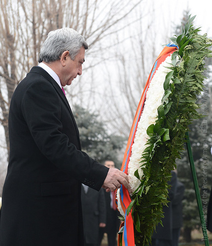 ՀՀ զինված ուժերի կազմավորման 21-րդ տարեդարձի կապակցությամբ Նախագահ Սերժ Սարգսյանը Ն.Ս.Օ.Տ.Տ. Գարեգին Բ Ամենայն Հայոց Կաթողիկոսի, ԼՂՀ նախագահ Բակո Սահակյանի հետ և Հանրապետության բարձրագույն ղեկավարության ուղեկցությամբ այսօր այցելել է «Եռաբլուր» զինվորական պանթեոն և հարգանքի տուրք մատուցել իրենց կյանքը Հայրենիքի անկախության համար զոհաբերած հայորդիների հիշատակին: