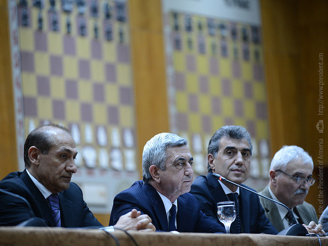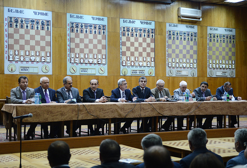 Սերժ Սարգսյանը գոհունակությամբ է արձանագրել, որ հաշվետու ժամանակաշրջանում Հայաստանի շախմատային կազմակերպությունը հասել է հսկայական նվաճումների: Դրանցից Նախագահն ընդգծել և առանձնացրել է մի քանիսը՝ 2011 թվականին Չինաստանի Նինբո քաղաքում Հայաստանի ազգային հավաքականի՝ աշխարհի չեմպիոնի տիտղոսի նվաճումը, 2012-ին Թուրքիայի Ստամբուլ քաղաքում անցկացված համաշխարհային օլիմպիադայում Հայաստանի երրորդ անգամ օլիմպիական չեմպիոն հռչակվելը: Նախագահը երախտագիտություն է հայտնել Հայաստանի հավաքականի տղաներին և բոլոր նրանց, ովքեր ինչ-որ չափով աջակցել են, որպեսզի տաղանդավոր այդ շախմատիստները կարողանան դրսևորվել: Սերժ Սարգսյանը խոսել է նաև աղջիկների շախմատի Հայաստանի հավաքականի հաջող ելույթների մասին՝ նշելով, որ, իհարկե, իրենց նվաճումներում աղջիկները դեռևս փոքր-ինչ ետ են մնում տղաներից: Նախագահը հույս է հայտնել, որ աղջիկների հավաքականին ևս կհաջողվի դառնալ չեմպիոն կամ գավաթ նվաճել: