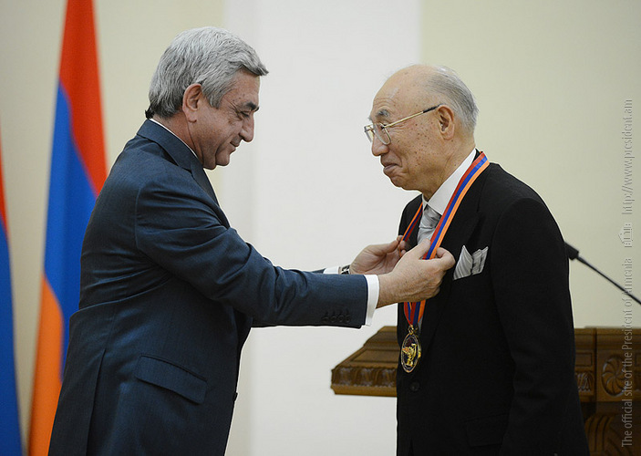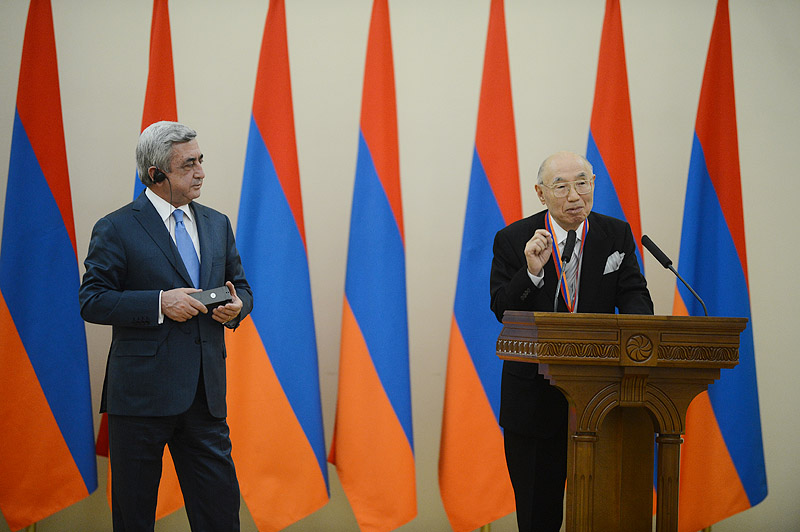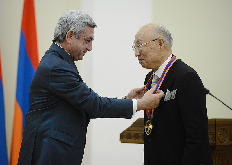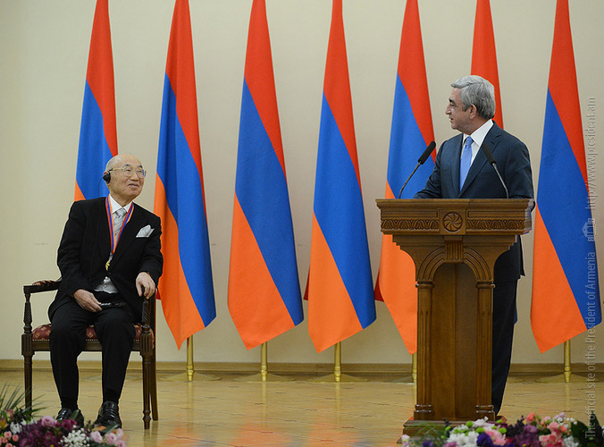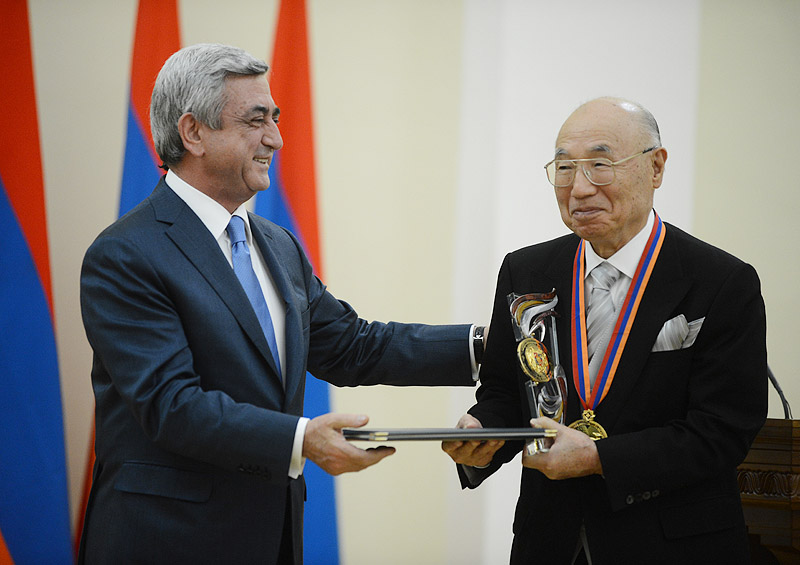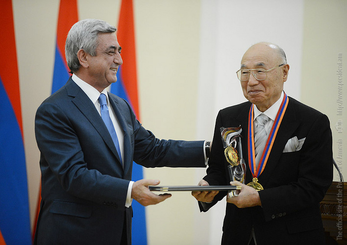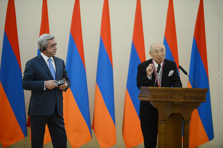 Այս մրցանակով Հայաստանի ժողովուրդը իր հիացմունքն ու երախտագիտությունն է հայտնում նրանց, ովքեր առաջ են տանում մարդկային քաղաքակրթությունը և իրենք էլ դառնում են ժամանակի յուրօրինակ խորհրդանիշներ: Այս մրցանակով մենք մեր հարգանքի տուրքն ենք մատուցում ոչ միայն պարոն Մակիմոտոյին, այլև նրա հայրենիքին` Ճապոնիային, որտեղ ապրում են խիզախ ու աշխատասեր, իմաստուն ու տաղանդավոր մարդիկ: Մենք վկան եղանք Ճապոնիայում տեղի ունեցած ահավոր երկրաշարժի, և հատկապես այն փաստի, թե ինչպիսի տոկունությամբ է ժողովուրդը կանգնում բնության տարերքի դեմ և ինչպիսի կազմակերպվածությամբ ու համախմբվածությամբ է բուժում իր վերքերը: Բազում երկրաշարժեր տեսած մեր երկրի ու ժողովրդի համար դա իսկական դաս էր: